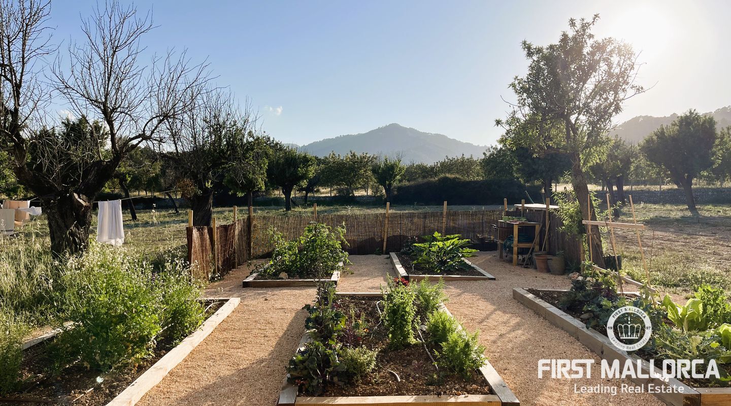 Guest rooms open directly onto the fruit garden, while the surrounding 17,000 m² plot includes mature almond trees, a vegetable garden, and fruit trees providing fresh seasonal produce.