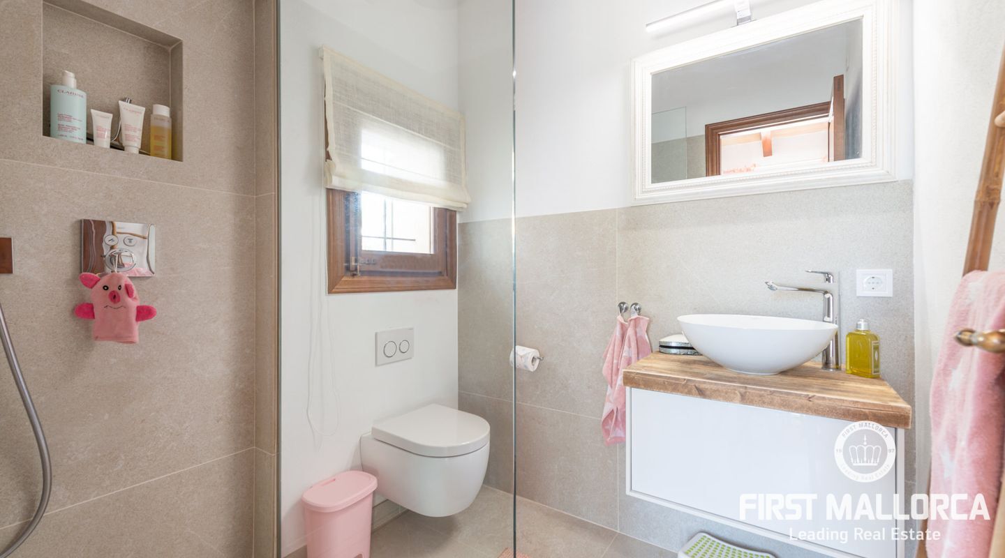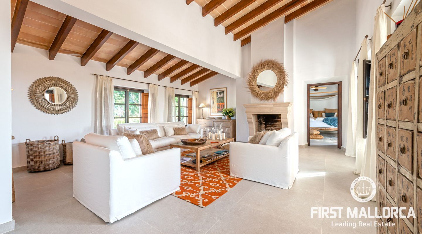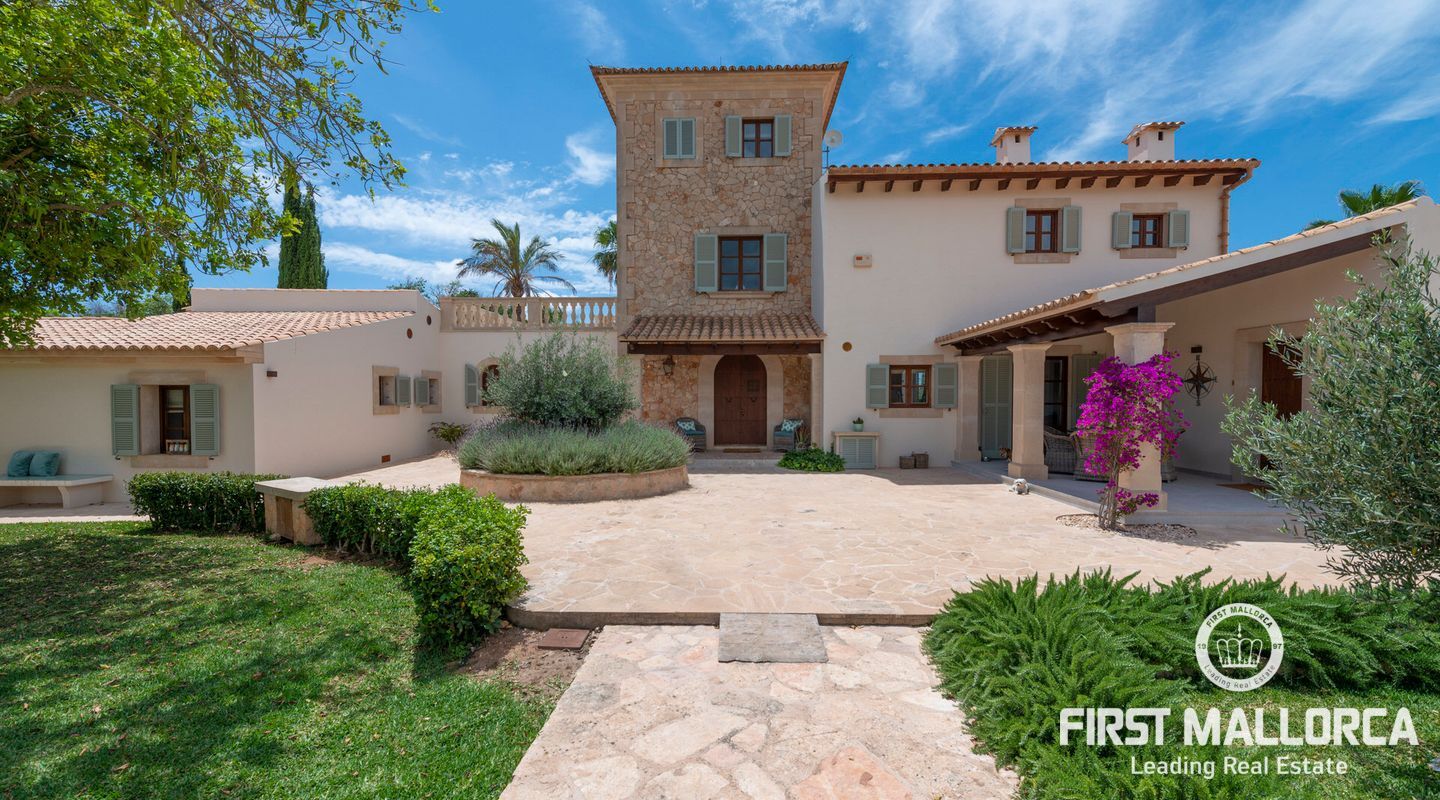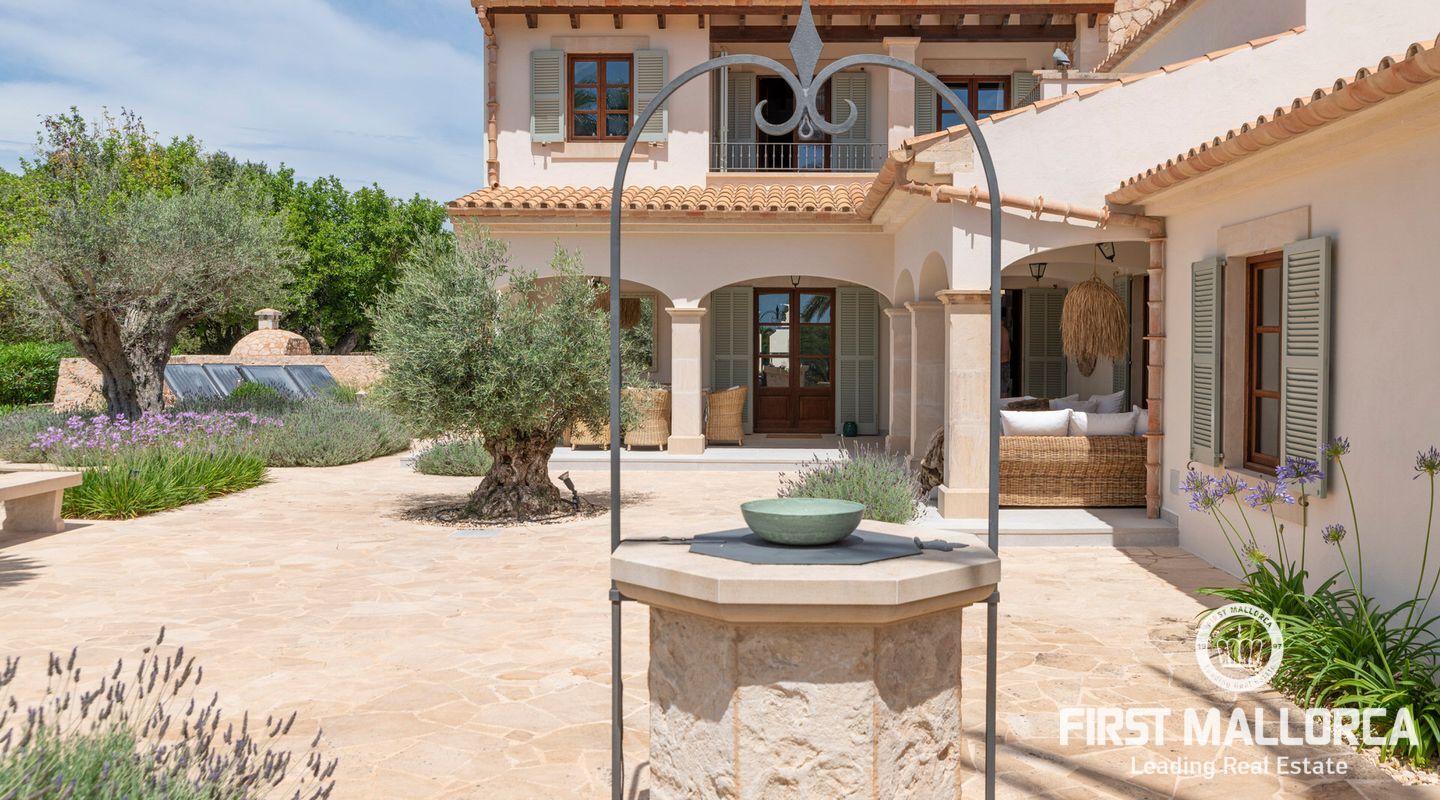 This beautiful estate was completely renovated by its current German owners and completed in 2023. The property is majestically situated with its buildings and tower, which dominates every surrounding corner, on a beautifully landscaped plot of about 28,000 m2. It impresses with its high quality and beautiful interior design, which conveys harmony, tranquillity and a very good energy flowing throughout the property, filling every corner with light and colour. Natural colours and textures were chosen for the design and refurbishment, which harmonise perfectly with the surroundings and create an impeccable symbiosis between the interior and exterior. Approximately 455 m2 of terraces and another approximately 150 m2 of covered terraces, as well as a refreshing 13x6 saltwater swimming pool and beautiful corners throughout the garden with large century-old trees that provide ideal shade in summer, make this finca a perfect place where everyone can choose their favourite spot to retreat and enjoy. Also noteworthy are the views of the San Salvador Sanctuary and the surrounding mountains, as well as the majestic tranquillity and absolute privacy. The main house with tower houses on the ground floor a cosy living room with fireplace and access to the terrace, a cosy and spacious eat-in kitchen, also with fireplace and access to the terrace, a double bedroom with fireplace and bathroom en suite, as well as a further single bedroom and a guest shower room/toilet. On the upper floor is the spacious master bedroom with fireplace, dressing room, en suite bathroom and access to a covered terrace. On the 2nd floor there is also a tower room of about 20 m² with magnificent panoramic views of the monastery mountain of San Salvador and the mountain of Randa. Separated from the main house, in the pool area in a small house, there is another house of 60 m² with living room and open kitchen, bedroom and bathroom. Garage for four cars, as well as for storage of tools and junk, WLAN, satellite TV, alarm, electric gate, underfloor heating with heat pump, pre-installation for air conditioning, automatic irrigation, rain water collection cistern for garden irrigation, water cistern of 40.000 Ltrs, Finca connected to the electricity supply, connected also to the water service by local water company meter, and many extras more, make this beautiful property the ideal place to enjoy 365 days a year, our beloved island and its coveted Mediterranean lifestyle.