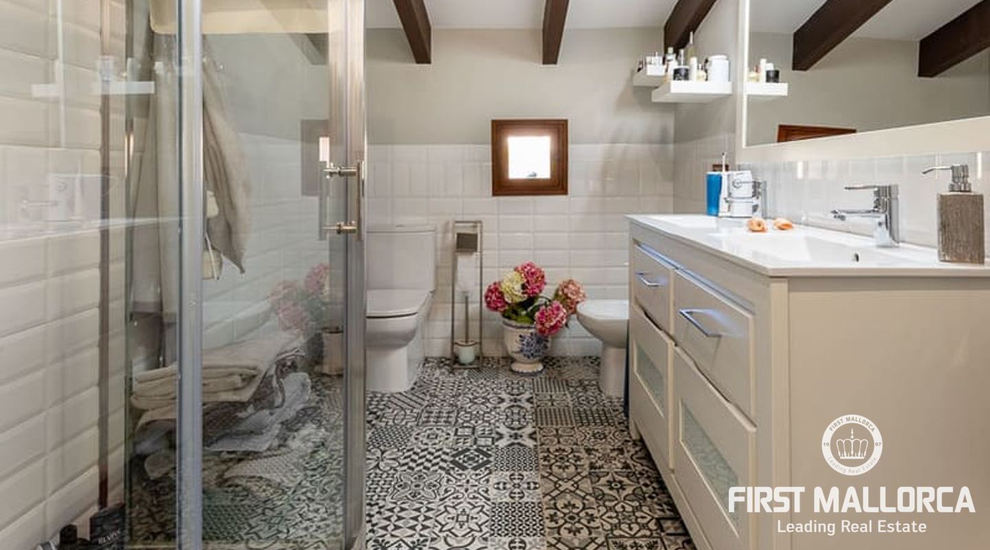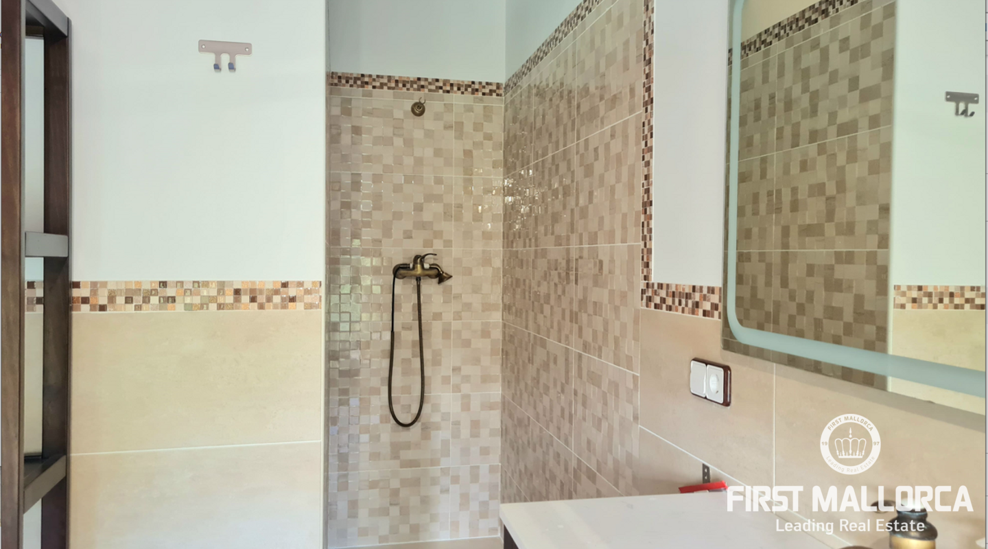Ascending to the next floor reveals two double bedrooms, one of which offers direct access to a terrace, along with another complete bathroom. An expansive rooftop gym, enclosed by glass walls, provides awe-inspiring views of the picturesque village of Selva and the majestic Tramuntana mountains. Accessible via staircase from one of the bedrooms and breathtaking panoramic vistas.