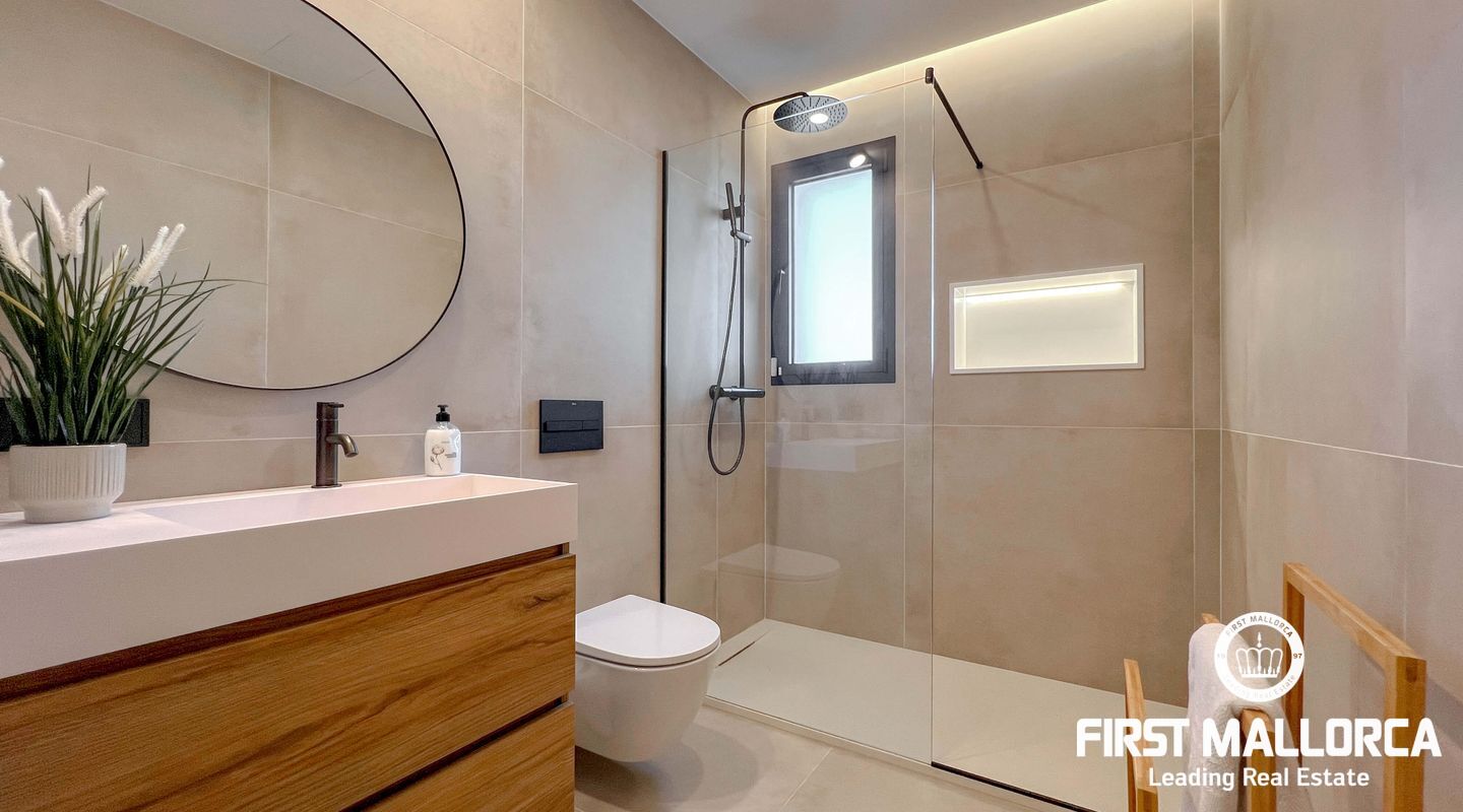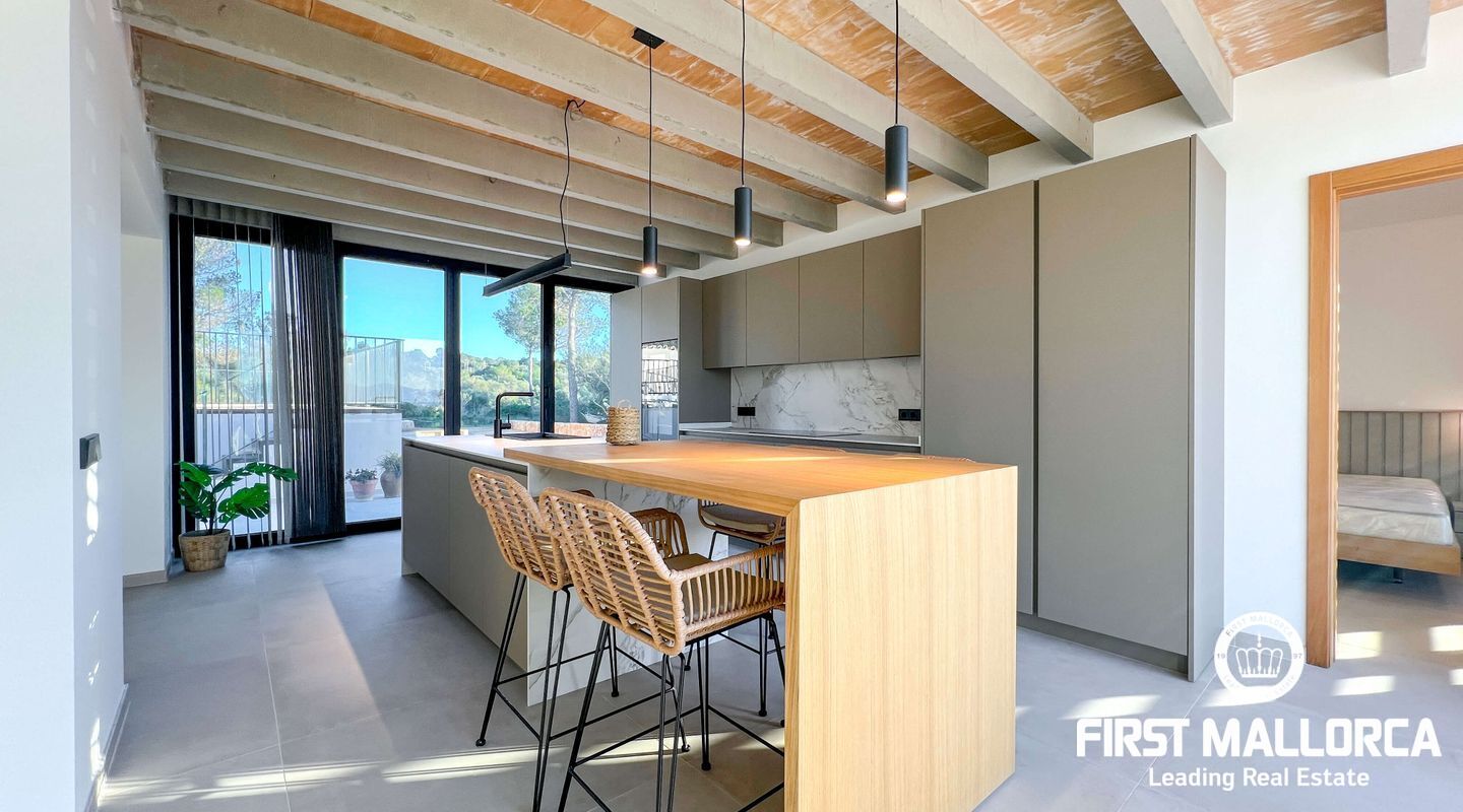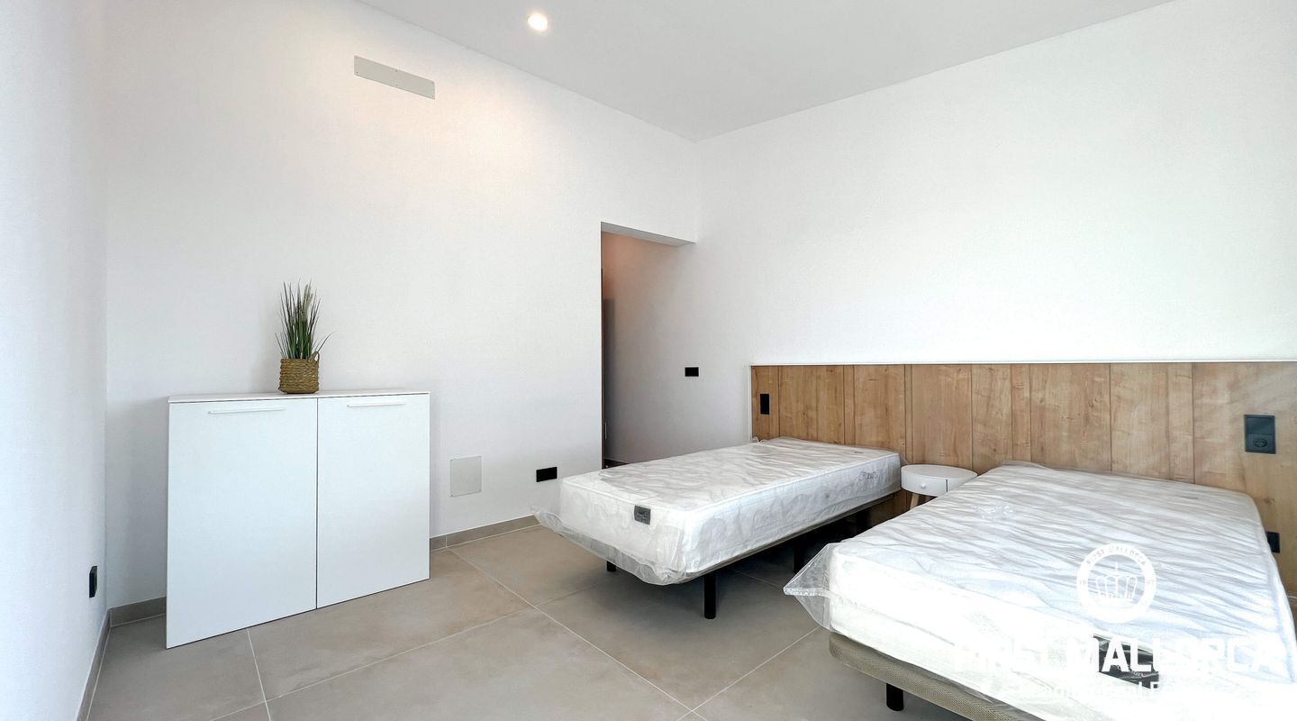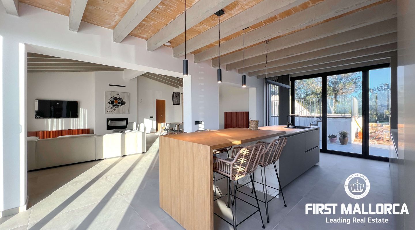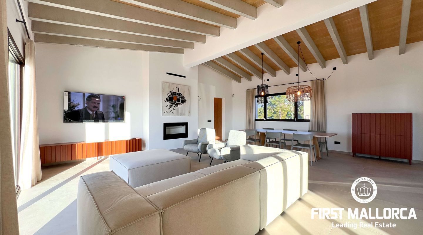 Surrounded by the idyllic landscape of s'Arenjassa, this exclusive newly built finca is a true hideaway for nature lovers and those seeking peace and quiet. With magnificent views of the surrounding countryside, the property combines modern living with Mediterranean flair. The finca has three spacious bedrooms and three stylish bathrooms that offer the highest level of living comfort. The open-plan living area with integrated kitchen impresses with its brightness and spaciousness and is complemented by an elegant fireplace, which creates a cosy atmosphere even on cooler evenings. Large window fronts harmoniously connect the interior spaces with nature and provide direct access to the outdoors from every room. The outdoor area invites you to relax with a pool, while a practical utility and storage room offers additional storage space. Air conditioning units ensure pleasant temperatures even on hot summer days, while traditional Persianas emphasise the Mallorcan charm. The modern and furnished finca is available to rent until September at the latest and thus offers the ideal opportunity to enjoy the Mediterranean lifestyle in a quiet yet easily accessible location.