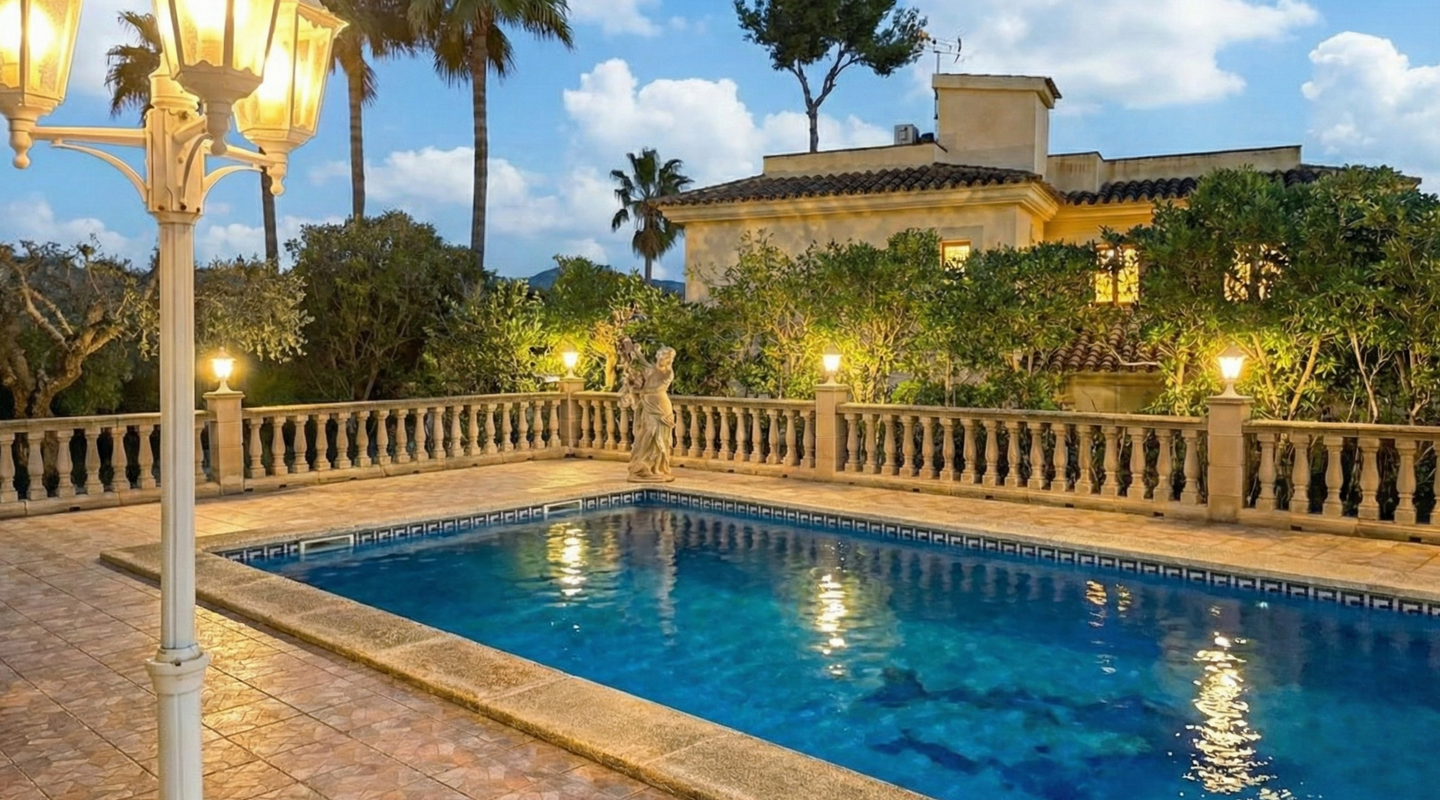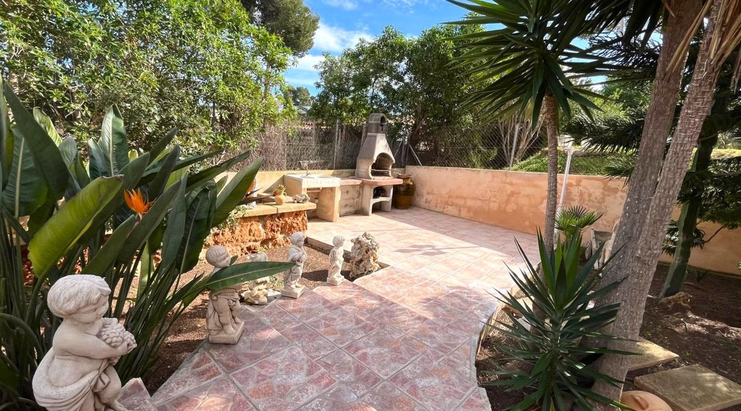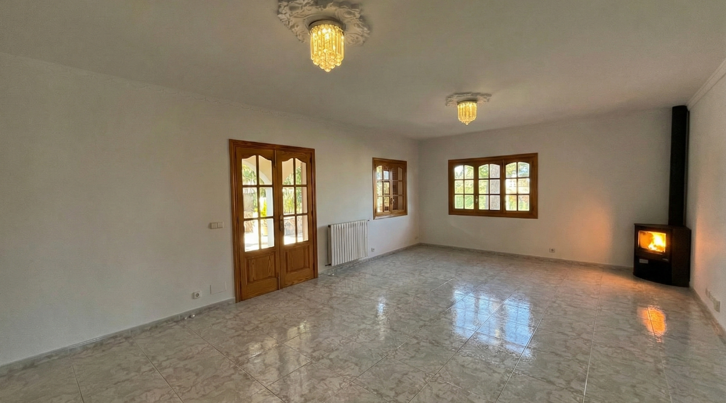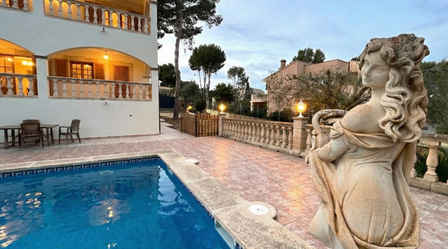 Outside, the property offers two terraces, a Mallorcan-style porch, and a barbecue area, perfect for enjoying the Mediterranean climate and outdoor gatherings. The villa also features a large private swimming pool, ideal for relaxing during the summer months.