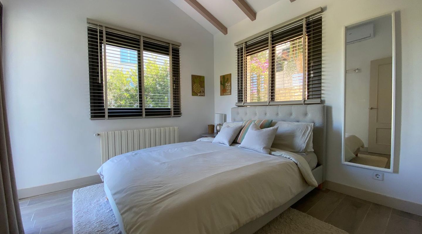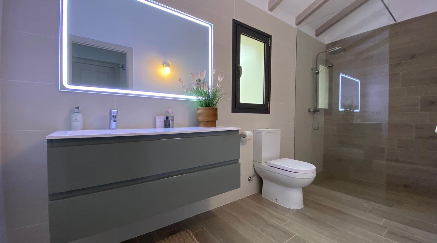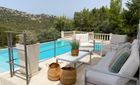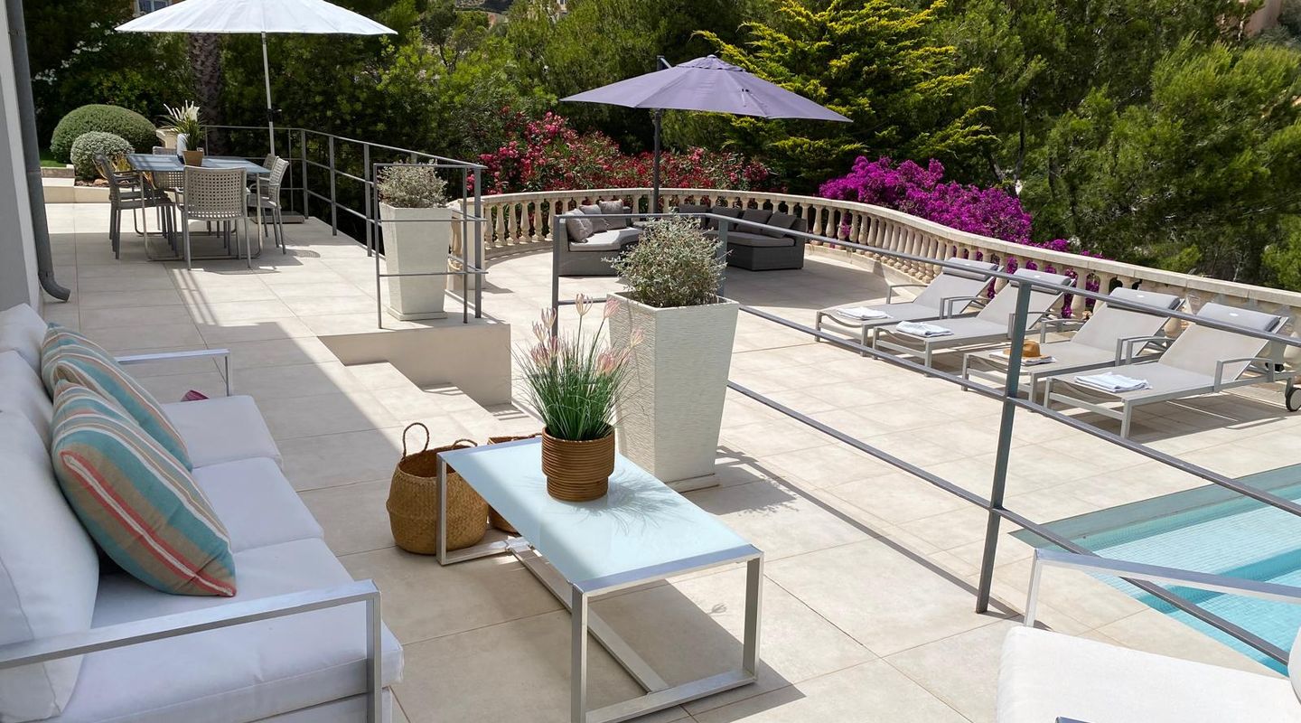 Outside, the home truly shines. A large terrace with a dining table is perfect for enjoying long meals with friends and family, while the pool area with comfortable seating, a sofa, and sun loungers invites you to relax and enjoy the Mediterranean lifestyle.