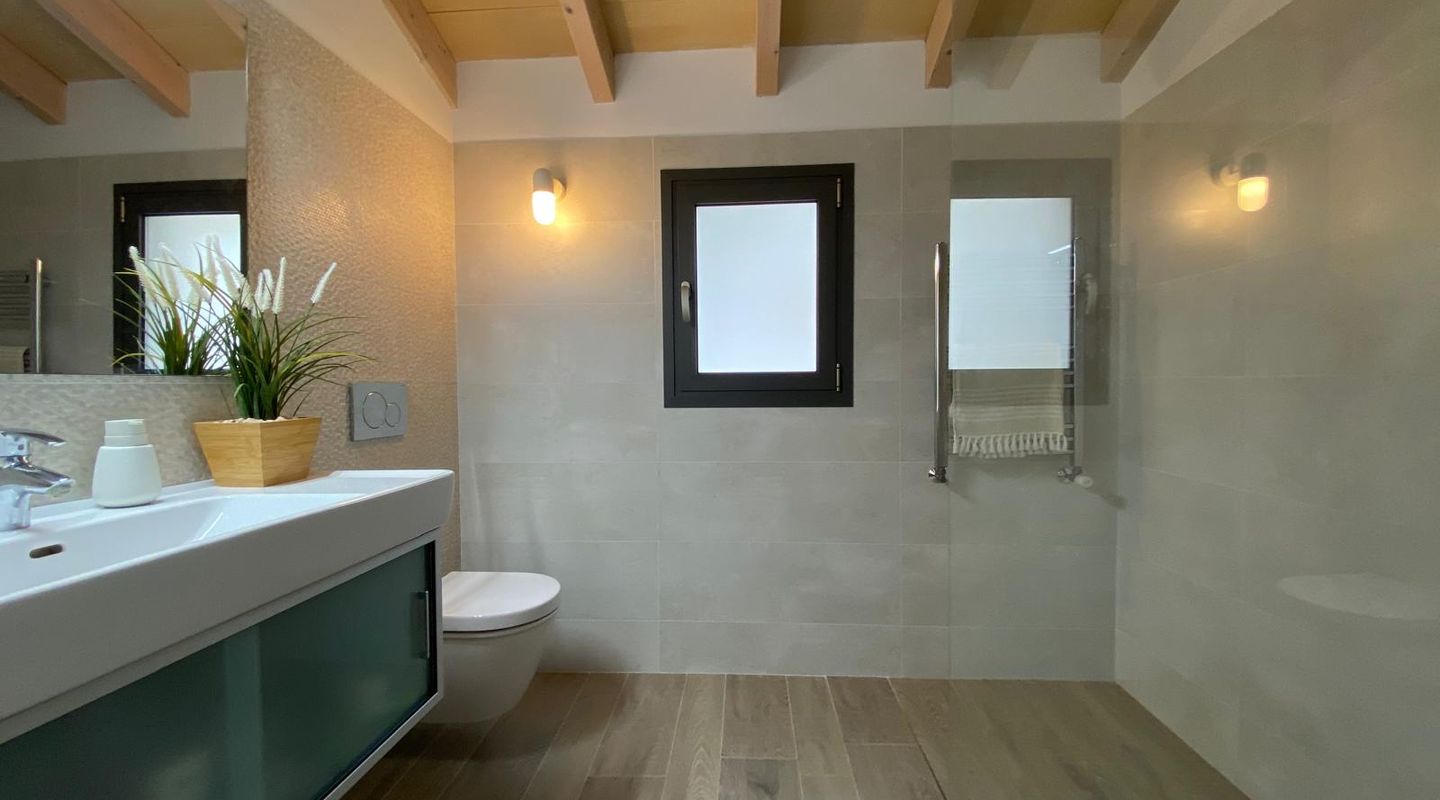 The first floor offers three comfortable bedrooms, two of which enjoy private terraces with beautiful panoramic views of the surrounding mountains. There are also two additional bathrooms with showers.