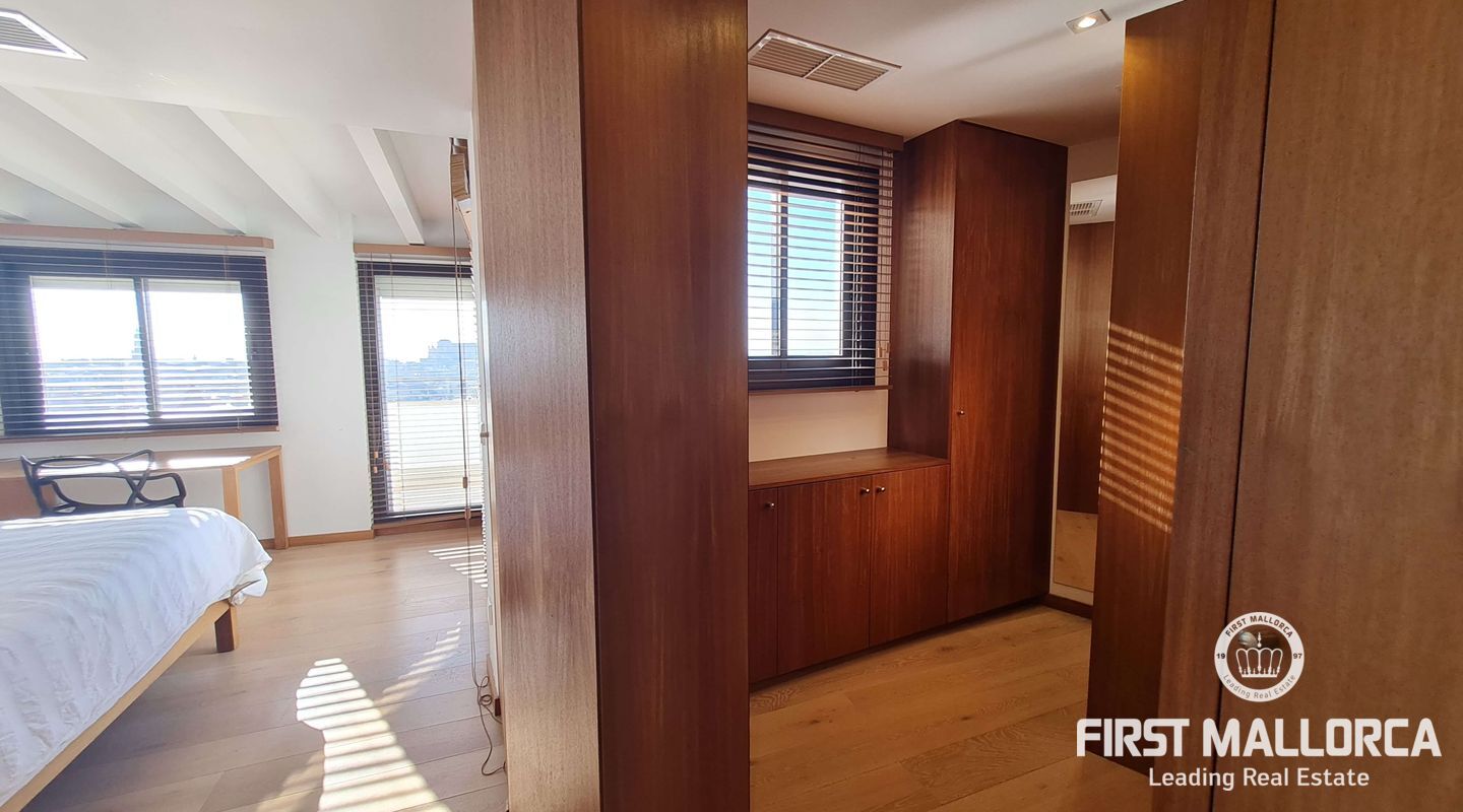 This luxurious penthouse is situated in the heart of Palma, only a few minutes' walk from Calle Jaime III, Paseo de Mallorca and La Rambla. The property is characterised by its beautiful and well-kept design as well as its high quality finishings. It enjoys abundant natural light coming in through its large windows and as it is on the top floor, it enjoys the privilege of its imposing and unobstructed views of the old town, the sea and the mountain range. The property consists of a spacious and bright living-dining room, connected to a large terrace with table and chairs, sofa and canopy. The modern kitchen with electrical appliances has a double window overlooking the bay. There are three comfortable bedrooms with built-in wooden wardrobes, of which the master bedroom is en-suite, with its own dressing room, views of the cathedral and adjacent terrace, ideal for enjoying a cup of coffee just after waking up. The property features natural wood parquet flooring, ducted air conditioning, water softener, central heating and parking for a small car. The property is fully equipped and is available for long and temporary contracts. For further information please do not hesitate to contact your First Mallorca agent.