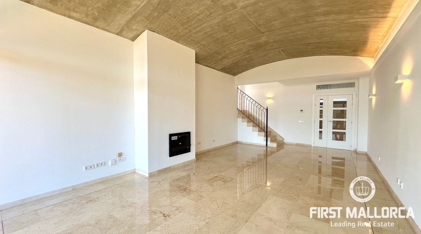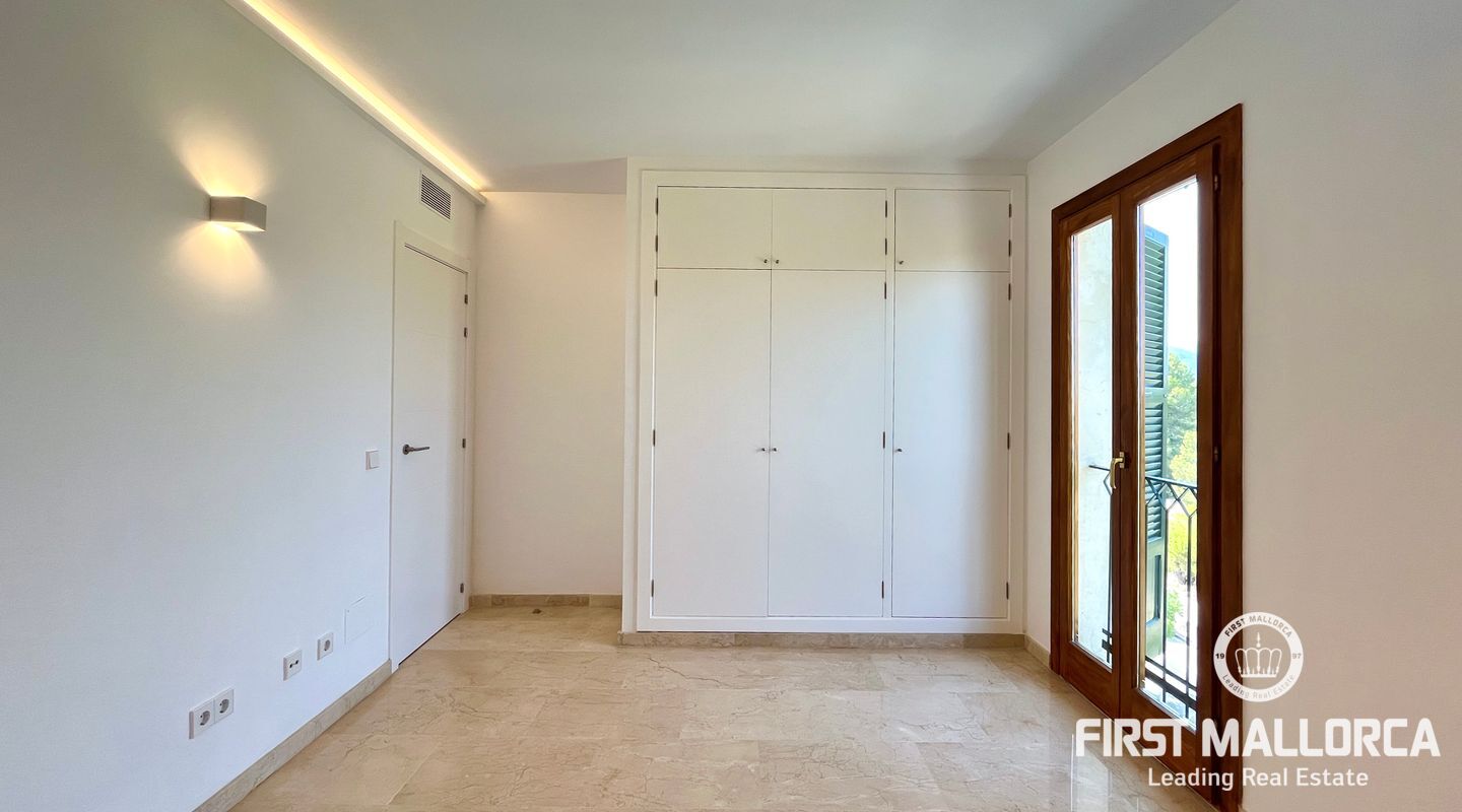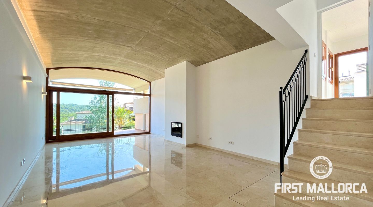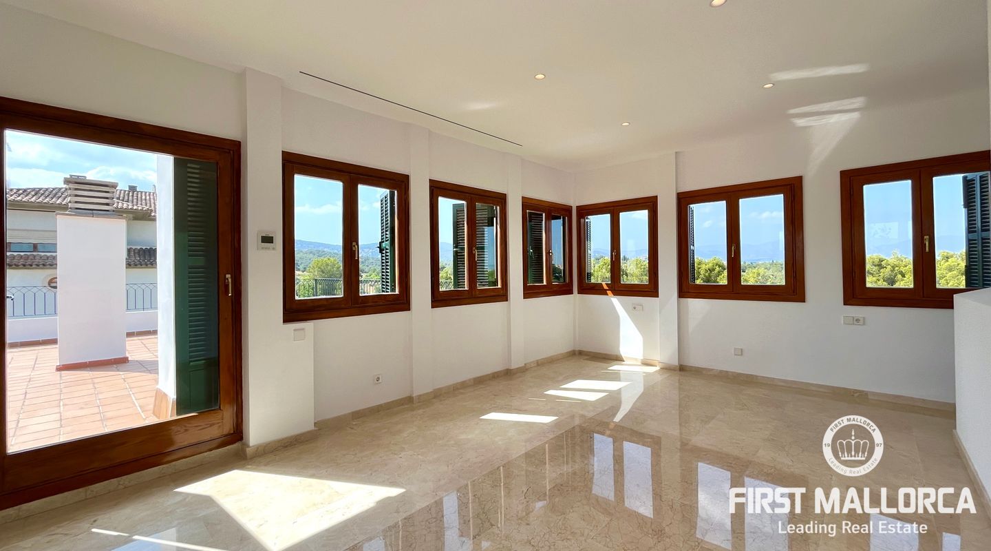 The property includes a large living room with a wood-burning fireplace and access to the first terrace, which offers views of the community, the forest, and Bellver Castle. From the living room, stairs lead to the upper floor, where there is a studio with 270º windows and access to a second terrace of approximately 70 m². This is the only space located on the upper level; on the main floor, there is a modern and fully equipped kitchen along with a laundry room, the master bedroom with an en-suite bathroom, three additional double bedrooms, and another bathroom. The master bedroom and two of the bedrooms have access to the third terrace, while the fourth room has a French balcony. All rooms feature built-in wardrobes.
