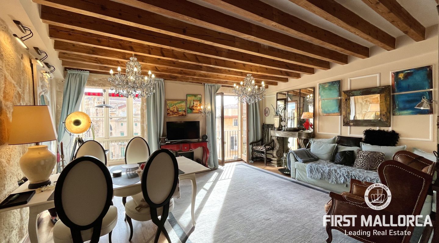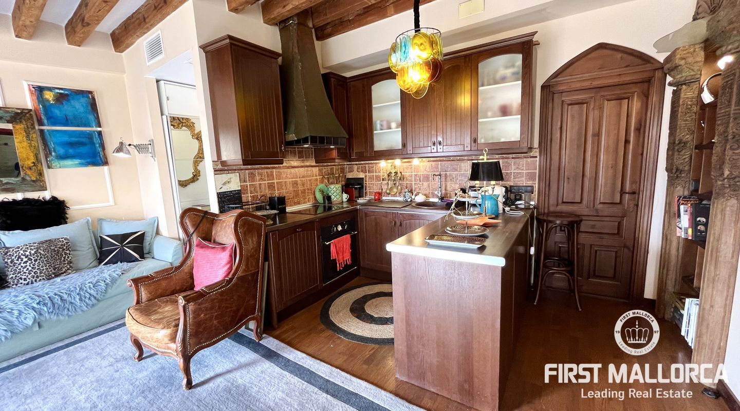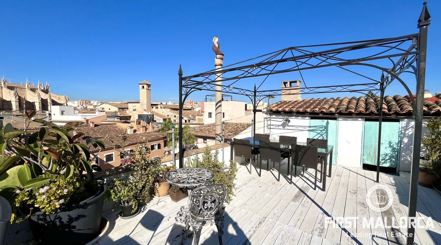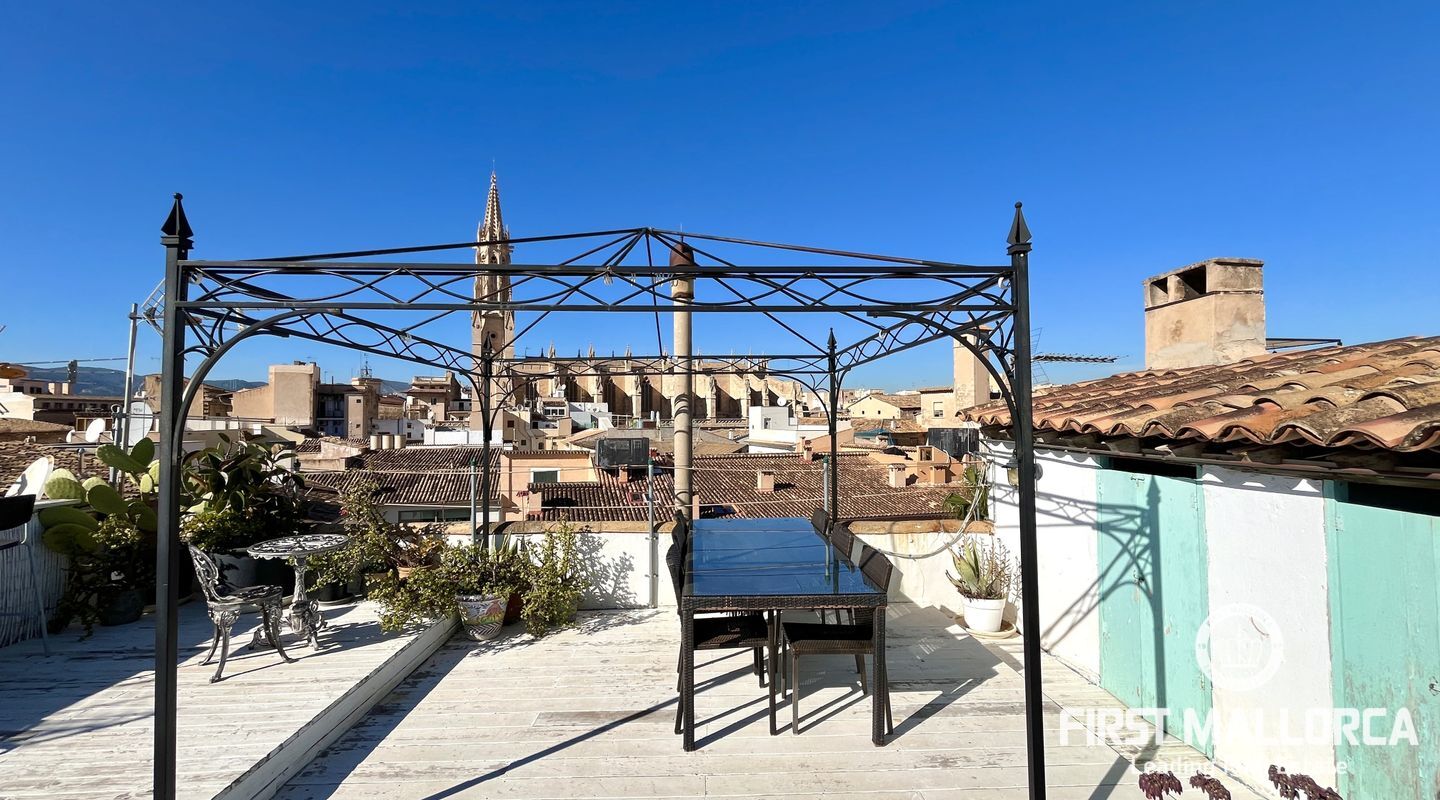 Short term rental. Sunny, south-east facing. The elegant property consists of entrance hall, living dining room and open plan kitchen, open views to the old town square of Palma. One double bedroom, one large bathroom. The charm of the flat is a roof terrace overlooking the old town. It consists of sunbathing area with sun loungers, bar and dining area, second kitchen with washing machine and small storage room. Everything ready to start living your magnificent experience in the heart of Palma! In 15 minutes walking distance to the beach of Can Pere Antoni, close to all services. For more information and availability, do not hesitate to contact our agents. The price quoted may vary depending on the chosen period of stay.