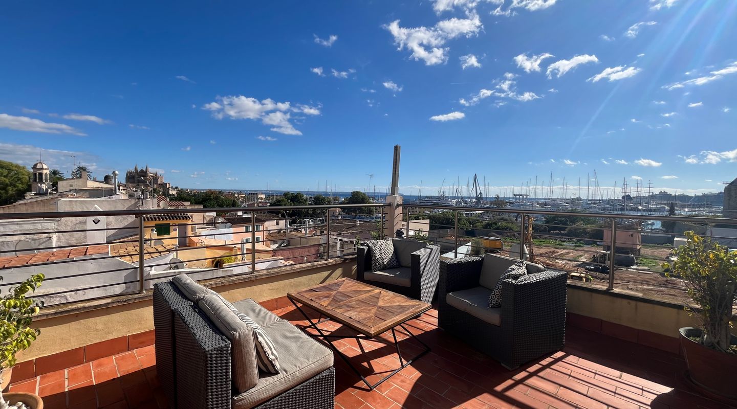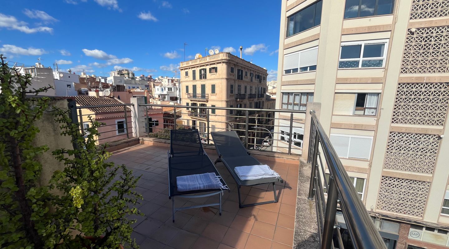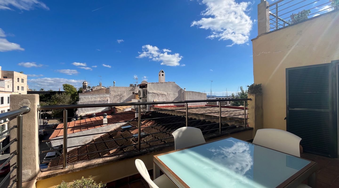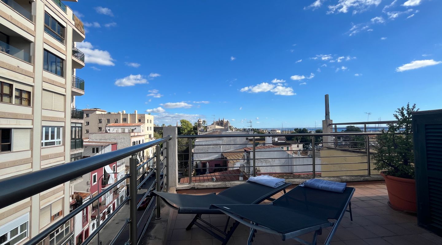 Spread over two levels, it offers 60 m² of interior space and two wonderful terraces: a 13 m² terrace adjacent to the kitchen and a 38 m² rooftop terrace with open views of the Cathedral, the sea and the rooftops of Palma.