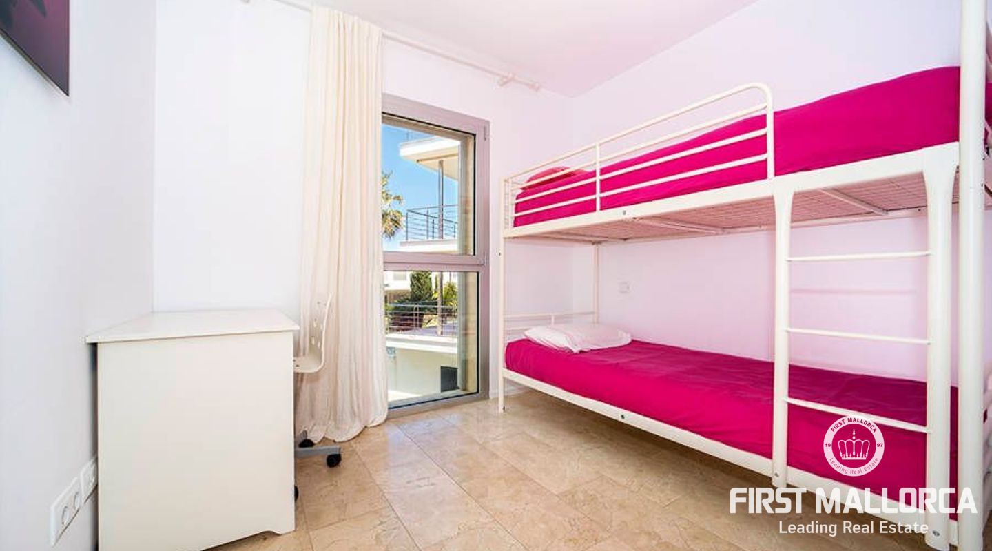 On entering the house, a hallway leads to the main room, where the living-dining room is located. It is also very luminous, as it is surrounded by large windows from which you can see the sea and appreciate the beautiful exterior of the house. It is also very cosy and has a very homely style. Adjacent is the separate, modern, high quality and fully equipped kitchen. There are four bedrooms, three of them double and one with bunk beds, three bathrooms and a guest toilet.