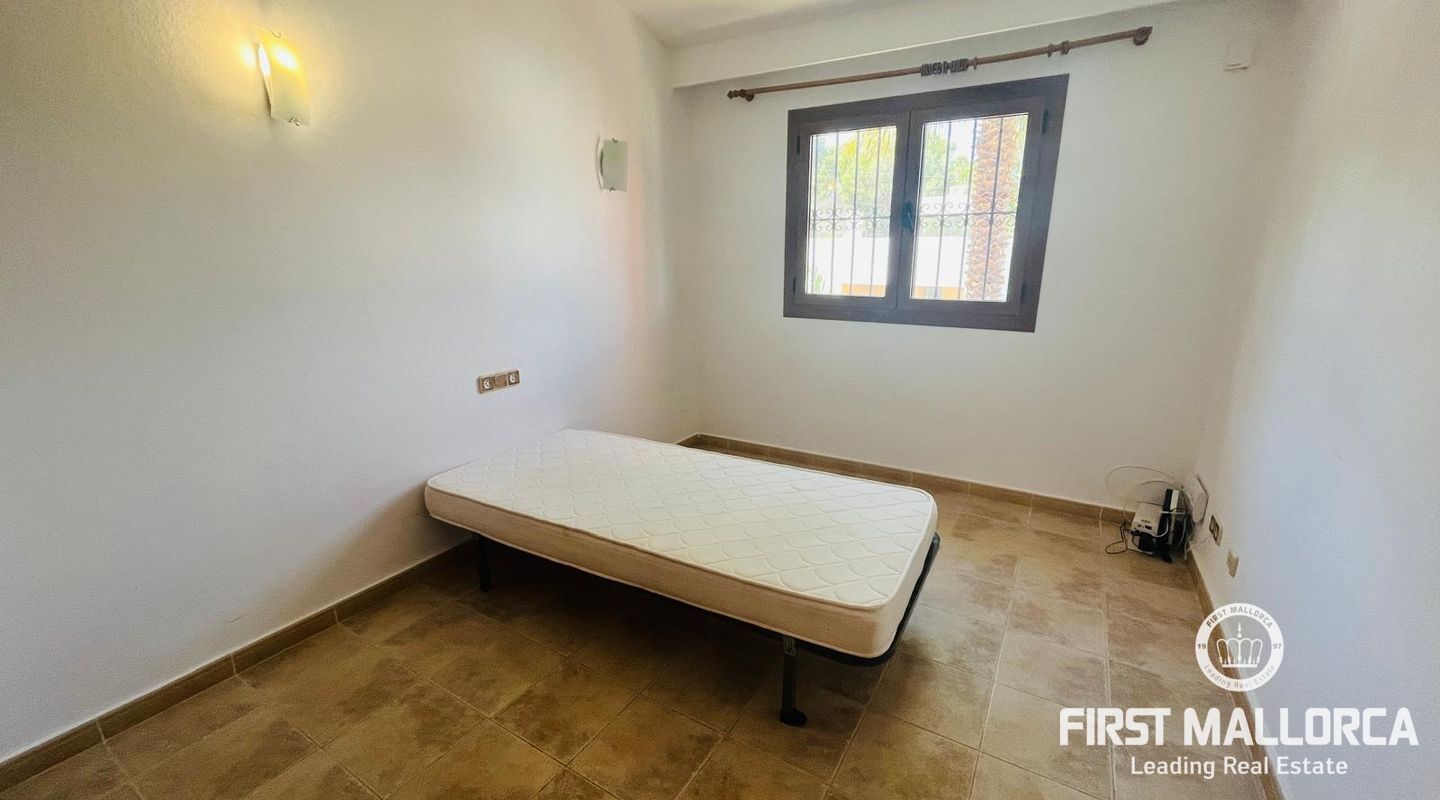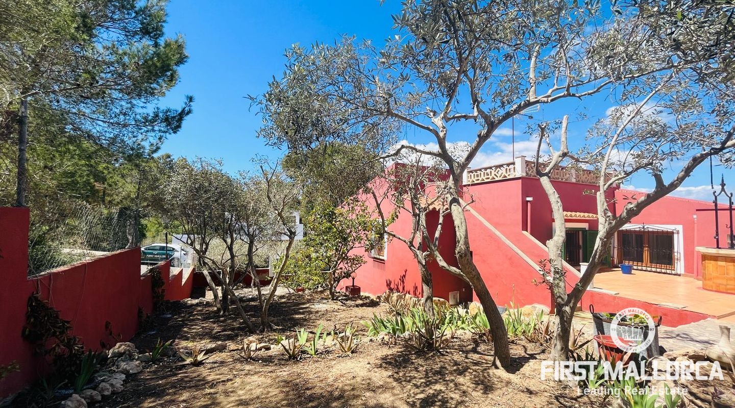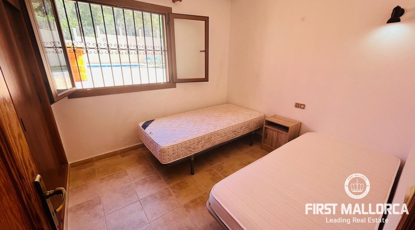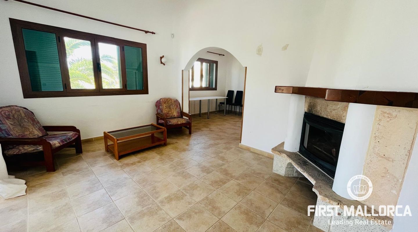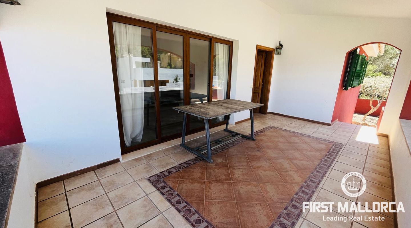 Family villa close to the sea enjoying a very quiet location and only 3 minutes by car to Port Adriano, the beach and local shops. The property is constructed on a plot of 1.000 m2 with one level of 140 m2 constructed. Entry via a few steps into the hallway, leading to a living room with a fireplace, an adjacent dining area and a covered terrace enjoying green views. In addition there are 3 bedrooms and 2 bathrooms, a kitchen with a rear access leading to the swimming pool area and the sunbathing terraces. Further features include: a fireplace, a large garage and storage underneath the villa, a pool shower, a barbecue area and a level lawn area with artificial grass. Only 2 minutes stroll from the villa is the coastline where you can walk across to Portals Vells so ideal for sporty people and dog owners.