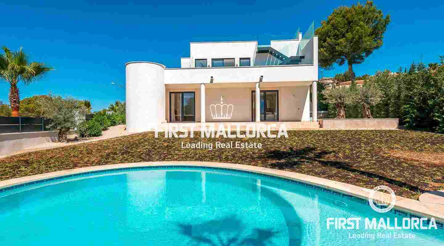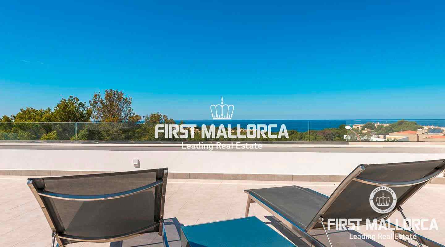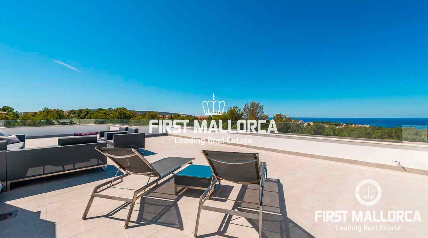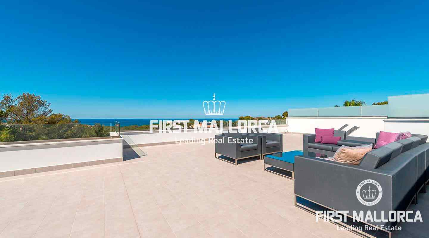 This modern, light flooded minimalist villa sits on a southwest facing plot in a exclusive villa urbanisation in the south-west of the island. In addition to stunning panoramic sea views, the property also benefits from an absolutely quite location and is just a few minutes’ drive from the centre of the village. The extensive infrastructure allows for easy access to the local golf courses, beaches and yacht marinas. The 4 bedroom property with spacious open and rooffed terraces, swimming pool and garage is constructed with the best of building materials The main living area which is situated on the top floor of the villa features a large living/dining room with an open plan kitchen.. All four en suite bedrooms are located on the ground floor.