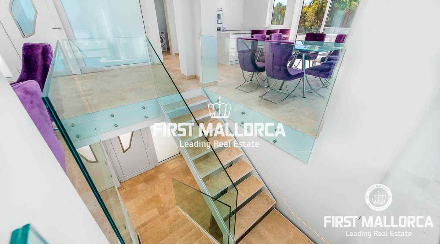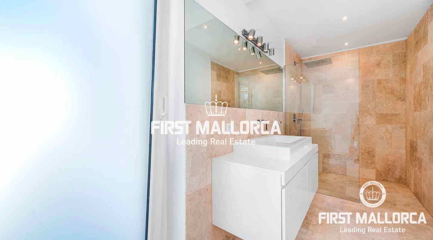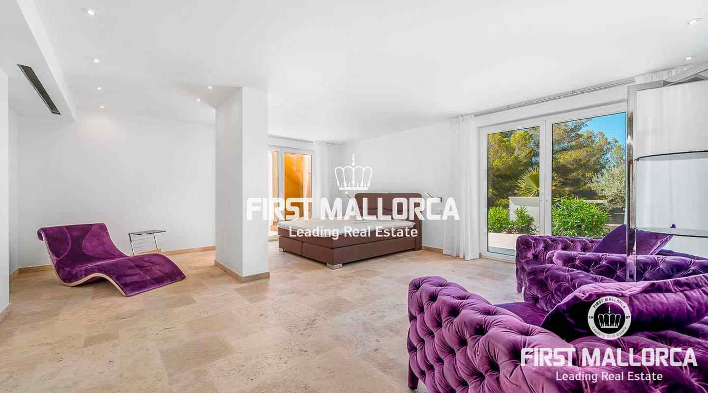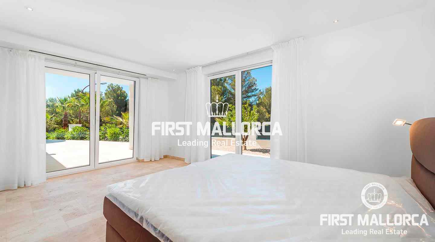This modern, light flooded minimalist villa sits on a southwest facing plot in a exclusive villa urbanisation in the south-west of the island. In addition to stunning panoramic sea views, the property also benefits from an absolutely quite location and is just a few minutes’ drive from the centre of the village. The extensive infrastructure allows for easy access to the local golf courses, beaches and yacht marinas. The 4 bedroom property with spacious open and rooffed terraces, swimming pool and garage is constructed with the best of building materials The main living area which is situated on the top floor of the villa features a large living/dining room with an open plan kitchen.. All four en suite bedrooms are located on the ground floor.