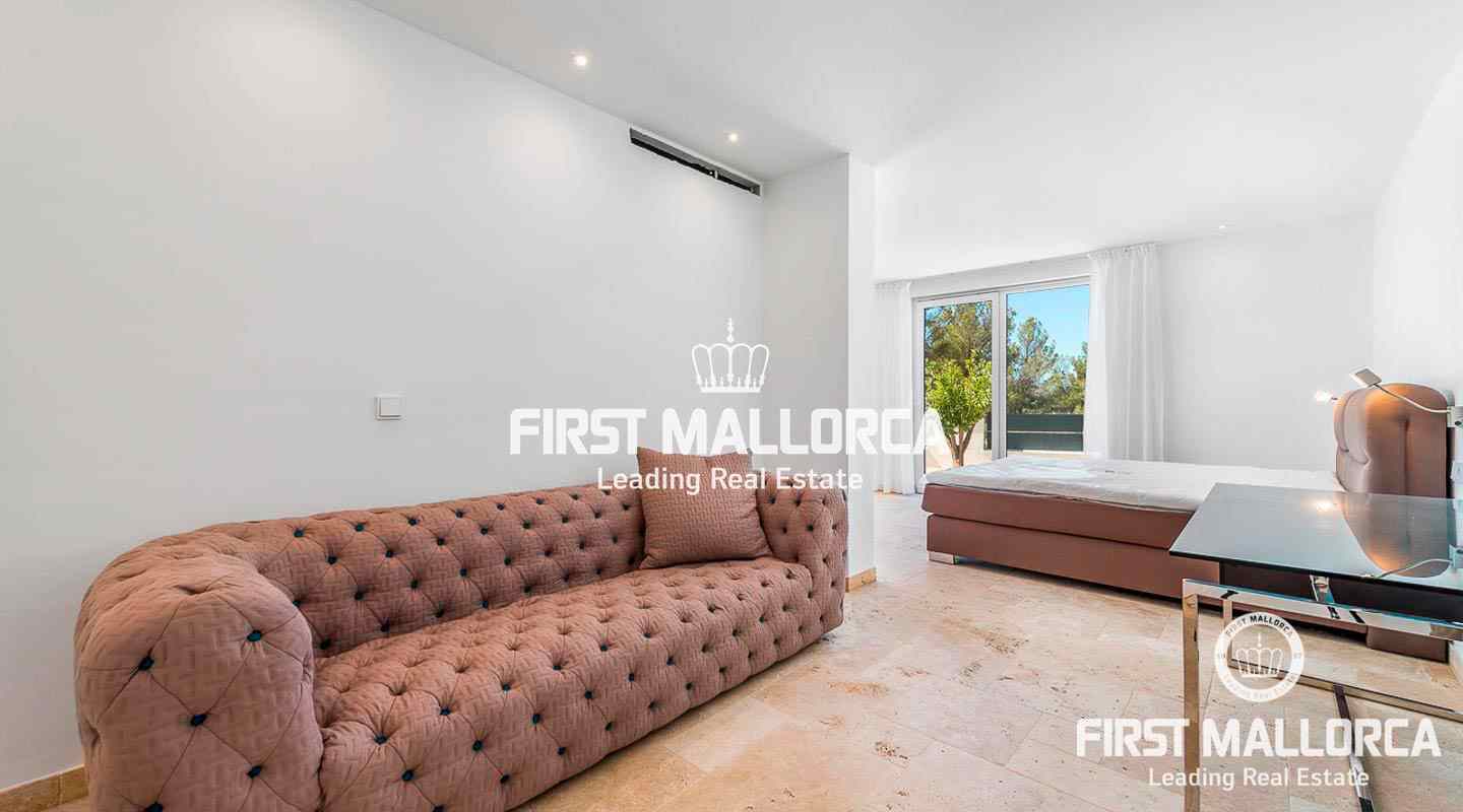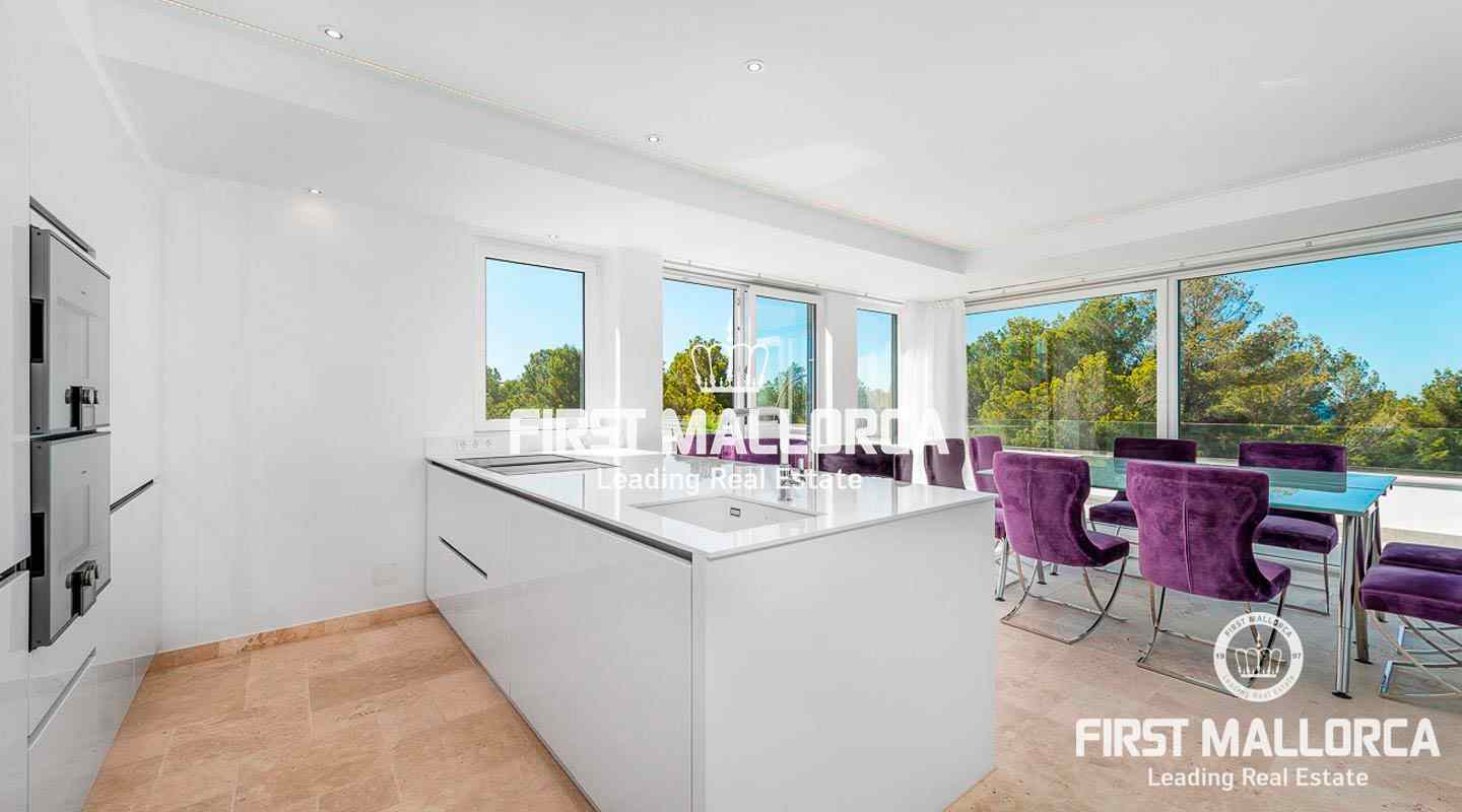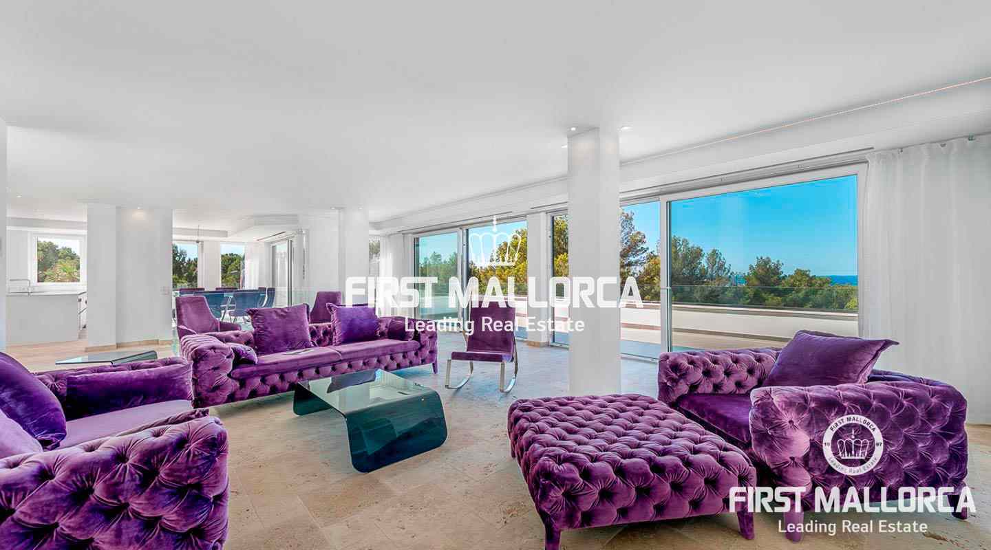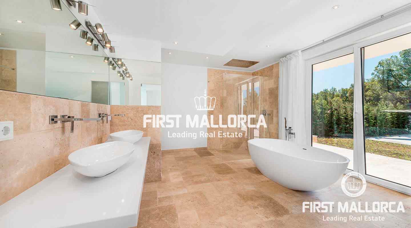 This modern, light flooded minimalist villa sits on a southwest facing plot in a exclusive villa urbanisation in the south-west of the island. In addition to stunning panoramic sea views, the property also benefits from an absolutely quite location and is just a few minutes’ drive from the centre of the village. The extensive infrastructure allows for easy access to the local golf courses, beaches and yacht marinas. The 4 bedroom property with spacious open and rooffed terraces, swimming pool and garage is constructed with the best of building materials The main living area which is situated on the top floor of the villa features a large living/dining room with an open plan kitchen.. All four en suite bedrooms are located on the ground floor.