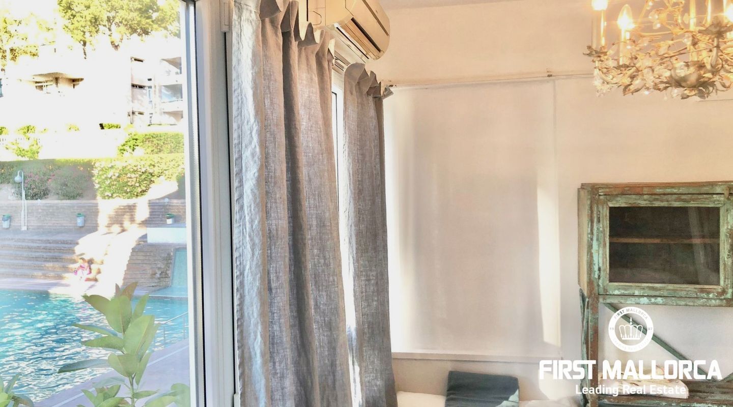 Among the additional amenities are new PVC windows with double glazing, offering pleasant views of the communal pool and the well-maintained garden of the complex. The hot/cold air conditioning ensures a comfortable environment throughout the year.