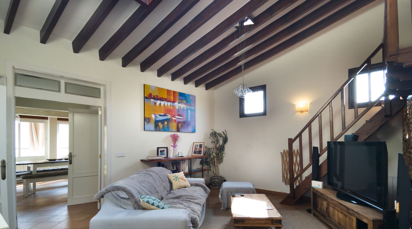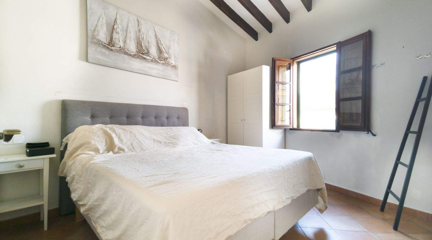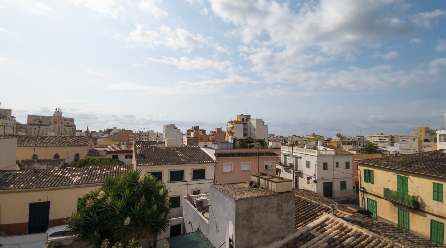 The apartment is in very good condition and stands out for its generous layout: large rooms, high ceilings, and plenty of natural light thanks to windows on three sides and a skylight. At the back, there is a cozy private garden of about 30 m², while on the rooftop you’ll find a sunny 25 m² terrace offering great privacy and open views of the Cathedral and Bellver Castle.