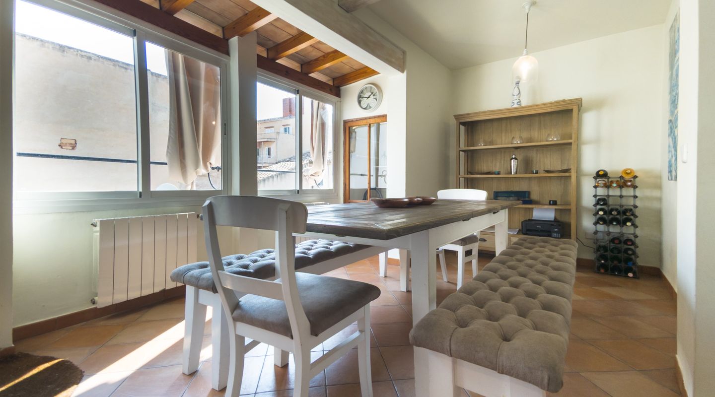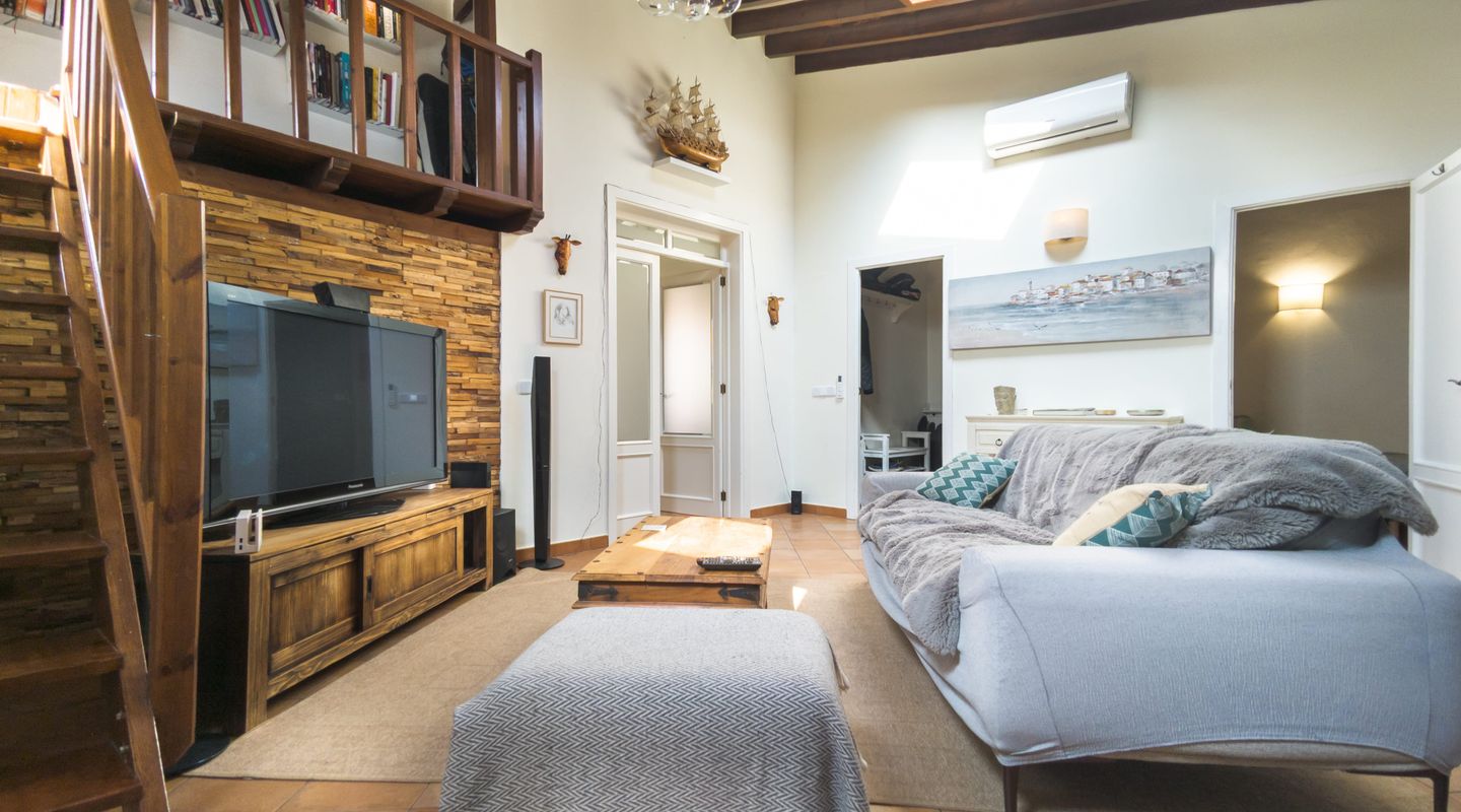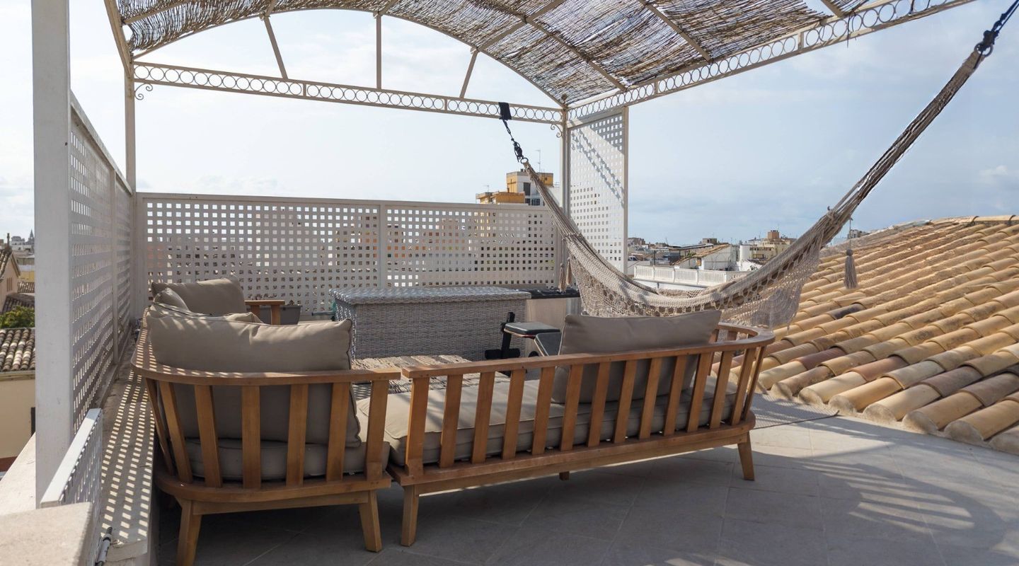 The apartment is in very good condition and stands out for its generous layout: large rooms, high ceilings, and plenty of natural light thanks to windows on three sides and a skylight. At the back, there is a cozy private garden of about 30 m², while on the rooftop you’ll find a sunny 25 m² terrace offering great privacy and open views of the Cathedral and Bellver Castle.