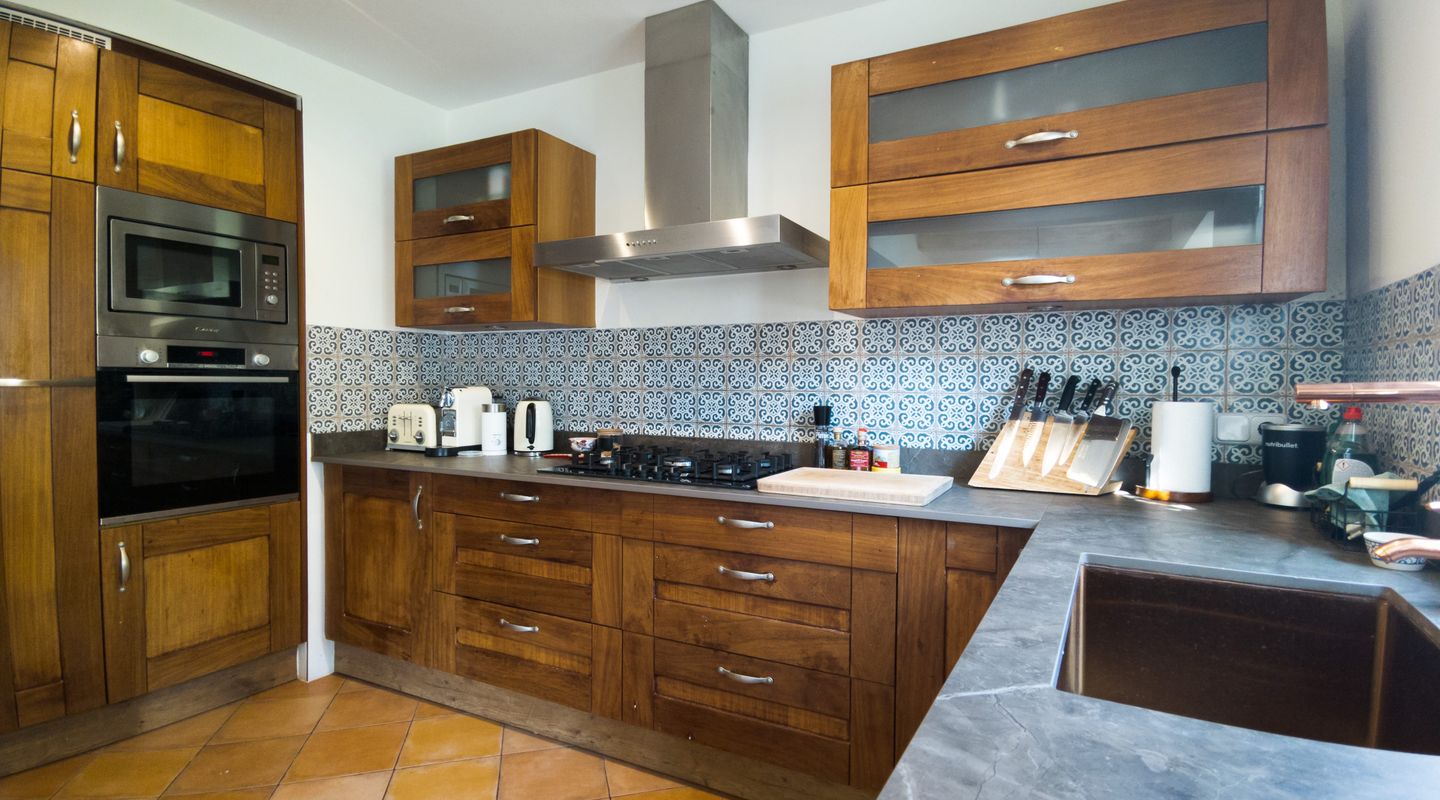 Features: exposed wooden beams, terracotta floors, built-in wardrobes, double glazing, skylight, heating, air conditioning (hot/cold), water softener. On the rooftop terrace: awning, shower, and summer kitchen.