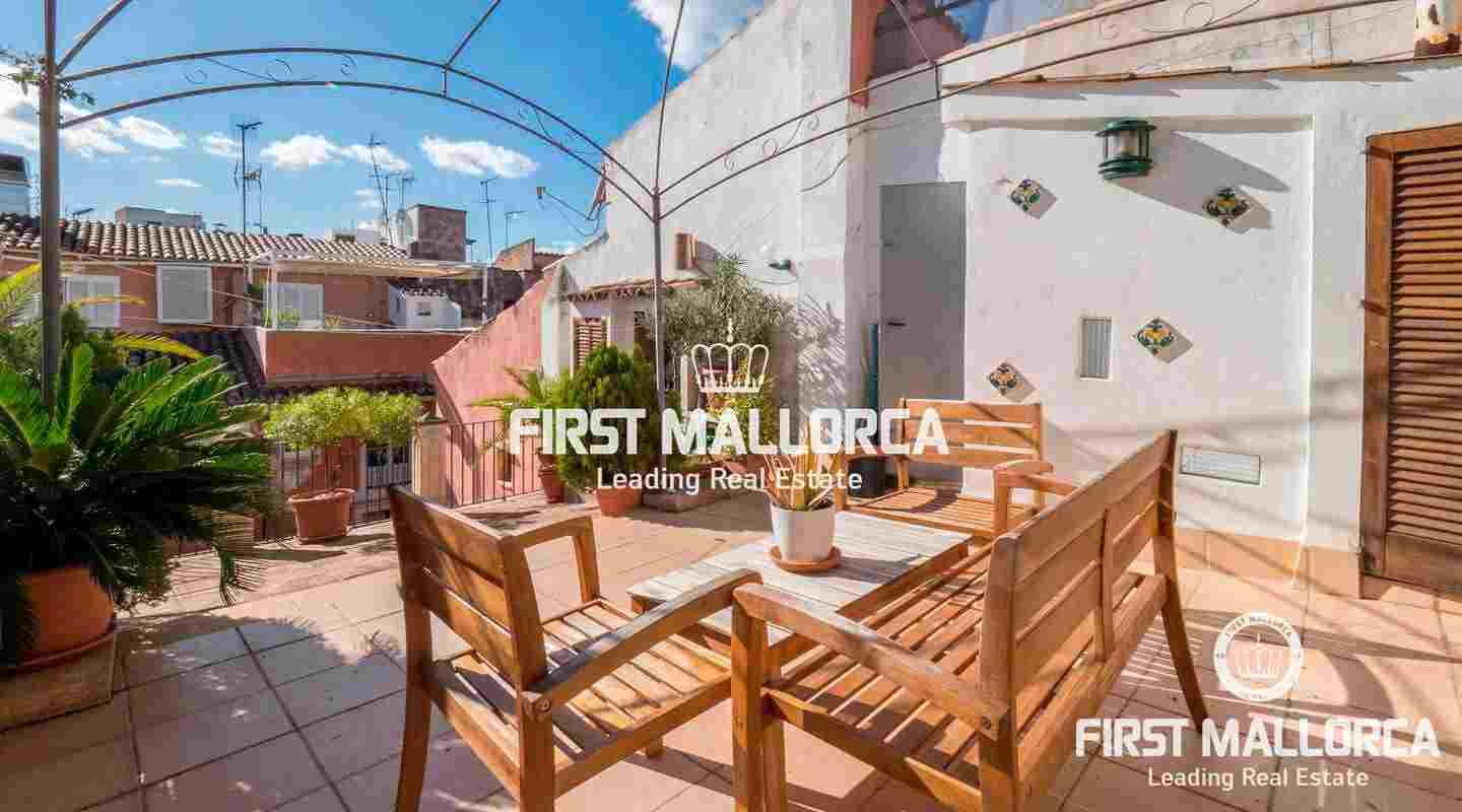 This duplex penthouse enjoys a privileged location in the heart of the old town of Palma de Mallorca and has a constructed area of approximately 120 m² plus 40 m² of terraces. The apartment has a living room, a kitchen with fireplace, 3 bedrooms, 2 bathrooms and a terrace in one of the bedrooms in addition to another one on the upper level.
