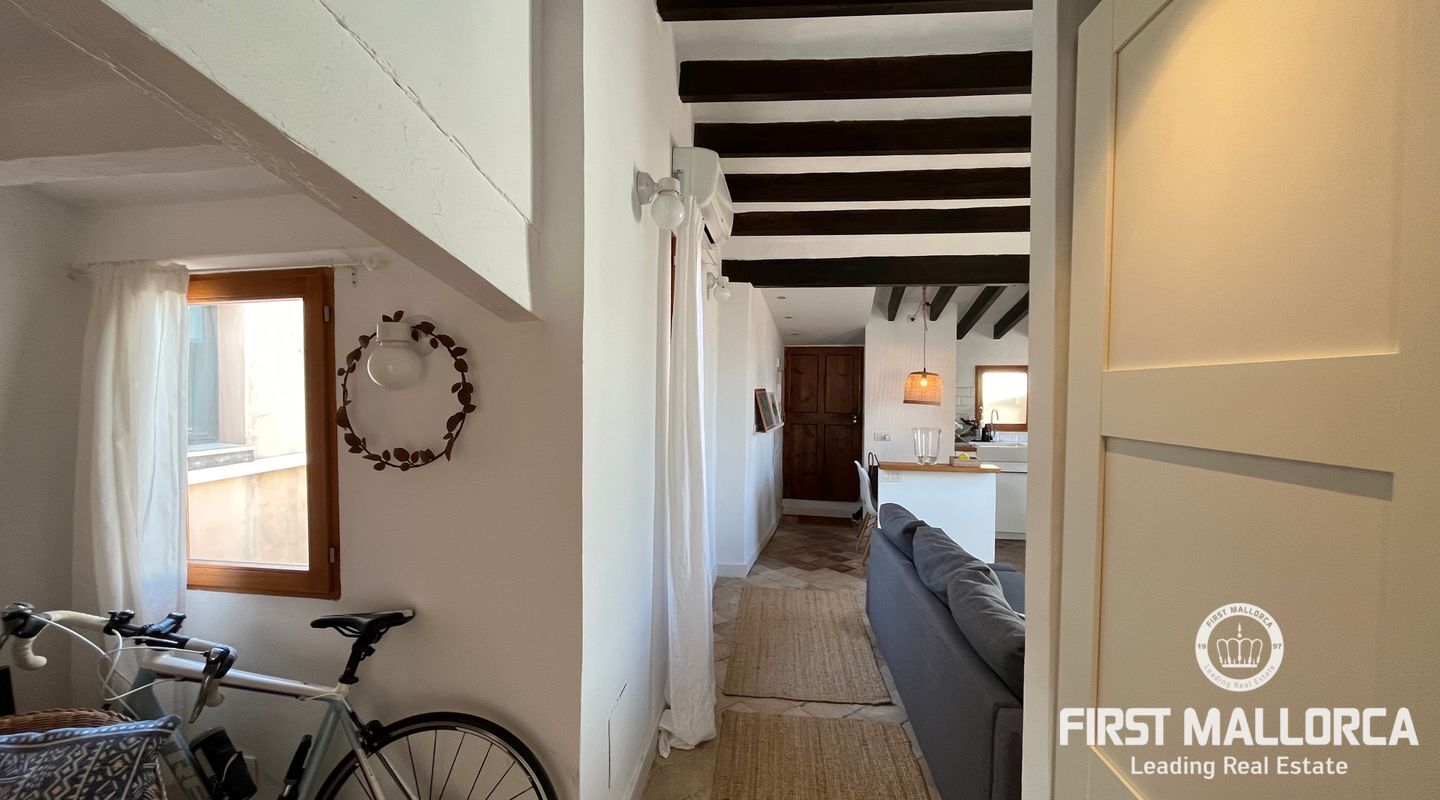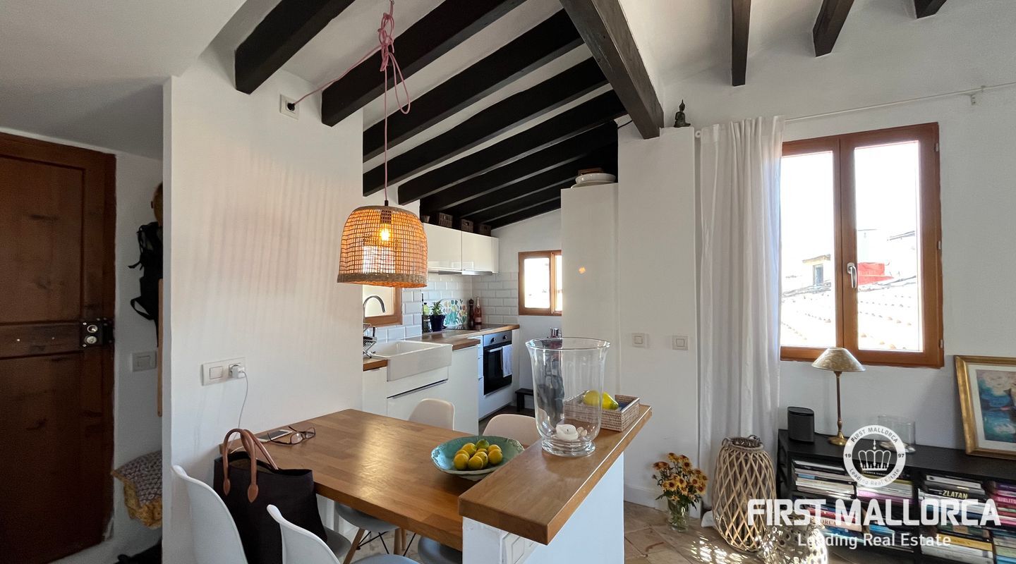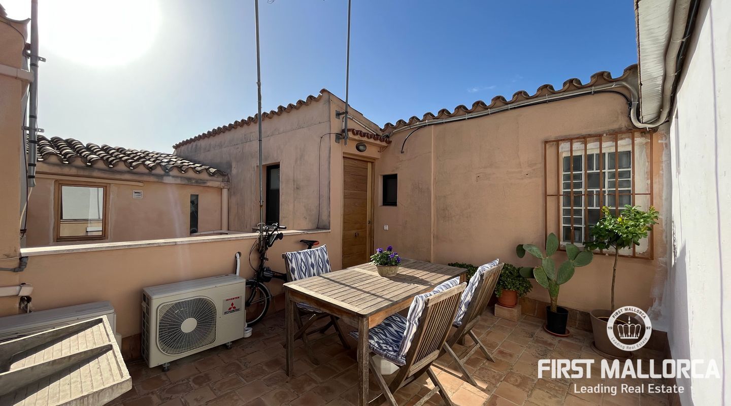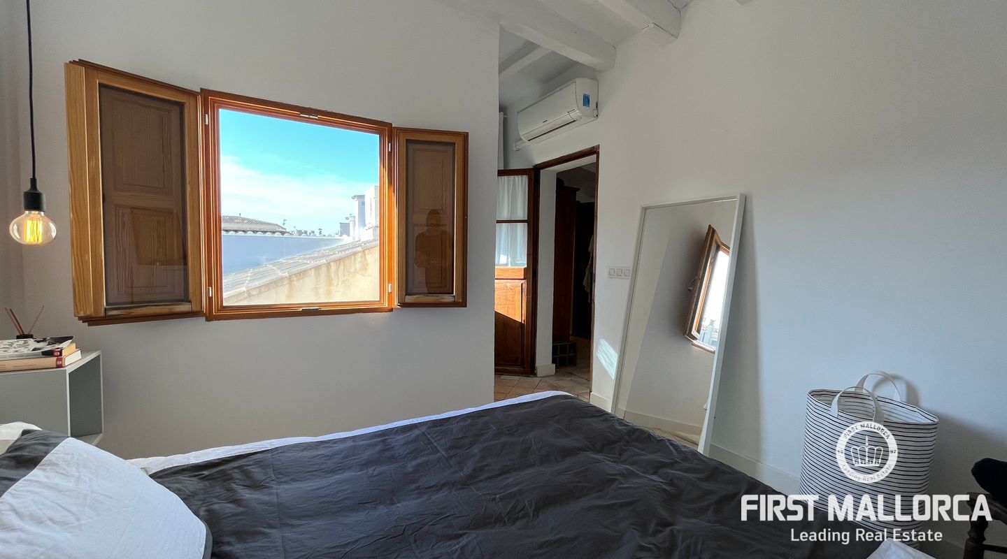 The Apartment has a modern style with the touch of the old mallorquin feeling, the layout of the Apartment is very well planned and with the high ceilings it feels very light and spacious. Thanks to that it's a penthouse and the position of the windows you get much daylight in the apartment that makes it feel very bright. The kitchen is connected with the livingroom and you also have a dining space. A nice bathroom and a large bedroom with very good light from the windows. Just outside the apartment you have a shared terrace where you can easily enjoy your morning coffee or just take a break and relax.
