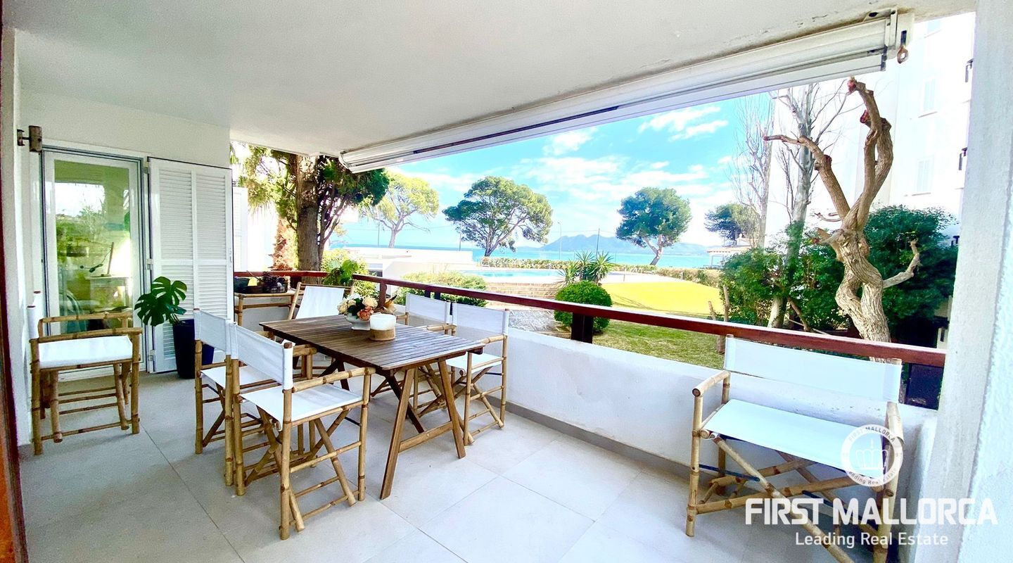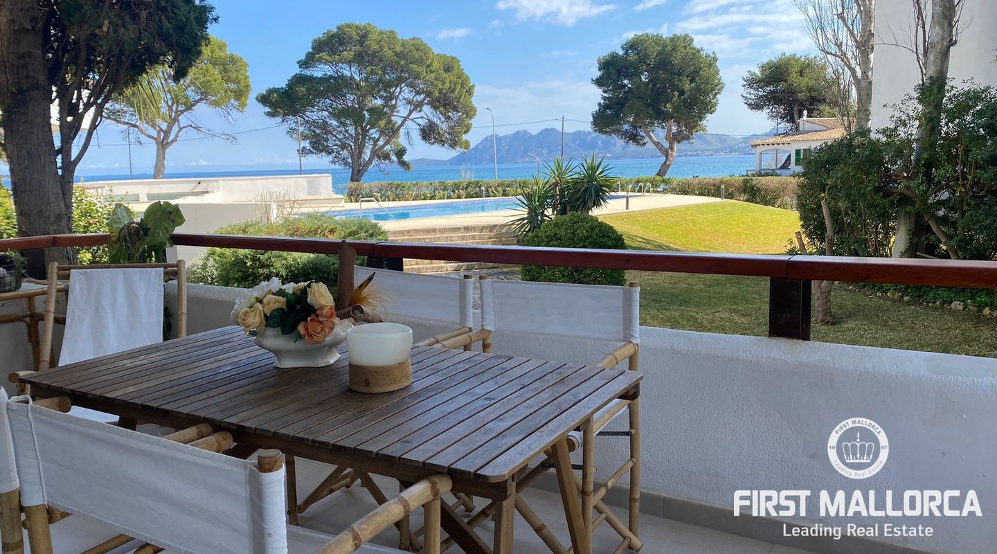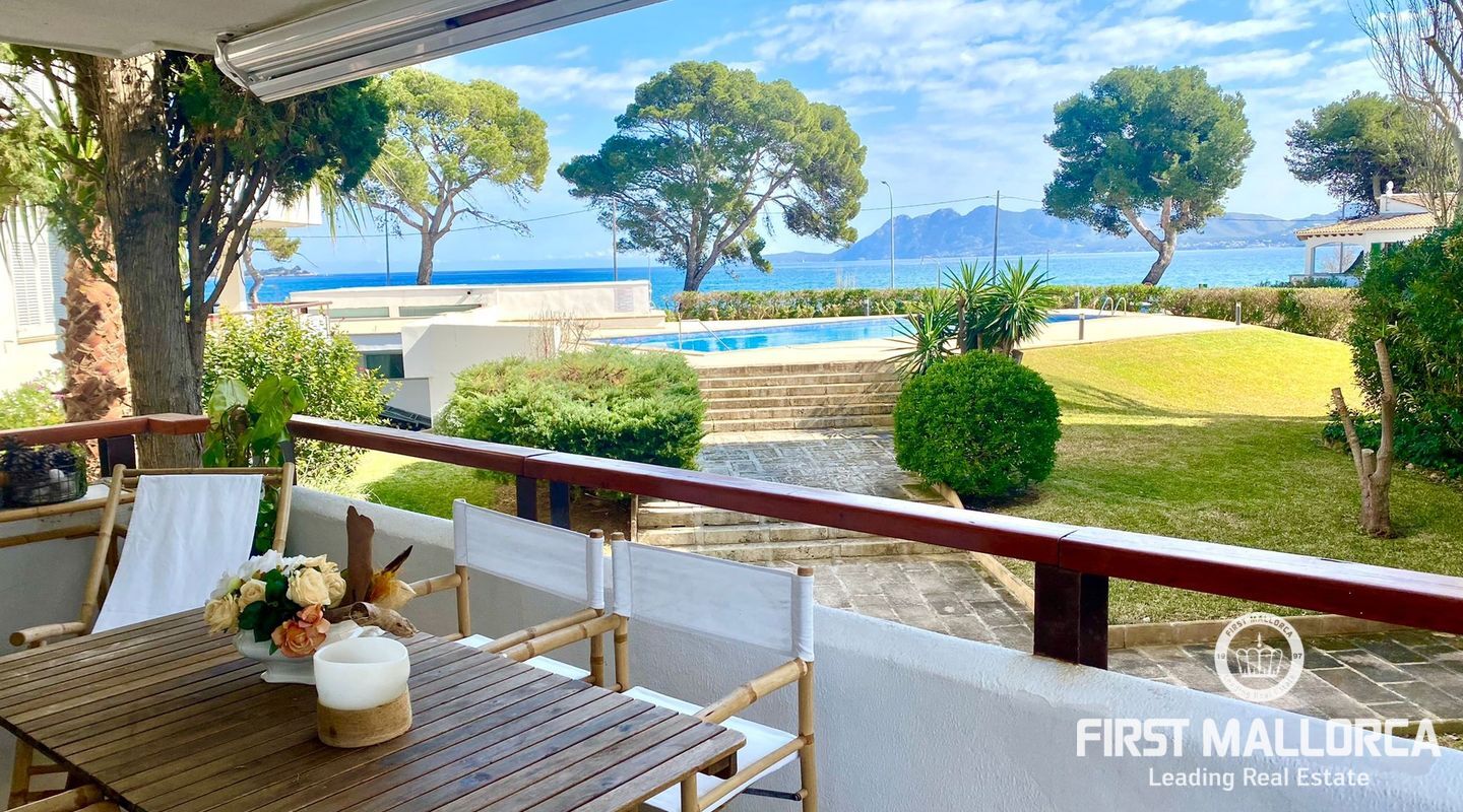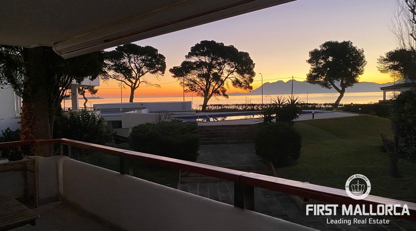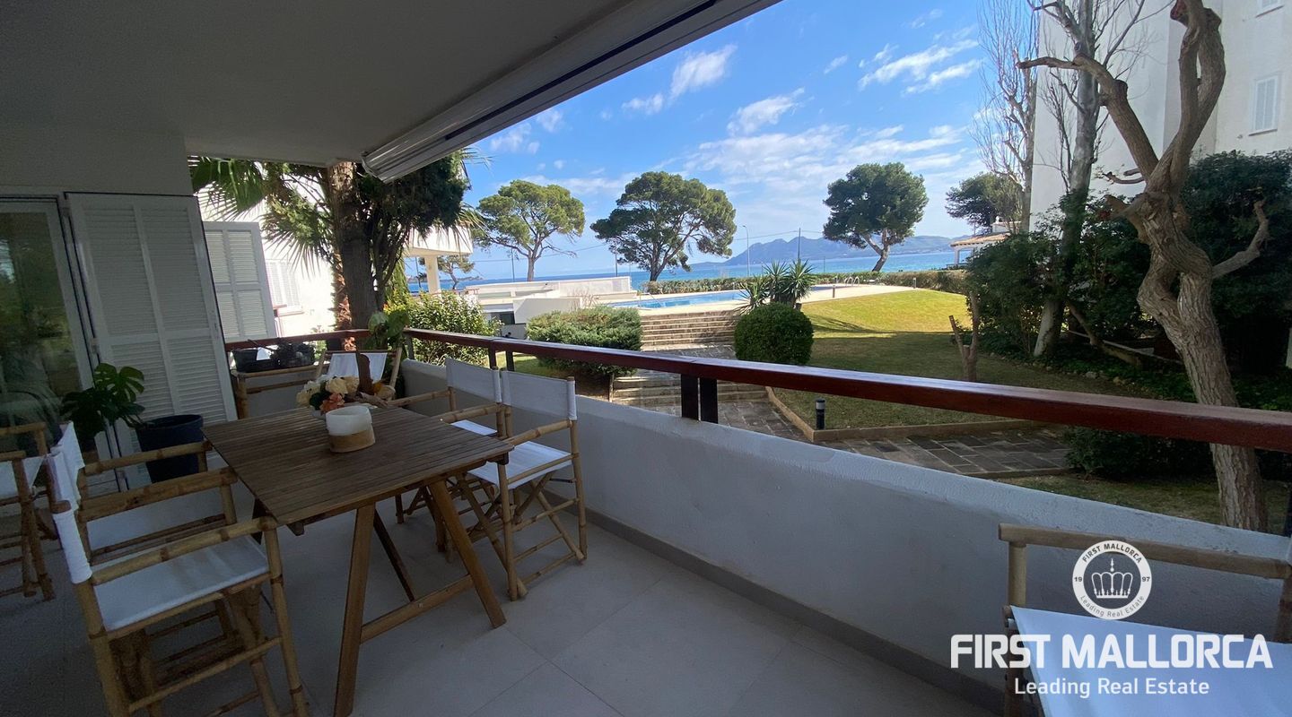 Beautiful frontline apartment on the first floor in Puerto Pollensa, Llenaire, with first class qualities. It consists of 145m2, distributed as 3 double bedrooms and 2 bathrooms (1 en-suite), fitted wardrobes, air conditioning hot/cold, living room, dining room, terrace, open equipped kitchen, wooden floors, climalit windows with double glazing, elevator, community pool, views from the terrace to the sea and the pool.