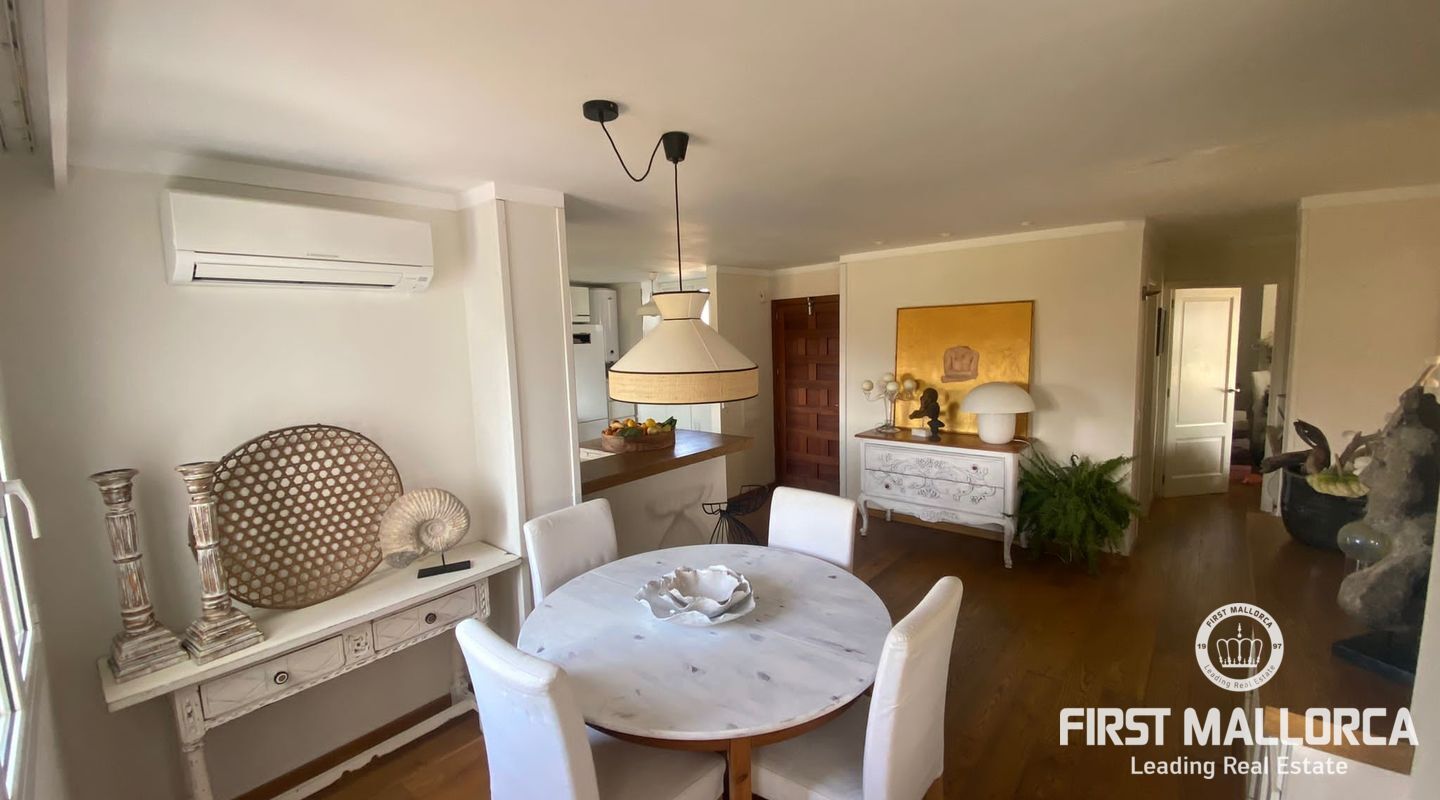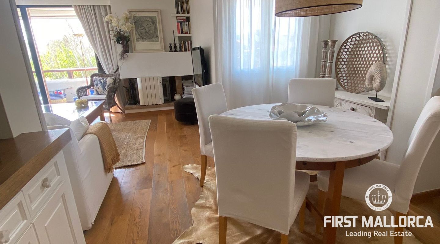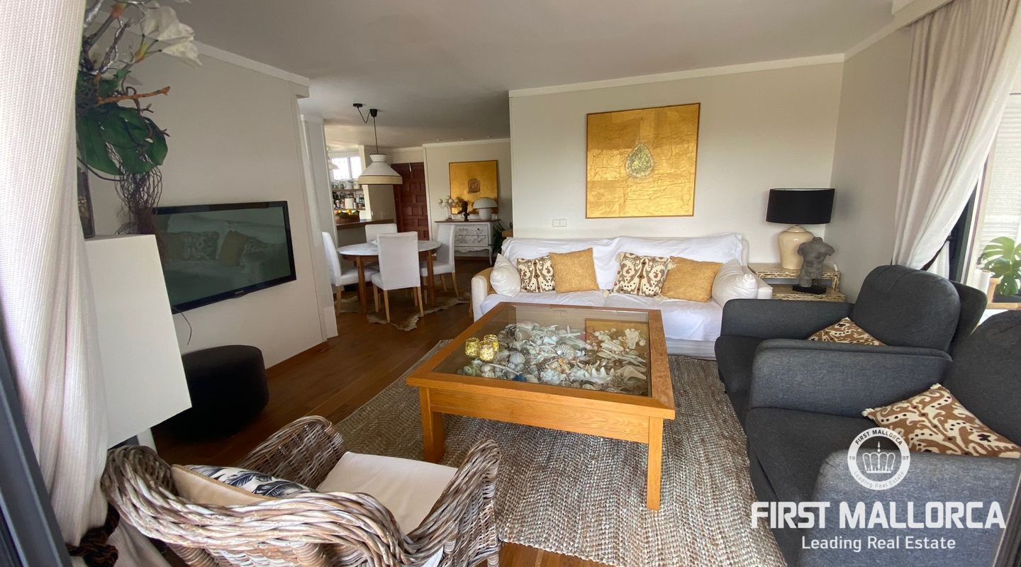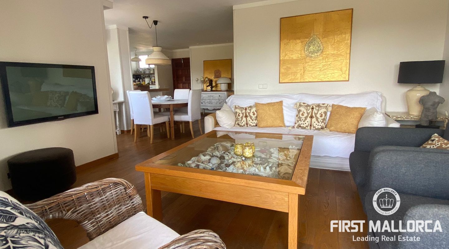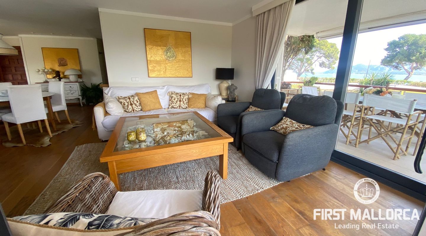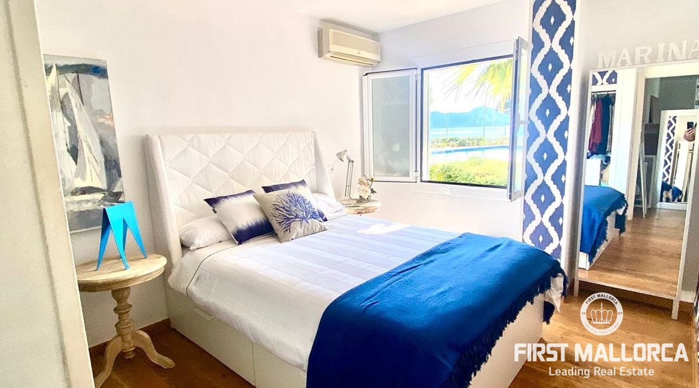 Beautiful frontline apartment on the first floor in Puerto Pollensa, Llenaire, with first class qualities. It consists of 145m2, distributed as 3 double bedrooms and 2 bathrooms (1 en-suite), fitted wardrobes, air conditioning hot/cold, living room, dining room, terrace, open equipped kitchen, wooden floors, climalit windows with double glazing, elevator, community pool, views from the terrace to the sea and the pool.