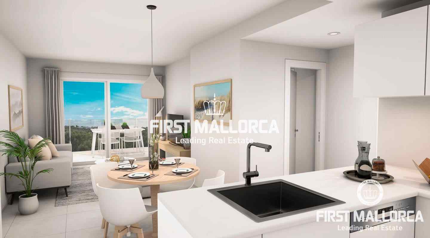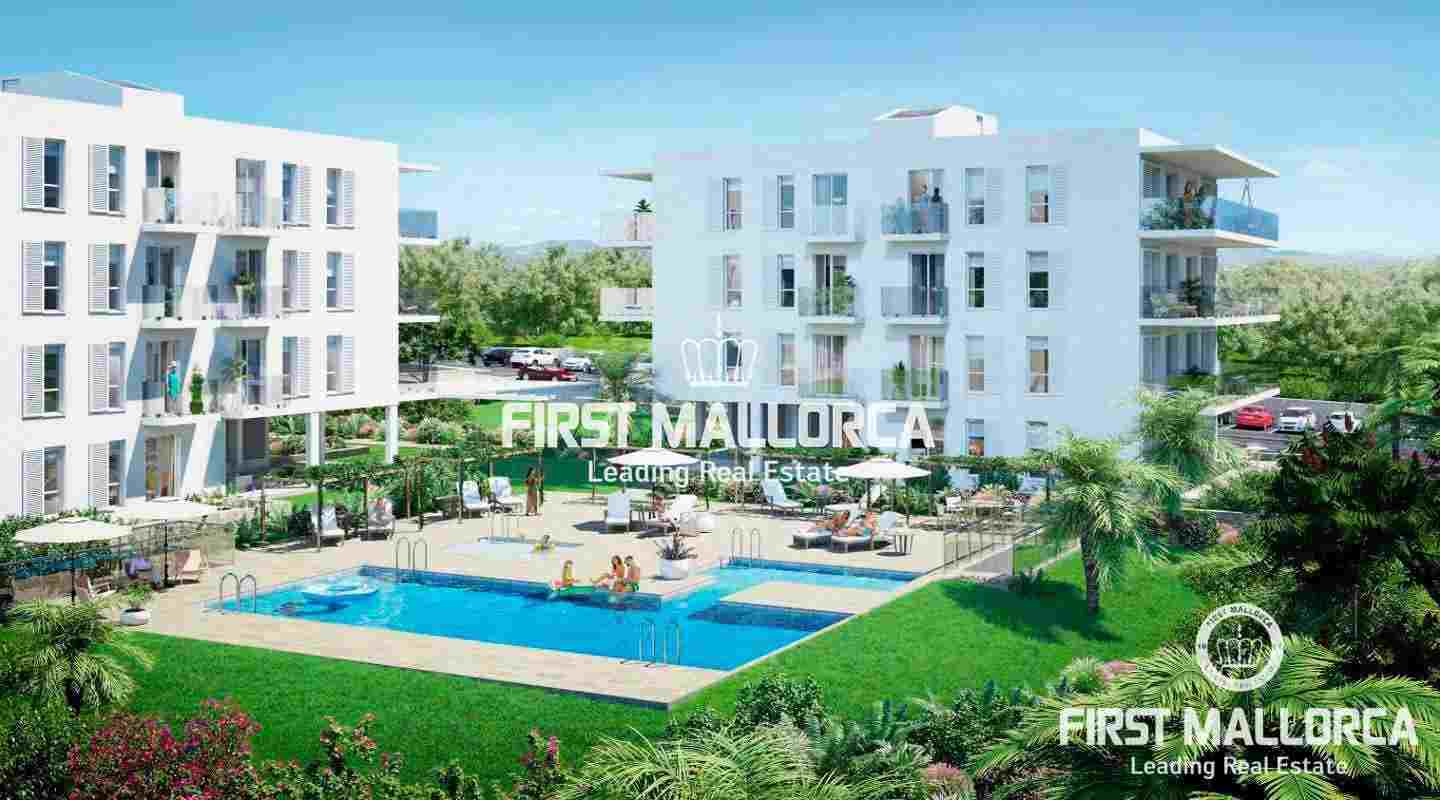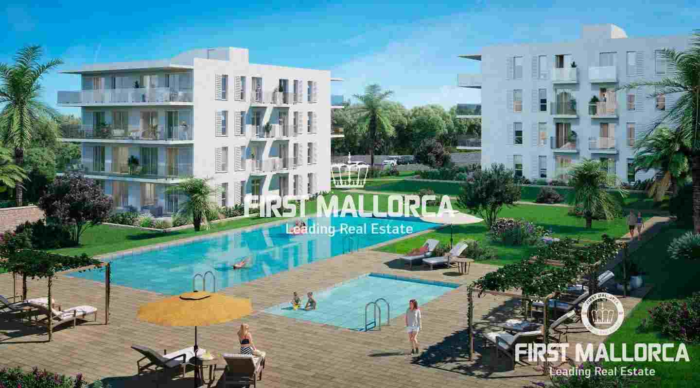 These modern Ibizan white apartments have very high quality furnishings. The distribution in the apartments inspire with plenty of space in 2 bedrooms with bathrooms (1 bathroom en suite), living room and large terraces or on the ground floor apartments, verandas with own garden area. Spacious gardens surround the area and 2 large community pools invite you to enjoy Mediterranean life. A parking space also belongs to each apartment.
