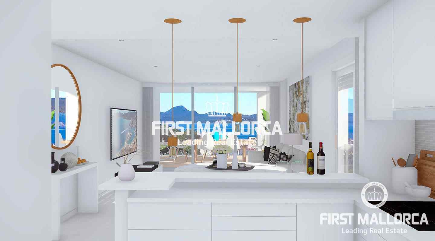 These new apartments in Cala Ratjada of approx. 100 m2 living space have two bedrooms and two bathrooms, both fully equipped. The ground floor apartments have a private outdoor area with a garden and terrace, the other apartments have a terrace of up to 26 m2. The building is surrounded by a garden with a pool, outdoor showers and sun terraces for communal use.