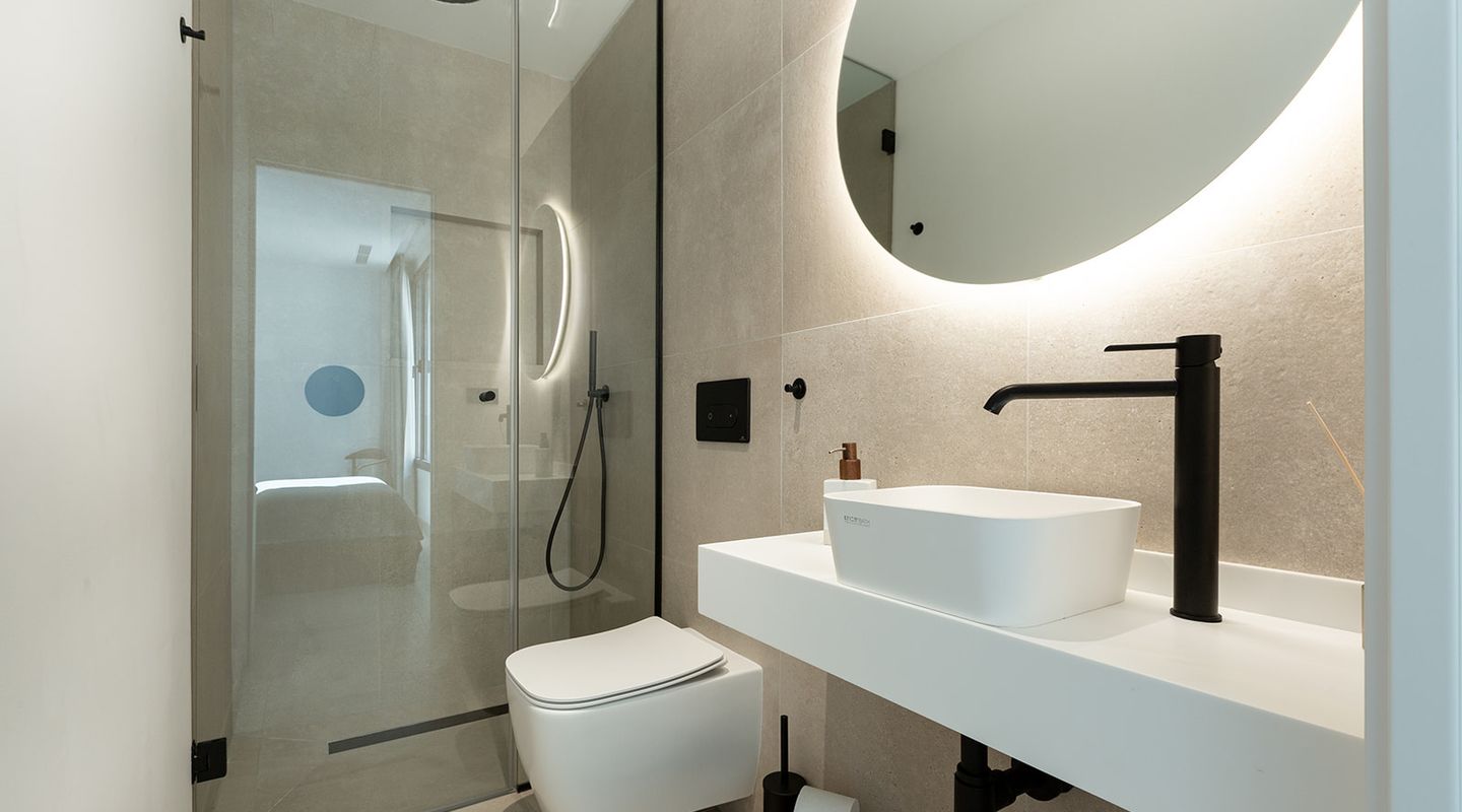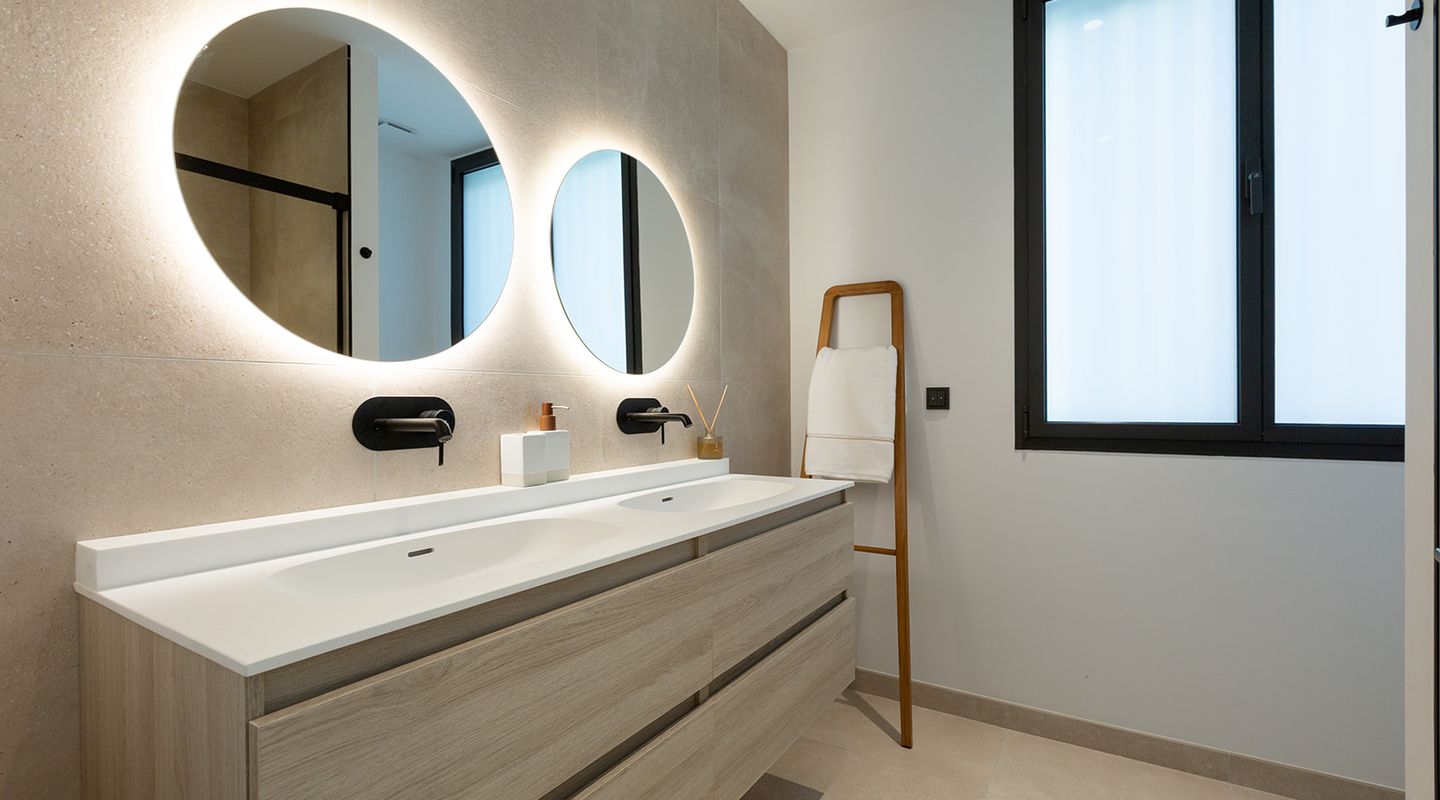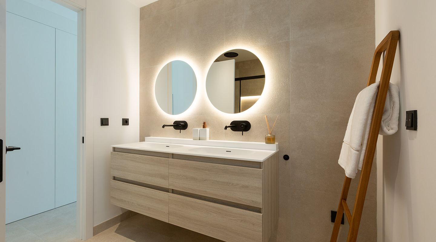 The apartment is completed with built-in wardrobes, a practical laundry room, and a private 13 m² storage room. Underfloor heating and air conditioning ensure a perfect temperature throughout the year, while Porcelanosa porcelain floors and indirect lighting add a touch of sophistication to every corner.