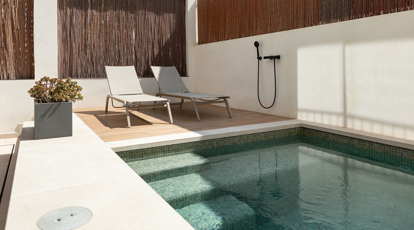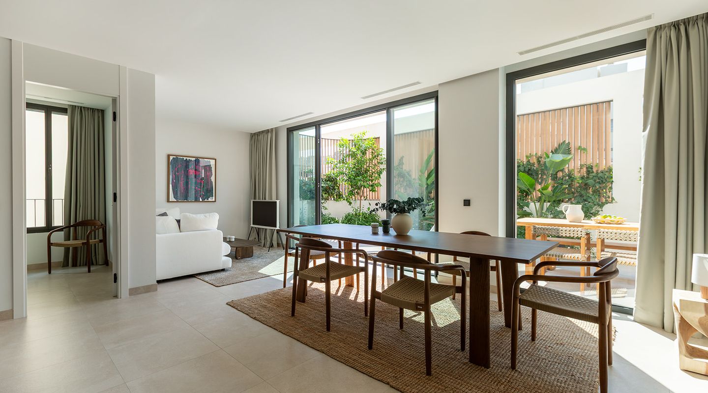 Inside, the 106 m² are thoughtfully laid out with a bright living area that opens to a kitchen island equipped with Miele appliances. There are two generously sized bedrooms, one with an en-suite bathroom, and designer bathrooms with high-quality finishes that add elegance and comfort.
