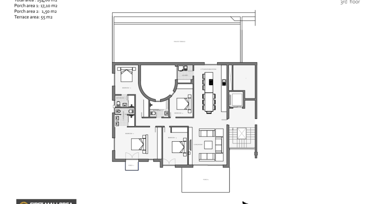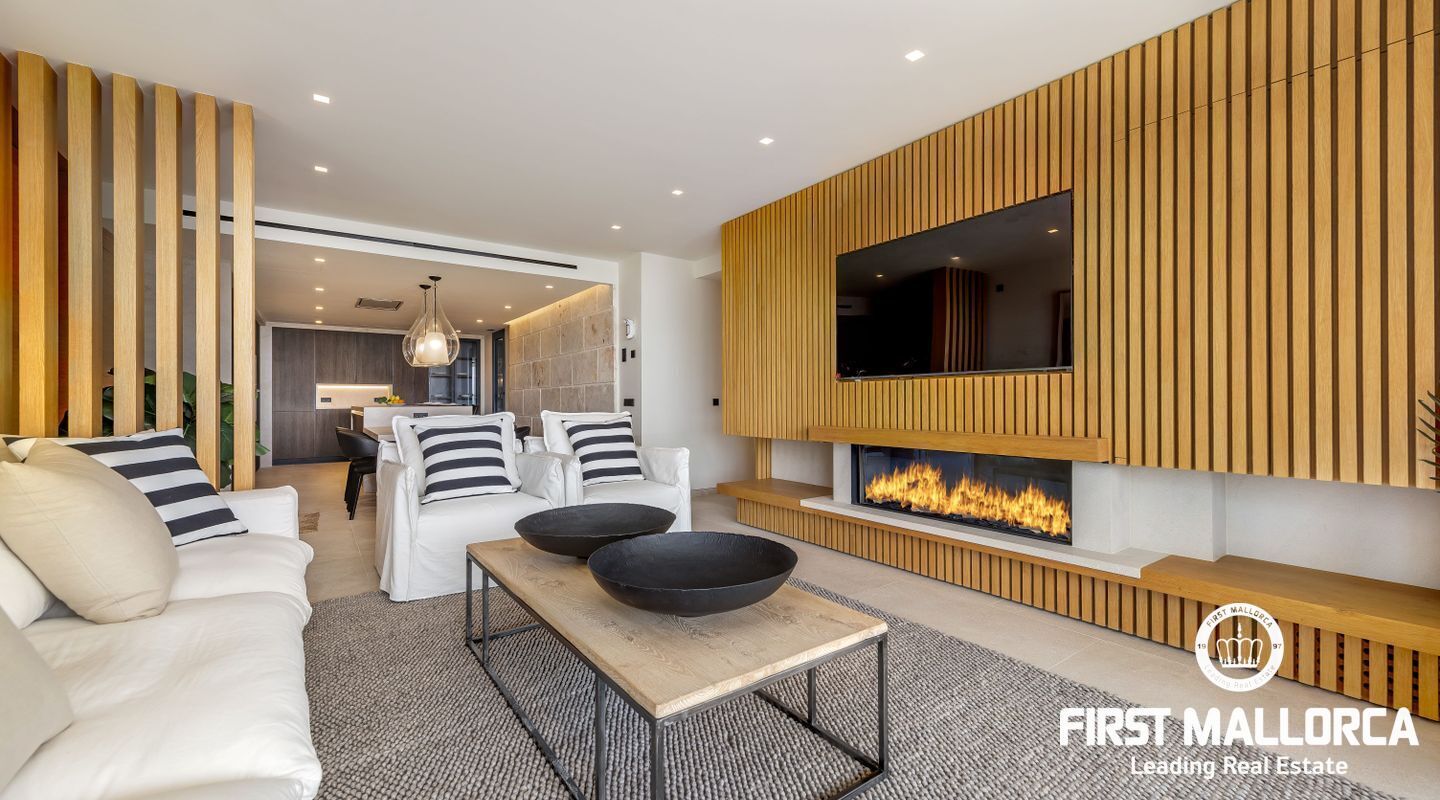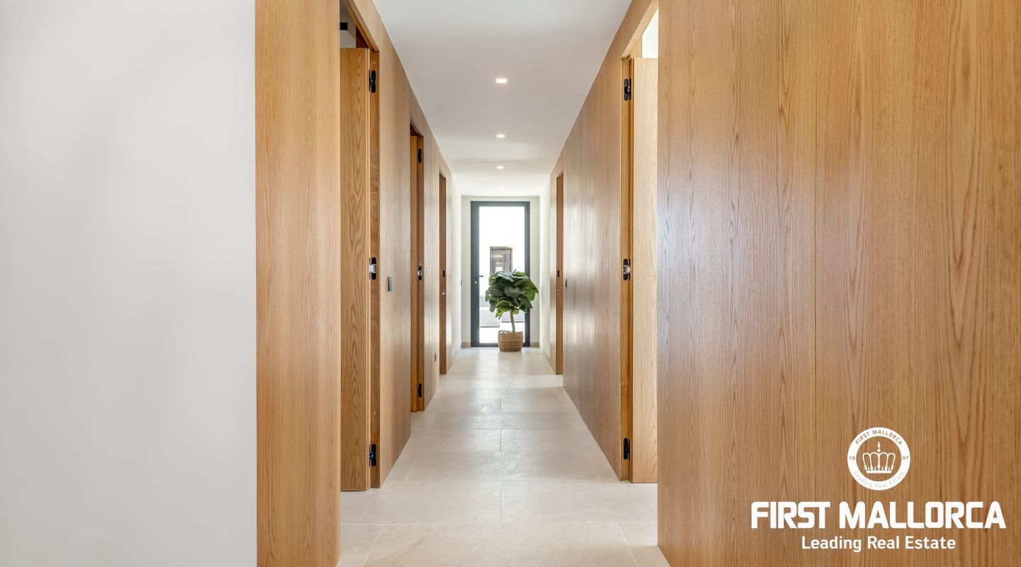 Development under construcion in a very quiet area in Santa Ponsa. It consists in 3 blocks with 8 apartments in each. All have 155m2 built area plus 18m2 of covered terrace. The ground floors have a private terrace/garden area of 90m2 and the penthouses a roof terrace of 90m2 as well with a private pool on it. All have 4 bedrooms and 3 bathrooms (being the master on Suite). The technology used in the construction has a double flow ventilation system that allows the house to be ventilated without suffering discomfort due to noise or temperature changes as well as underfloor heating. Nice styling of interiors with wooden appliances, stone floors, big open kitchen with island fitted with Miele appliances. The building has a large infinity swimming pool, lift and underground parking. Prices from 1.443.000€. Do not hesitate contacting us to see this fantastic complex.