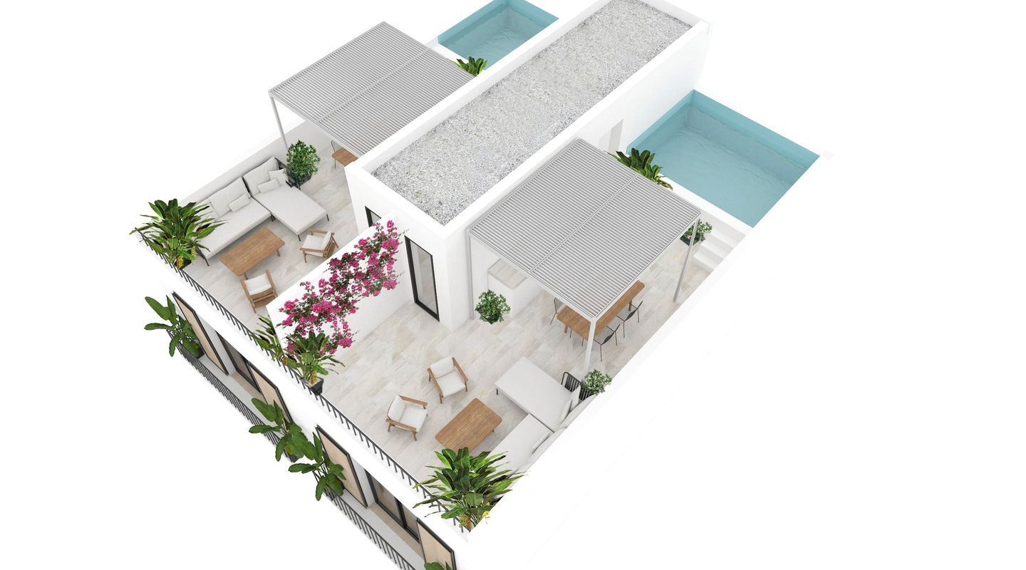 The project consists of a residential building that houses three single-family homes. All units will have 2 bedrooms, 2 bathrooms, and will give the feeling of being an urban oasis thanks to their private terraces pools. Unit A will encompass the entire first level, while units B and C will be triplexes with rooftop pools.
