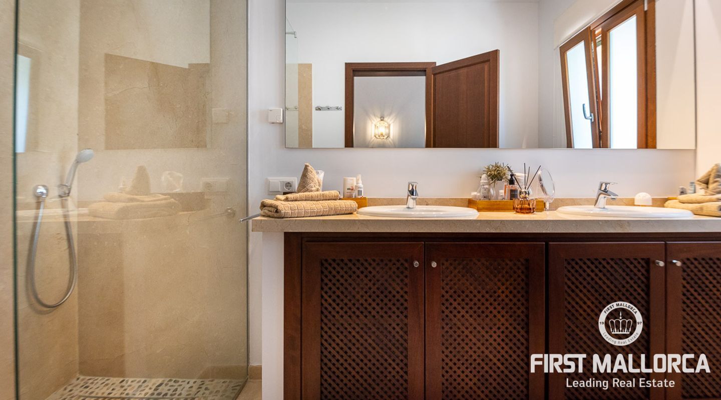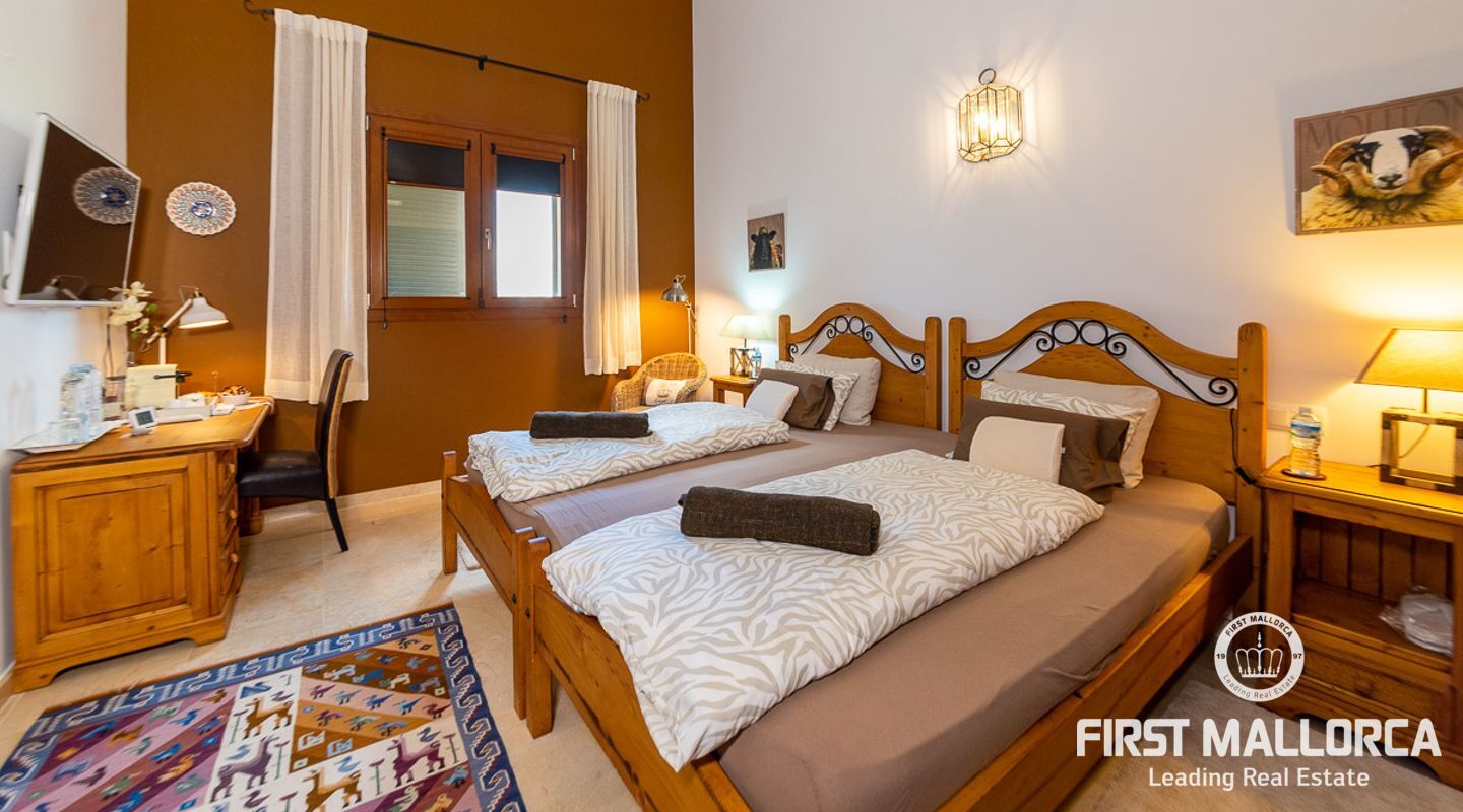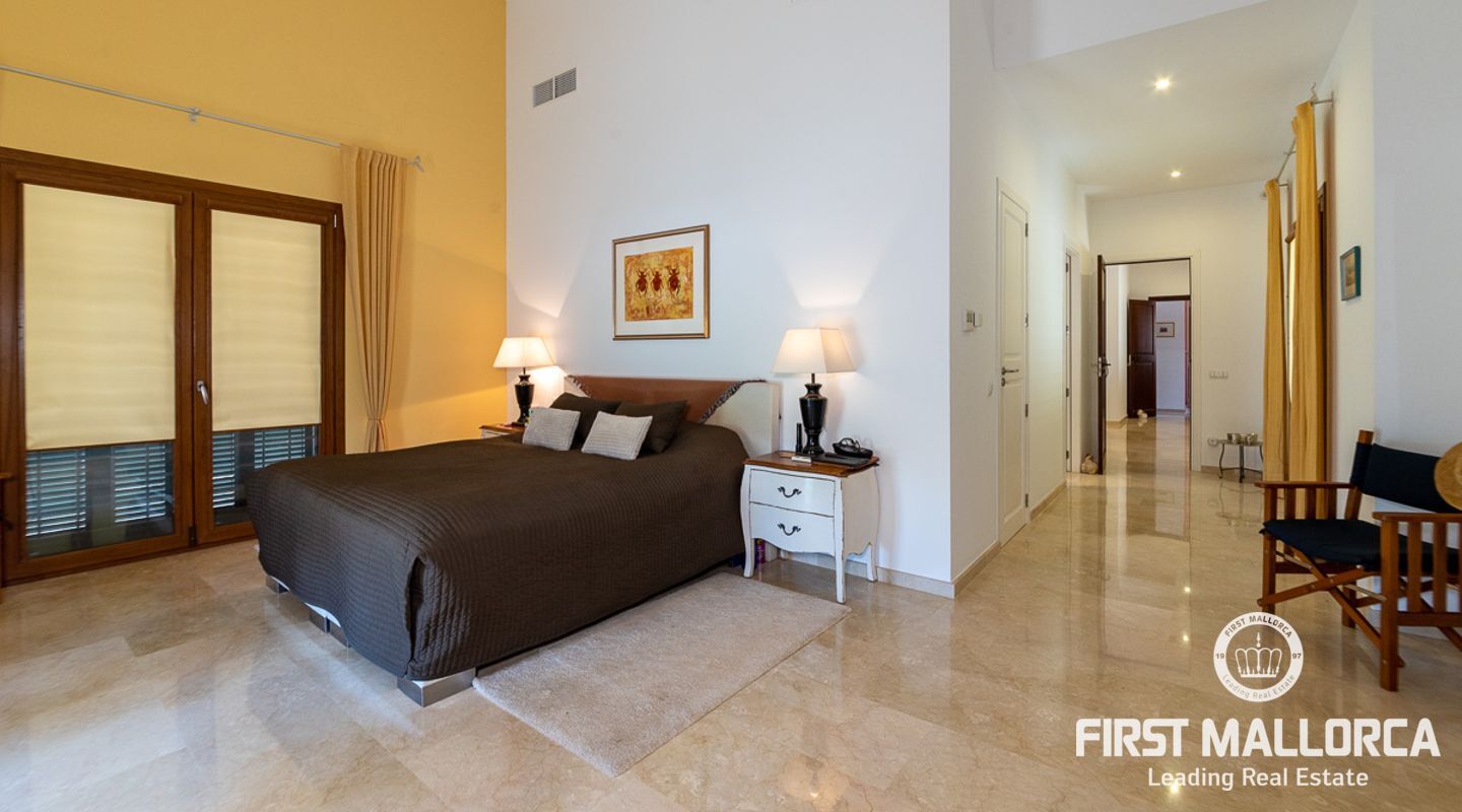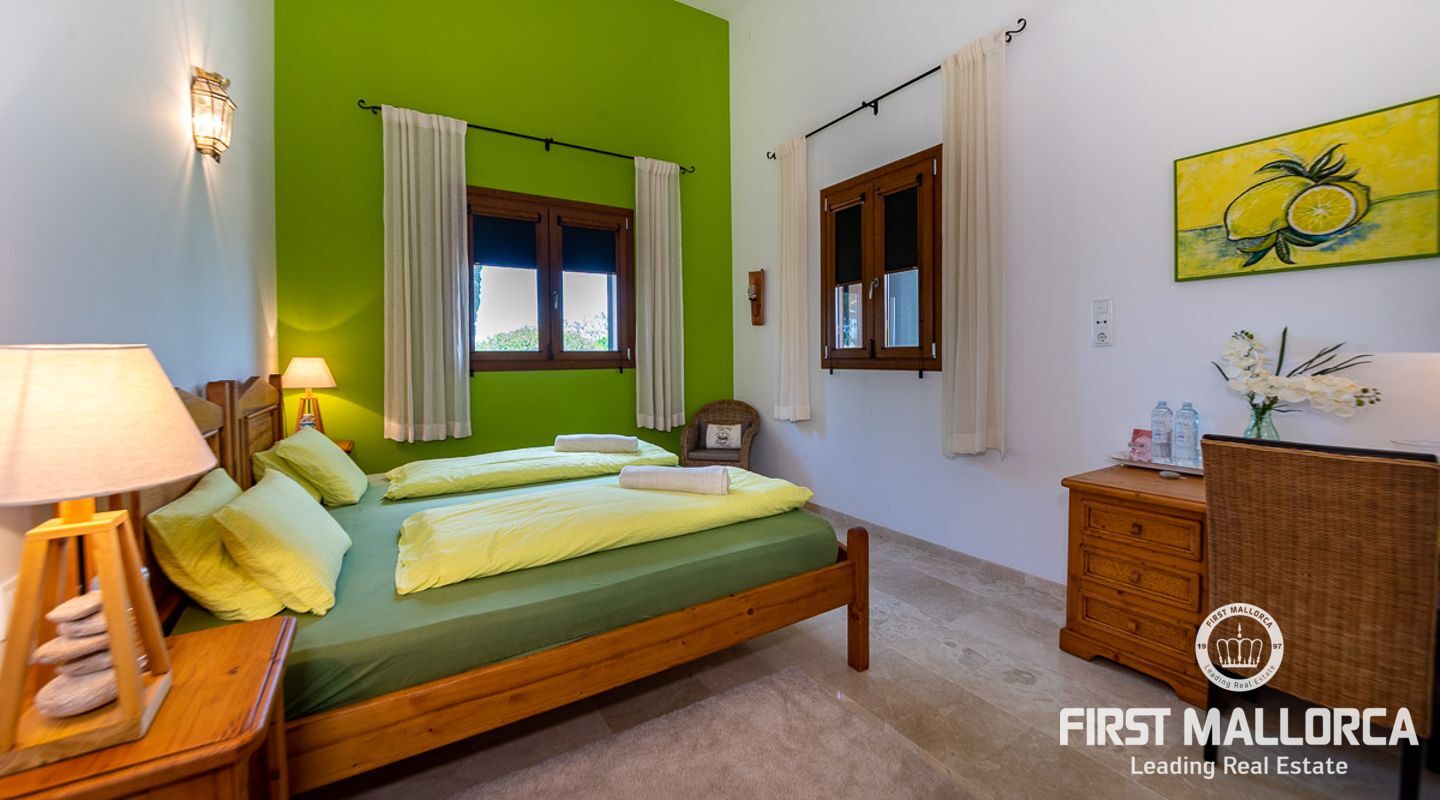 The house itself is divided into a living and a sleeping wing, connected by a spacious hallway with plenty of storage space. To the left, you will find the open, 50 m² kitchen, adjacent to the living room with fireplace. From here you have access to a covered terrace on natural stone pillars as well as the pool and BBQ area. In the bedroom wing on the right side of the house you will find two guest bedrooms with en-suite bathrooms, as well as the master bedroom with private bathroom, dressing room and terrace to the pool area.