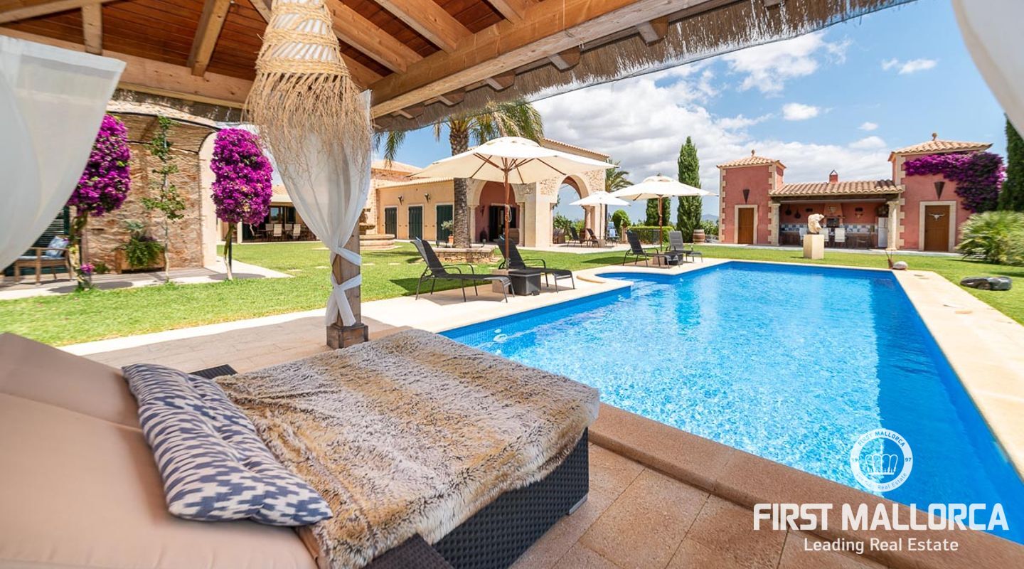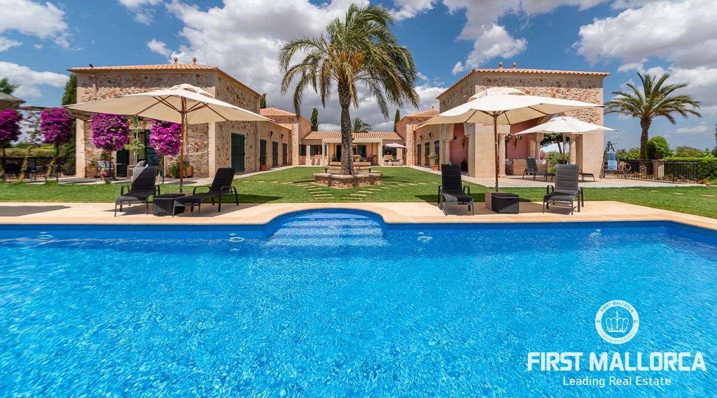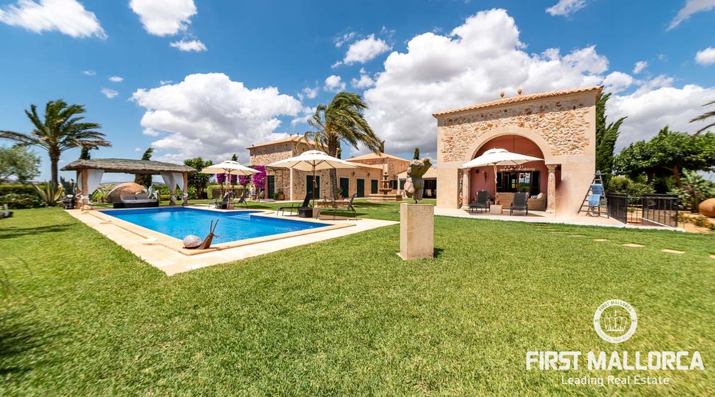 The house itself is divided into a living and a sleeping wing, connected by a spacious hallway with plenty of storage space. To the left, you will find the open, 50 m² kitchen, adjacent to the living room with fireplace. From here you have access to a covered terrace on natural stone pillars as well as the pool and BBQ area. In the bedroom wing on the right side of the house you will find two guest bedrooms with en-suite bathrooms, as well as the master bedroom with private bathroom, dressing room and terrace to the pool area.