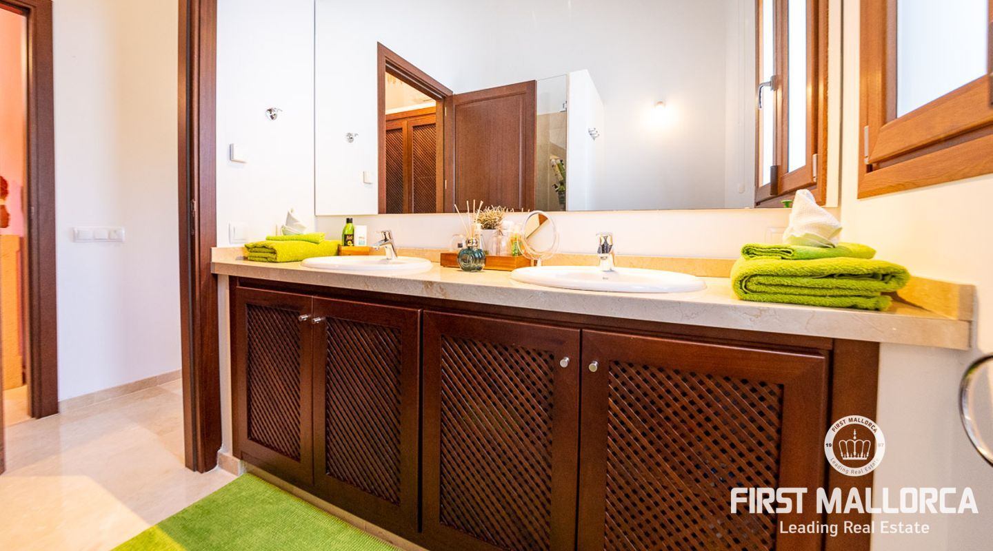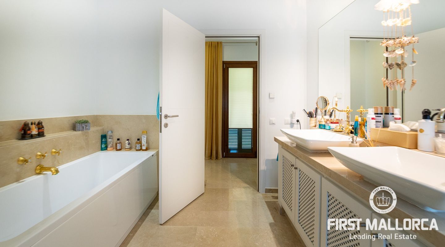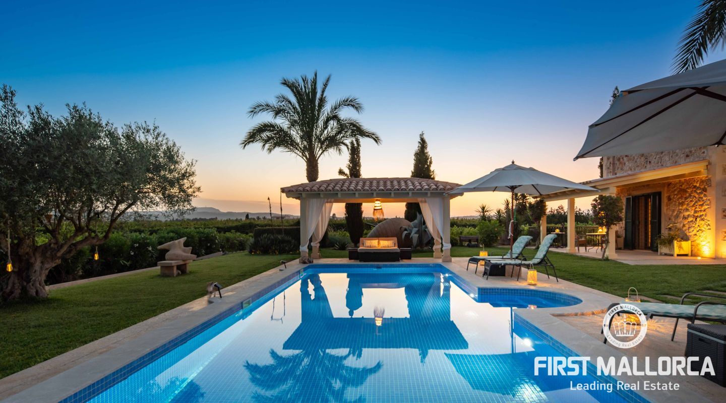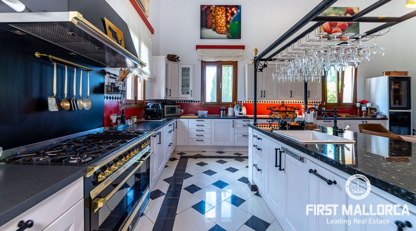 The house itself is divided into a living and a sleeping wing, connected by a spacious hallway with plenty of storage space. To the left, you will find the open, 50 m² kitchen, adjacent to the living room with fireplace. From here you have access to a covered terrace on natural stone pillars as well as the pool and BBQ area. In the bedroom wing on the right side of the house you will find two guest bedrooms with en-suite bathrooms, as well as the master bedroom with private bathroom, dressing room and terrace to the pool area.