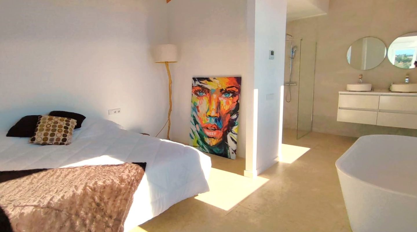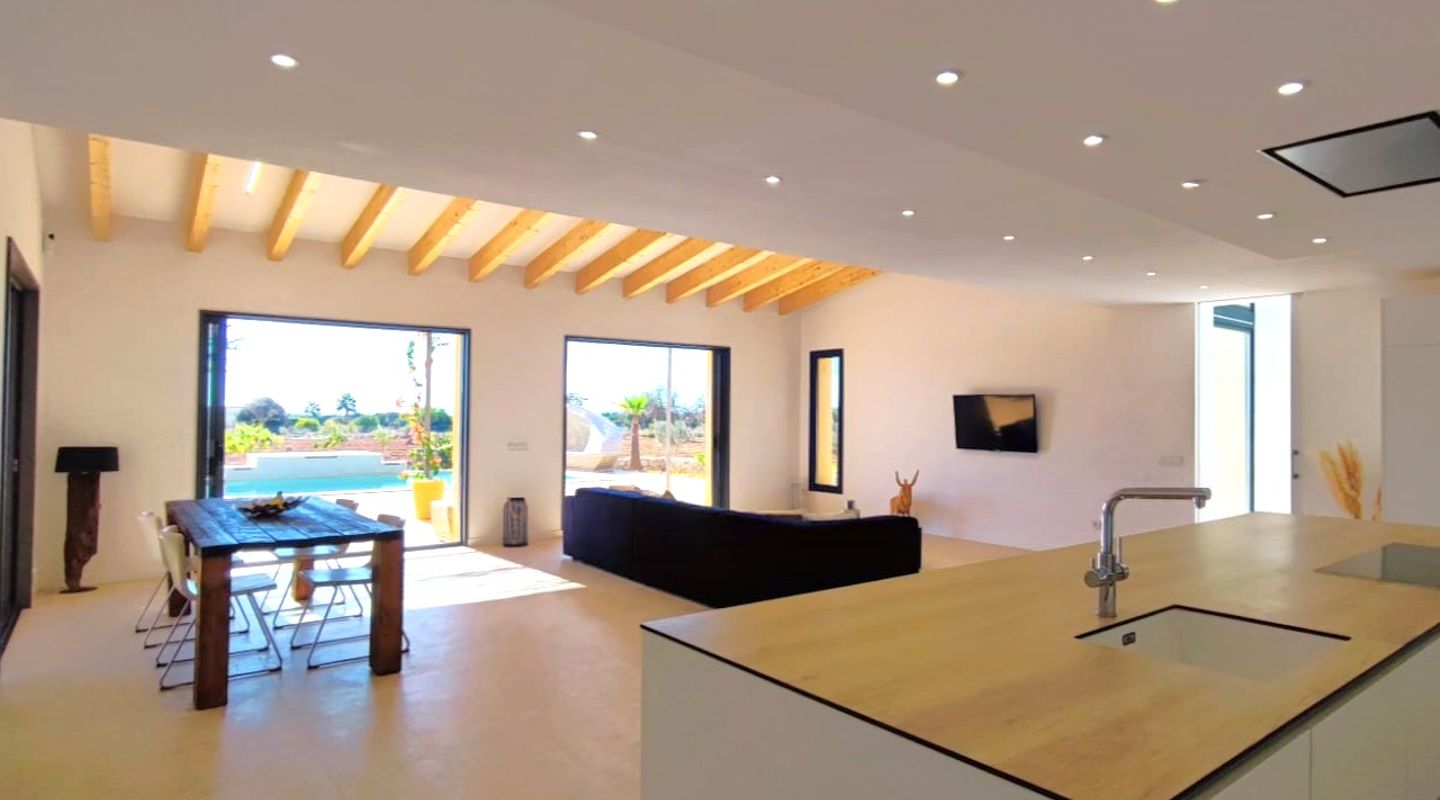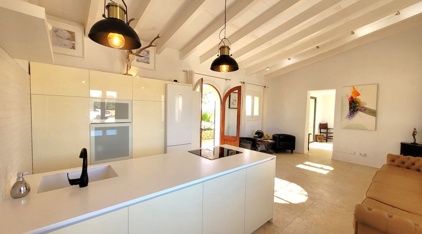 Modern Amenities: A brand-new 340 m² home on a 27,000 m² plot with 4 bedrooms, 4 bathrooms, a garage for two cars, and a laundry room. Flexible Layout: Designed to allow part of the house, including the fourth bedroom, to function as an independent unit with its own bathroom and terrace. Expansive Living Spaces: An 80 m² sunlit living room with designer windows that fully retract, blending indoor and outdoor spaces seamlessly. Luxury Touches: The master bedroom boasts exposed beams, an en-suite bathroom, and a freestanding bathtub with views of Cabrera Island. Outdoor Highlights: A 271 m² terrace with a 36 m² pool featuring a beach area, jacuzzi jets, and waterfalls. Licenses for vacation rentals (up to 8 guests). Also licenses for farming, and animal husbandry. Two cisterns (40,000-liter capacity) and a newly approved well for high-quality groundwater. Ready for solar panel installation.