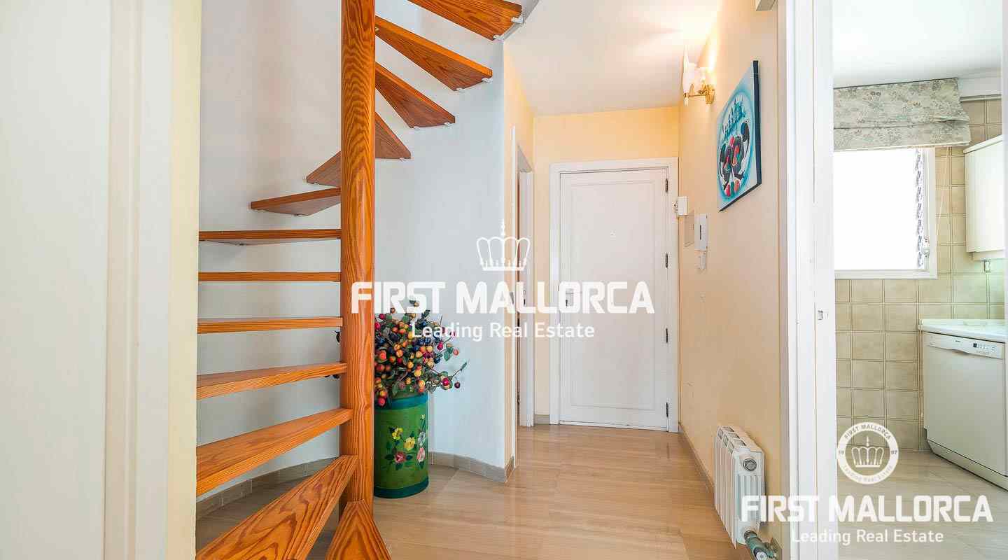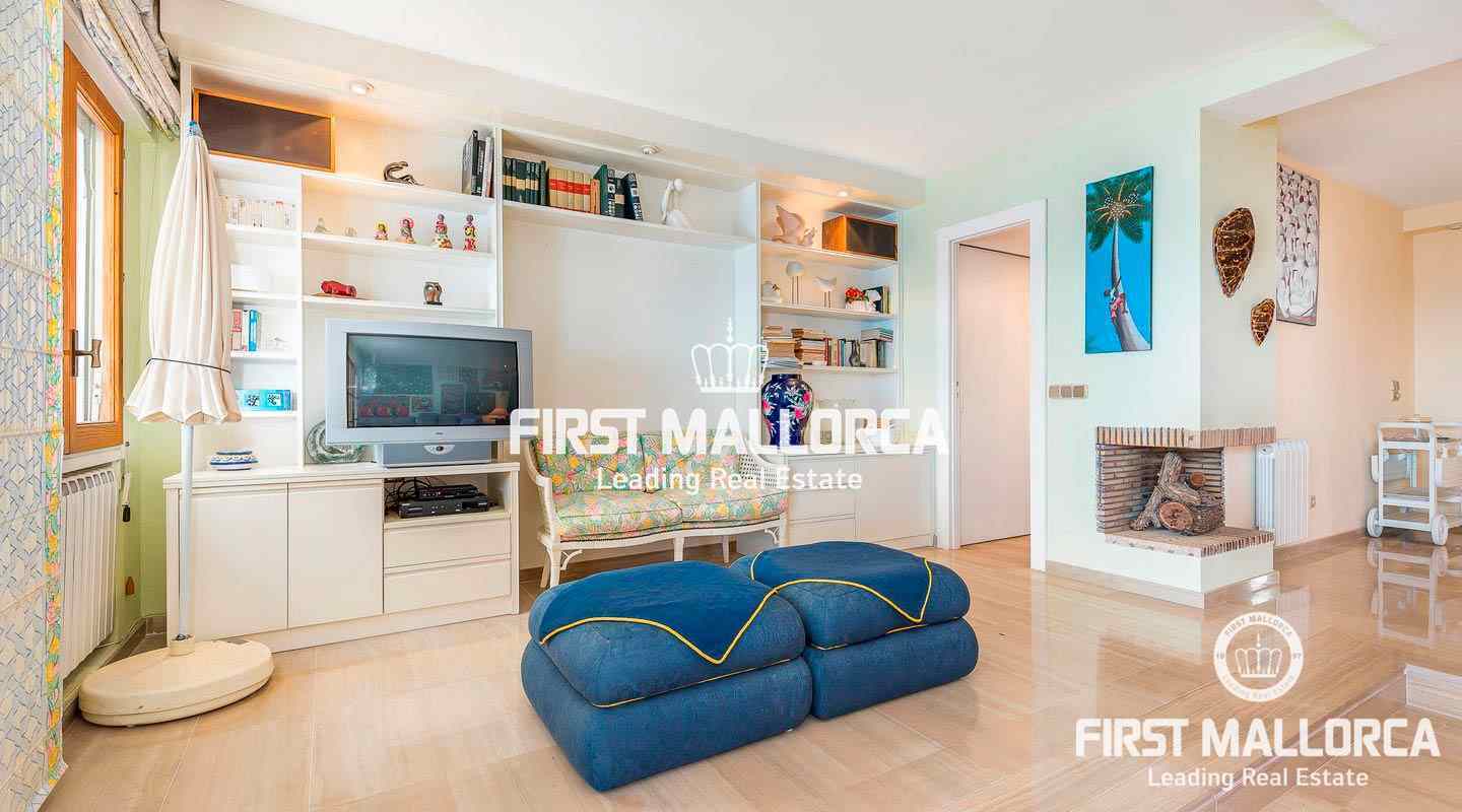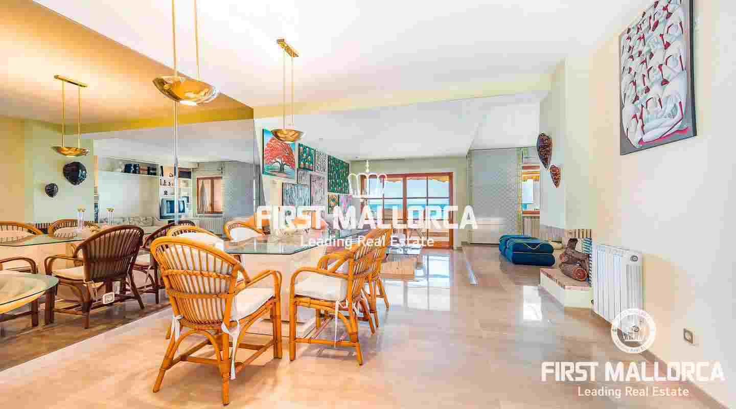 The apartment, even though being in good condition, would probably be renovated by a new owner as a property in this location deserves to be put into a mint condition. Also, as the apartment previously had 3 bedrooms it would be possible to re-convert it. The entrance level has the generous living-dining room with access to a seafront terrace, an independent kitchen and one bedroom with adjacent bathroom. The entire upper level is occupied by the master bedroom suite, a spacious bathroom and a large roof terrace. Please ask us for more pictures of this property! Additional features of the fine example of Mallorca seafront property include air conditioning h/c, central heating, marble flooring, fireplace, underground parking and a store room.
