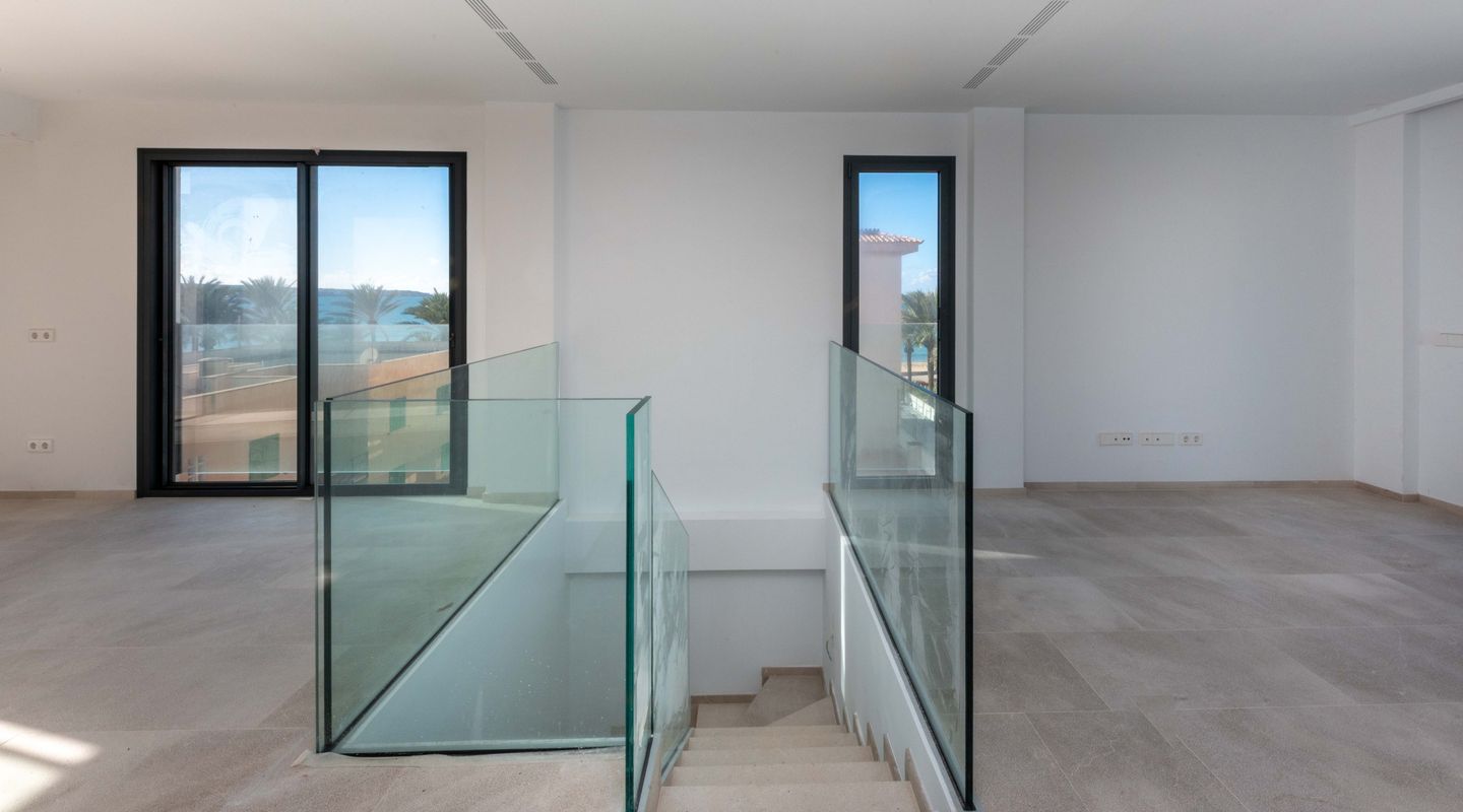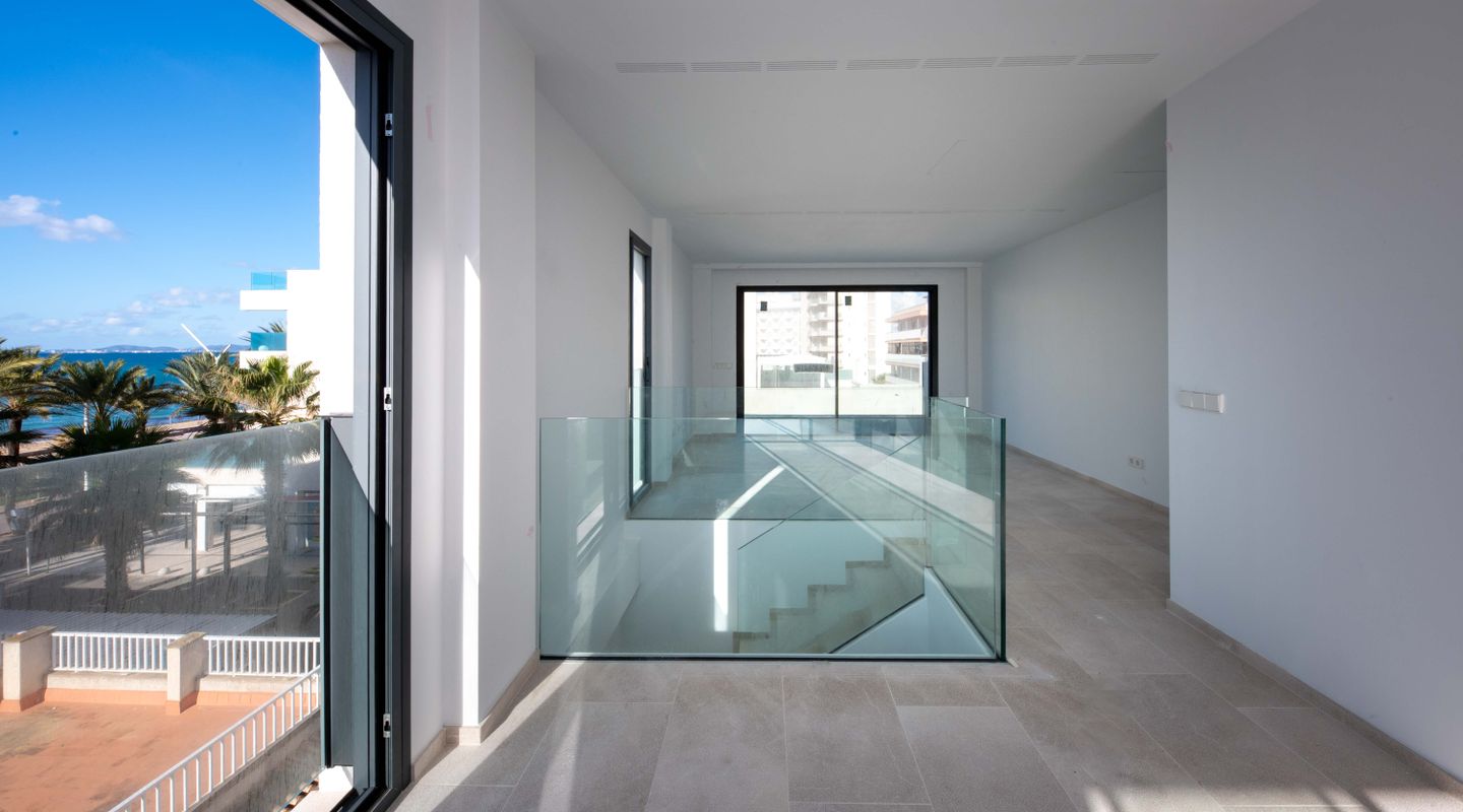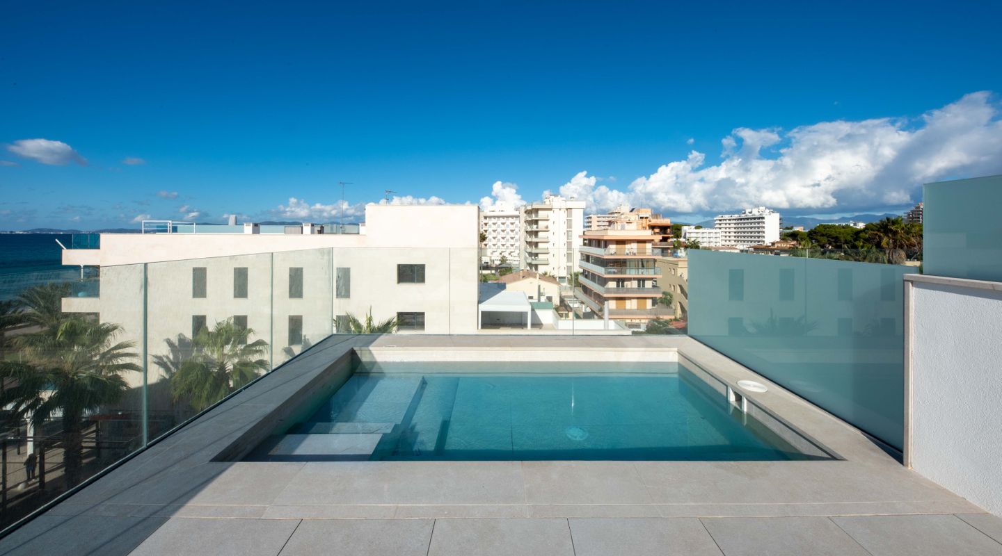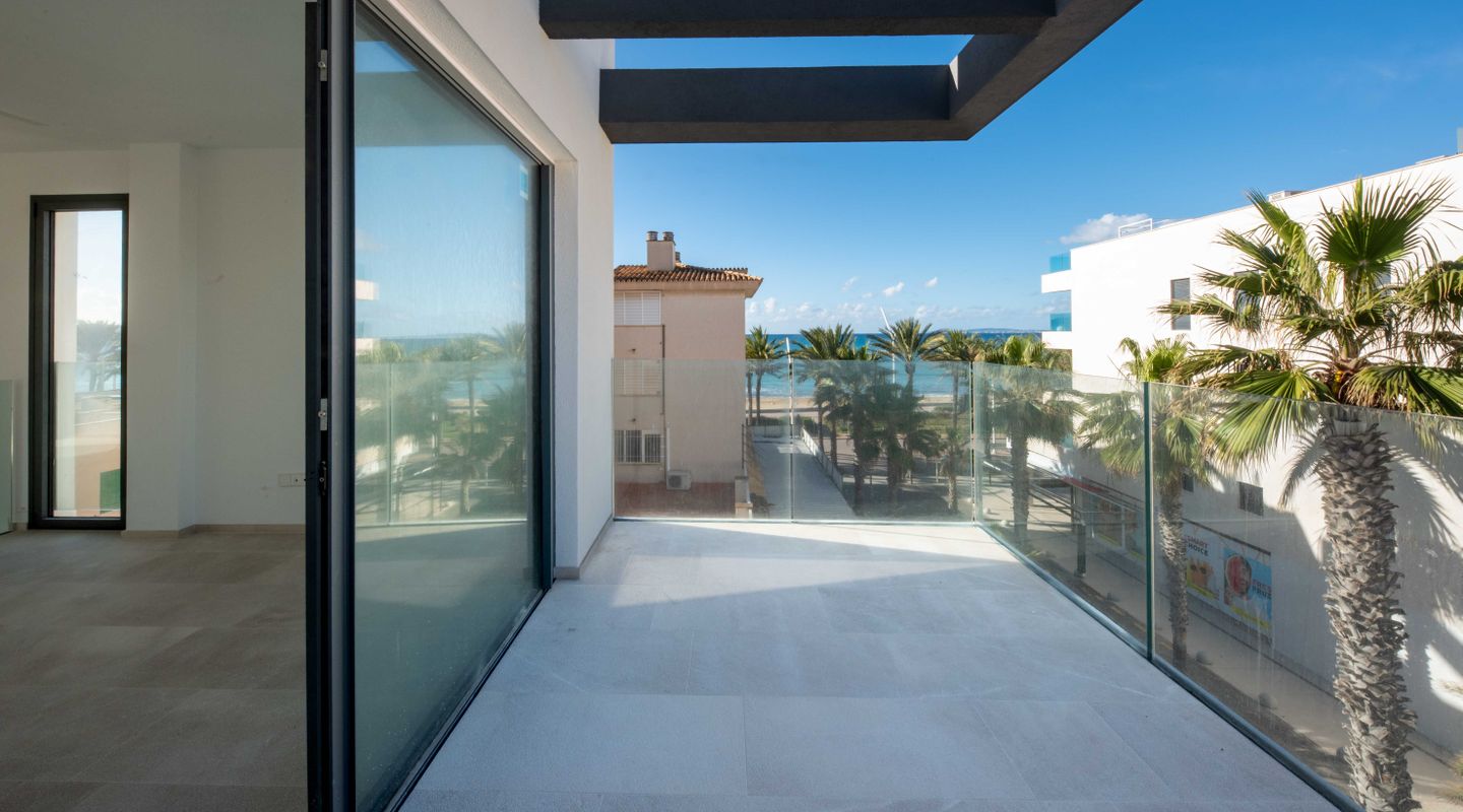 Exclusive new-build duplex penthouse just 50 metres from the sea, combining contemporary design, comfort and an unbeatable location. The property has 2 spacious double bedrooms and 2 full bathrooms, one of which is en suite. It stands out for its spectacular private rooftop terrace with a swimming pool, ideal for relaxing while enjoying breathtaking sea views. The property also has a communal garden and swimming pool, creating a peaceful and exclusive residential environment. It includes a private parking space with the option to purchase additional spaces. The lift provides direct access to both floors of the penthouse. The property has several terraces, a reinforced door, high-efficiency exterior carpentry with double glazing, thermal break and soundproofing. It is equipped with high-performance ducted air conditioning, oil-fired central heating and underfloor heating throughout the house. The kitchen is fully furnished with high-quality materials. Very bright and completely exterior, this property includes a storage room, chill-out area and high-quality finishes. Its location is privileged, close to all amenities: pharmacies, bars, restaurants, schools, golf course, airport and much more. A unique opportunity to live in style by the sea or as a high-value investment.