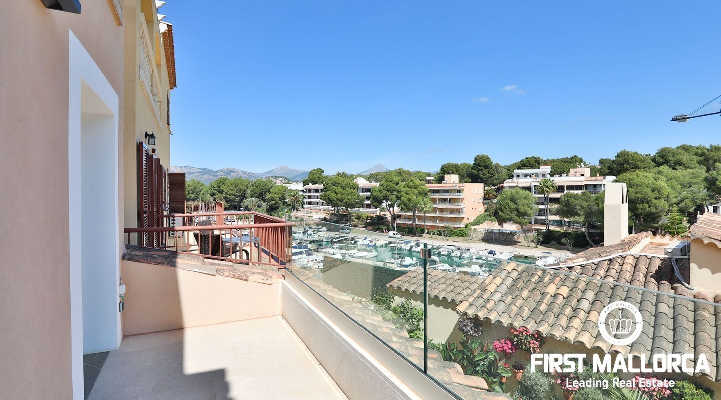 This exquisite property offers delightful sea views and is ideally situated by the charming port in Santa Ponsa, within a serene residence featuring a pool and garden.
