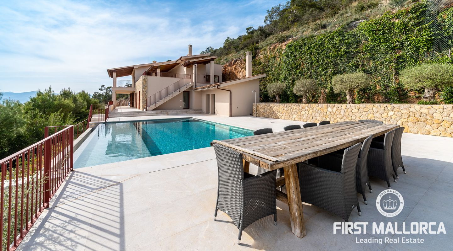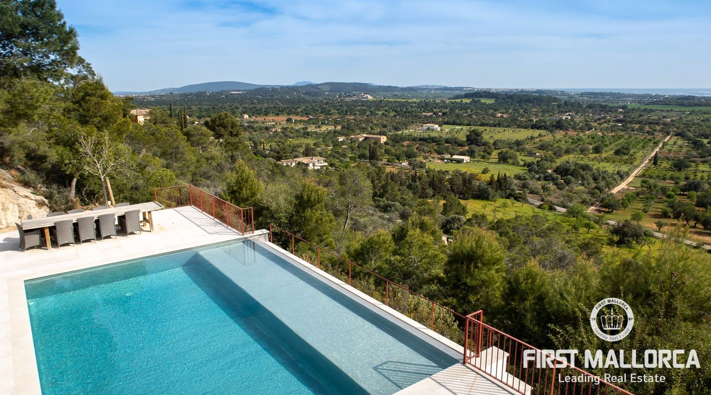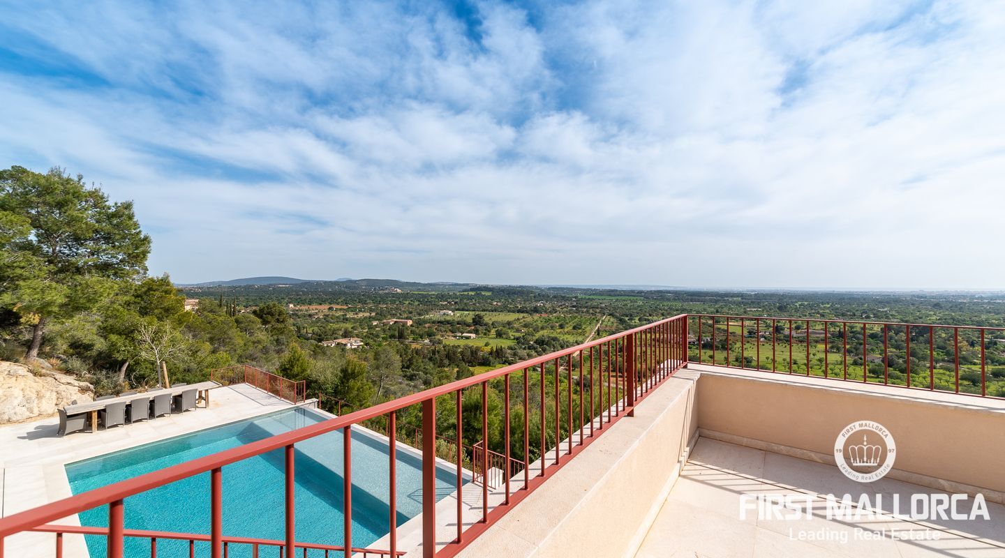 This villa of 460 sq. meters sits atop of a hill and land of 30.000 square meters and its built with the best quality materials. It is a two storey house. On the main level you have 3 double bedrooms with bathrooms 3-en suite plus a walk-in closet, guest room, garage for 3cars, utility room, barbecue-kitchen in the pool area with an outdoor bathroom. On the upper floor large living/dining area, kitchen with great quality brands, master bedroom with bathroom en suite plus a walk-in closet, guest toilet.