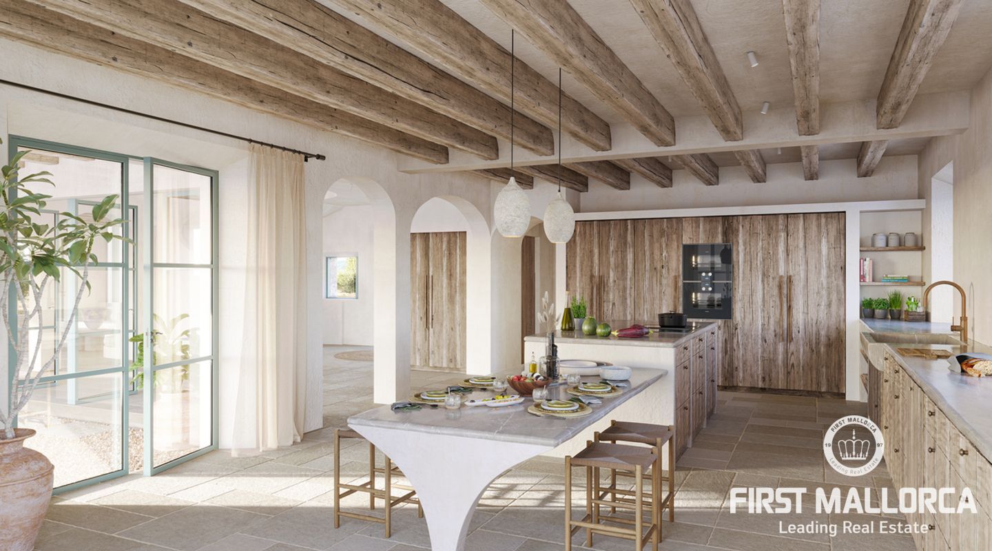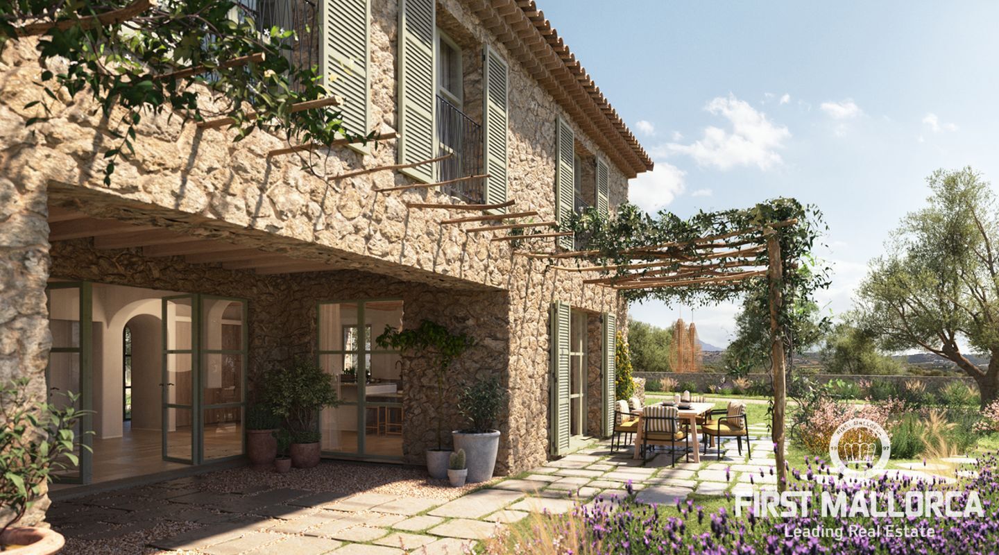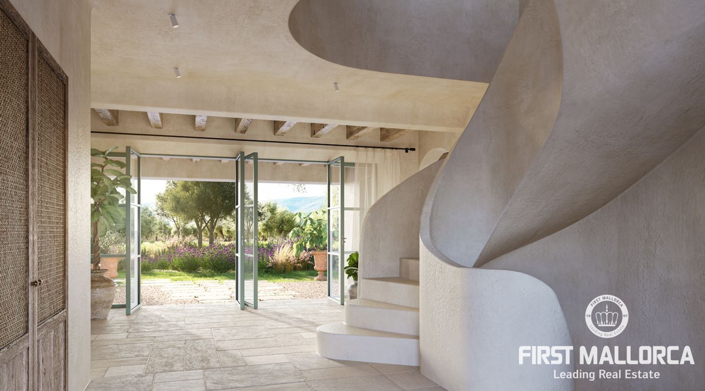 Situated in the heart of Mallorca, Alaró, this new estate is a testament to the timeless allure of Majorcan architecture, harmonising tradition with modern living. The project sprawls across a vast land area of more than 16,000 m2, blending rustic charm with contemporary elegance. Throughout the entire house, beautiful wooden beams extend from the ceiling, creating a rustic and charming atmosphere. The rooms and bedrooms are designed with a simple yet elegant character, adorned in natural hues. Large windows illuminate the spaces, seamlessly merging the interior with the surrounding nature, providing a remarkable connection to the outdoors. The extraordinary spiral staircase gracefully connects the ground floor to the upper level. On the ground floor, an inviting entrance hall sets the tone, leading to a stylish powder room and a hallway that seamlessly connects various living spaces. A well-designed pantry offers practical storage solutions, and the kitchen/dining area becomes a spacious culinary hub. The living room and chill-out area provide versatile and cozy retreats. Access to a terrace on this level invites al fresco dining amidst the beauty of the outdoors. The first floor reveals an inviting hallway facilitating easy access to bedrooms and the master suite. The master bedroom, with an adjoining dressing room and spa-like bathroom, promises a luxurious escape. Additional bedrooms, each with its own dressing and bathroom, offer comfort and style. The basement unfolds as a practical space with stairs connecting levels, a laundry room for essential chores, machinery housing utilities, a rainwater deposit for sustainability, and a spacious garage ensuring secure parking. Complimenting this stunning property is a swimming pool, featuring comfortable sofas and loungers a perfect retreat for relaxation. Every element is thoughtfully crafted to harmonize the home with its natural surroundings, creating a serene and inviting ambiance.
