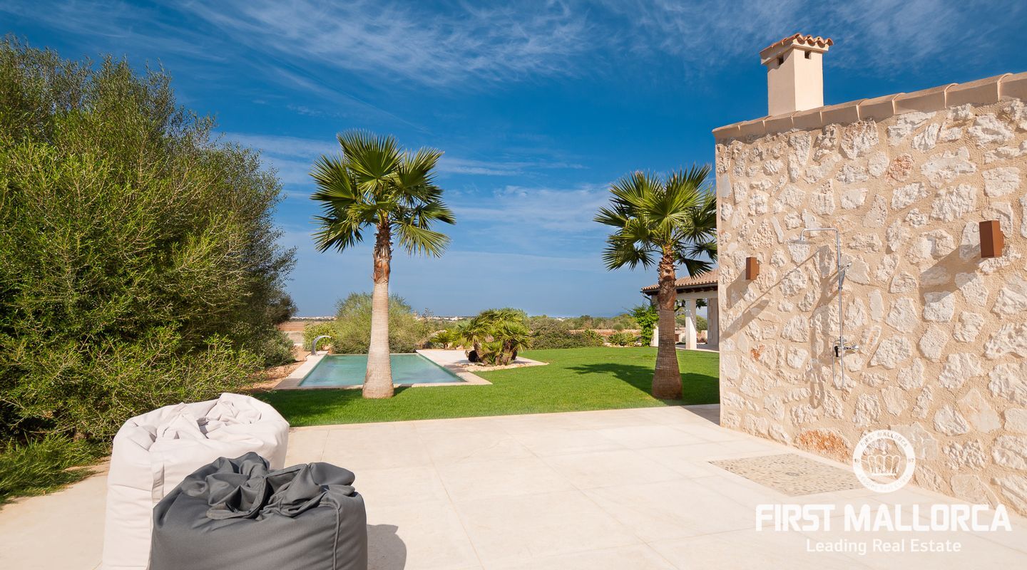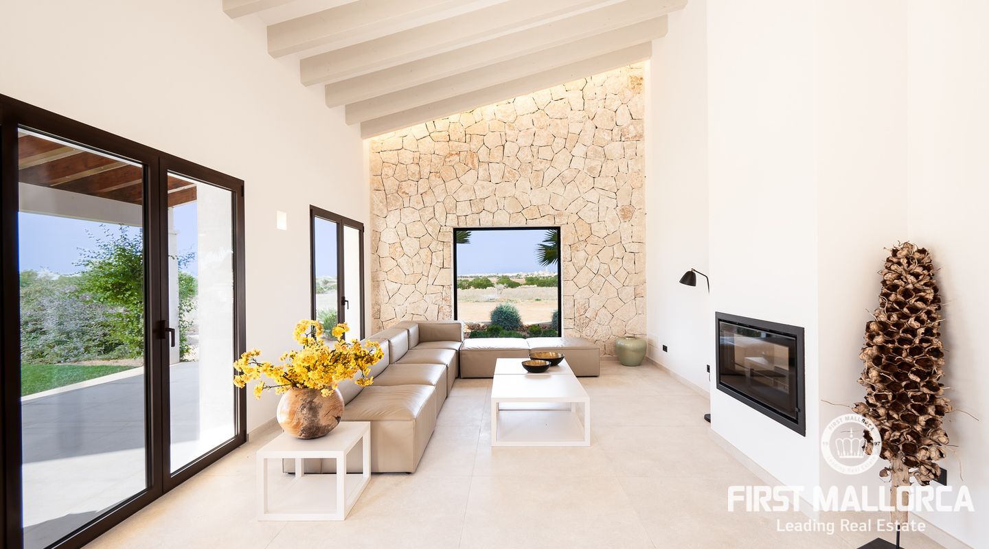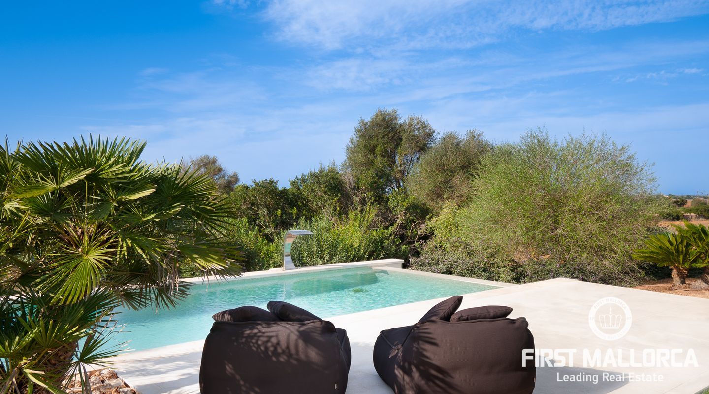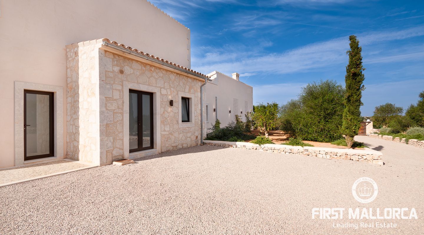 This modern finca with pool is situate on a 16,550 m² plot in a quiet location with a beautiful view of Ses Salines. The living/usable area is approx. 260 m² and is distributed over two levels. The ground floor consists of a large, open living/dining area with fireplace and integrated, fully equipped kitchen with cooking island. The terrace in front, which is partly covered, offers a beautiful view of nature and Ses Salines. Furthermore, on the ground floor there are two bedrooms with en-suite shower rooms, a guest toilet and the technical room. The upper floor has a master bedroom with en suite bathroom (shower and separate bathtub) and a small terrace with a view of nature. The garden has been laid out in a Mediterranean style and is automatically irrigated. The pool with waterfall is 12 x 4 metres and is treated with salt. A pool heating is being prepared. A covered barbecue is being built on the pool terrace. Built to the highness's standard using the best materials in combination with traditional Mallorcan elements. Other features include marble floors, underfloor heating, air conditioning in all bedrooms, Sonos music system, alarm system and many more details.
