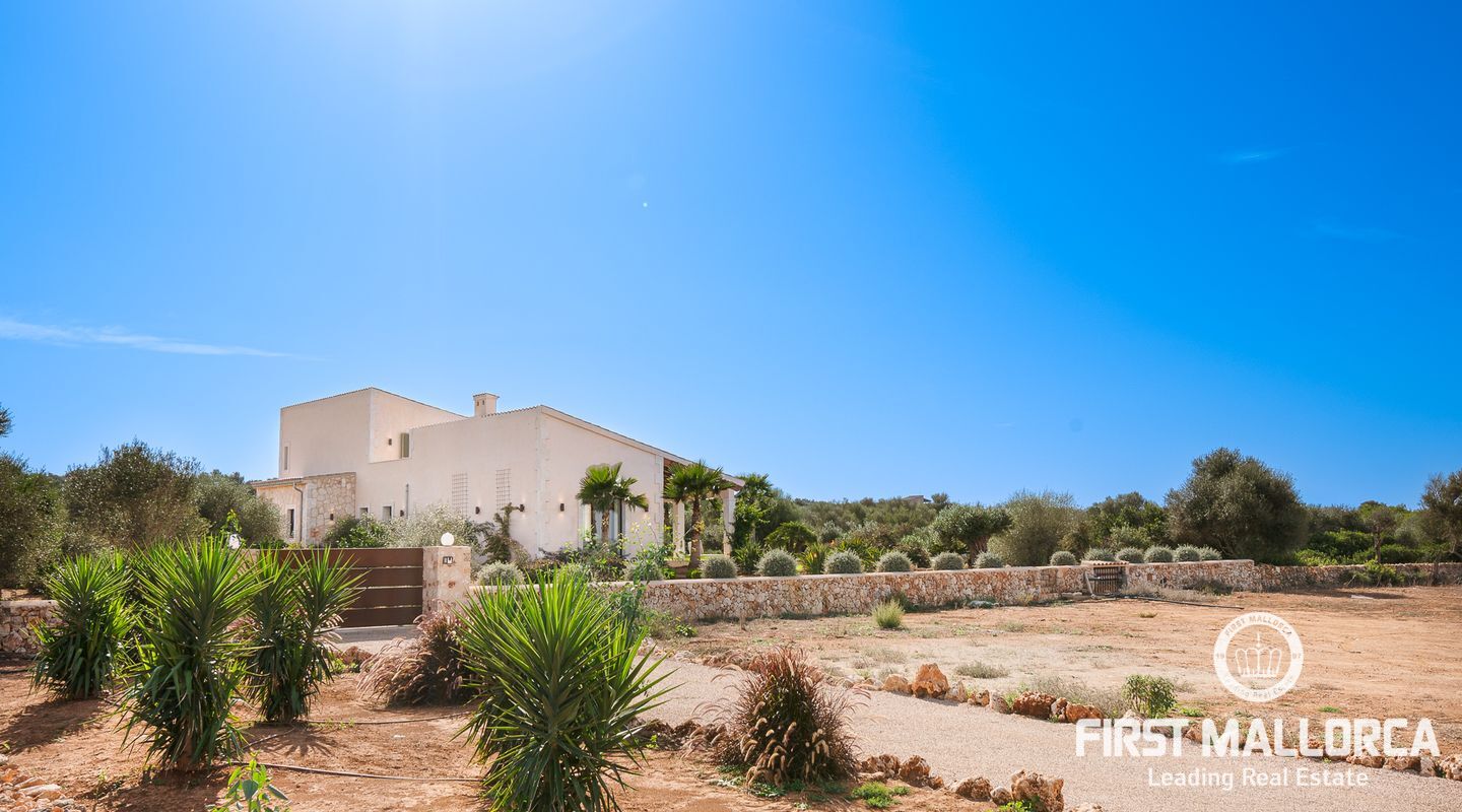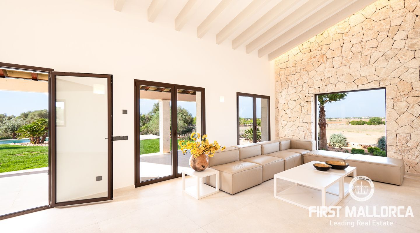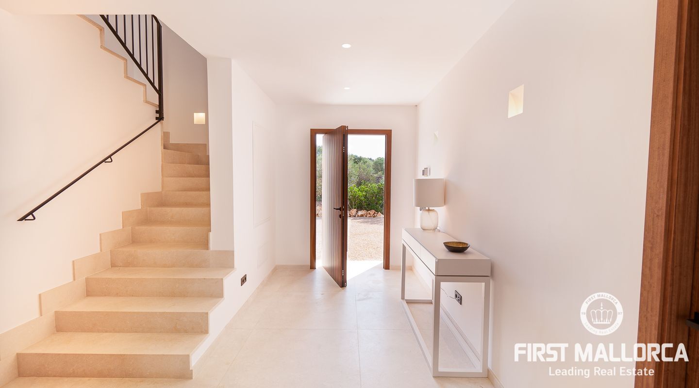 This modern finca with pool is situate on a 16,550 m² plot in a quiet location with a beautiful view of Ses Salines. The living/usable area is approx. 260 m² and is distributed over two levels. The ground floor consists of a large, open living/dining area with fireplace and integrated, fully equipped kitchen with cooking island. The terrace in front, which is partly covered, offers a beautiful view of nature and Ses Salines. Furthermore, on the ground floor there are two bedrooms with en-suite shower rooms, a guest toilet and the technical room. The upper floor has a master bedroom with en suite bathroom (shower and separate bathtub) and a small terrace with a view of nature. The garden has been laid out in a Mediterranean style and is automatically irrigated. The pool with waterfall is 12 x 4 metres and is treated with salt. A pool heating is being prepared. A covered barbecue is being built on the pool terrace. Built to the highness's standard using the best materials in combination with traditional Mallorcan elements. Other features include marble floors, underfloor heating, air conditioning in all bedrooms, Sonos music system, alarm system and many more details.