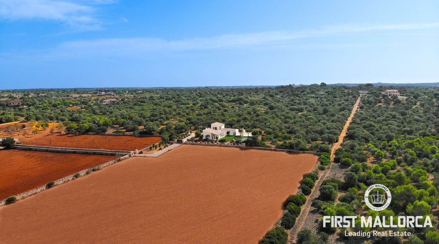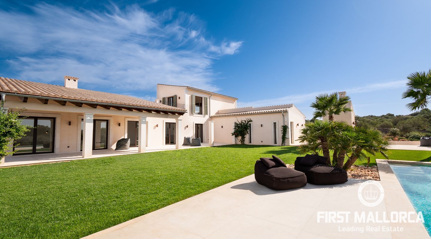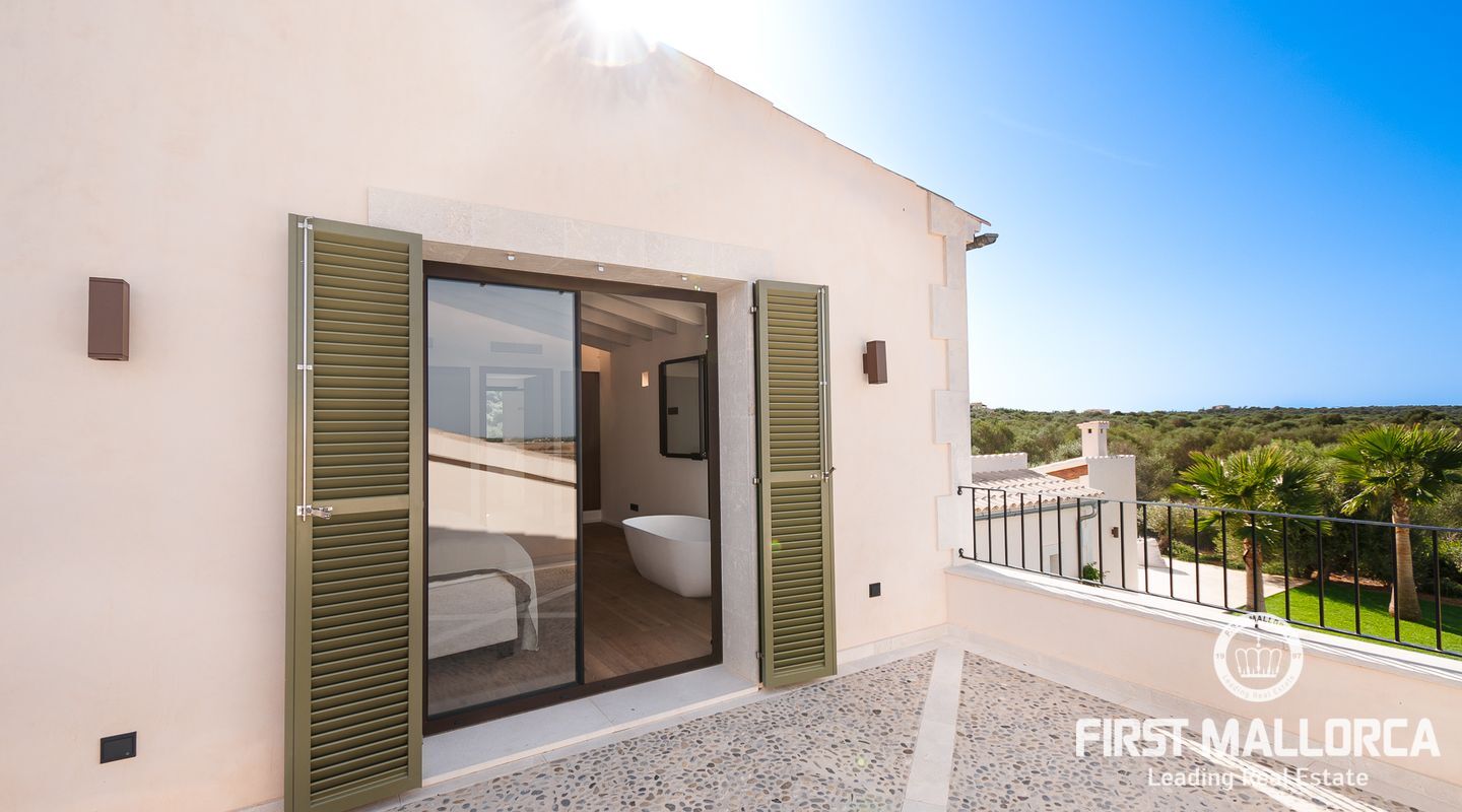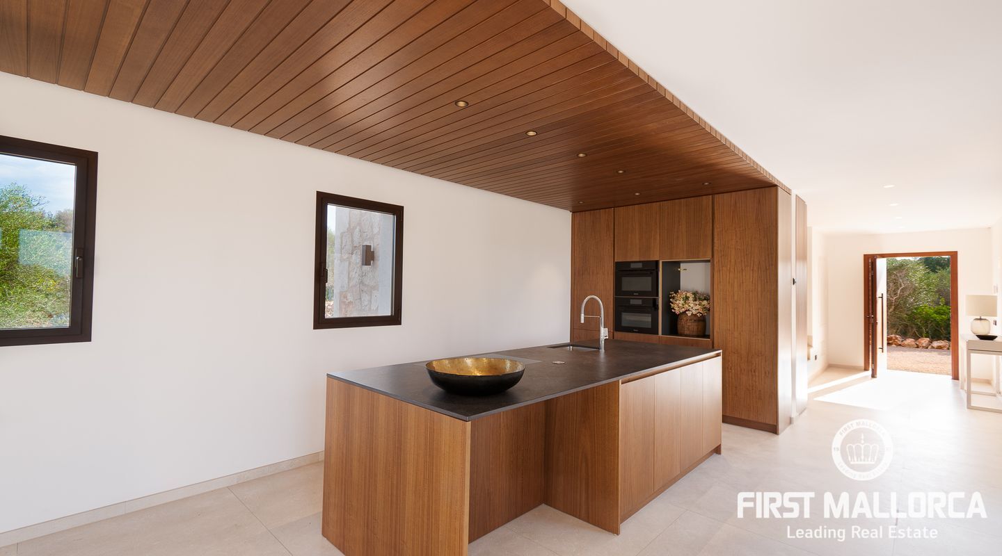 This modern finca with pool is situate on a 16,550 m² plot in a quiet location with a beautiful view of Ses Salines. The living/usable area is approx. 260 m² and is distributed over two levels. The ground floor consists of a large, open living/dining area with fireplace and integrated, fully equipped kitchen with cooking island. The terrace in front, which is partly covered, offers a beautiful view of nature and Ses Salines. Furthermore, on the ground floor there are two bedrooms with en-suite shower rooms, a guest toilet and the technical room. The upper floor has a master bedroom with en suite bathroom (shower and separate bathtub) and a small terrace with a view of nature. The garden has been laid out in a Mediterranean style and is automatically irrigated. The pool with waterfall is 12 x 4 metres and is treated with salt. A pool heating is being prepared. A covered barbecue is being built on the pool terrace. Built to the highness's standard using the best materials in combination with traditional Mallorcan elements. Other features include marble floors, underfloor heating, air conditioning in all bedrooms, Sonos music system, alarm system and many more details.