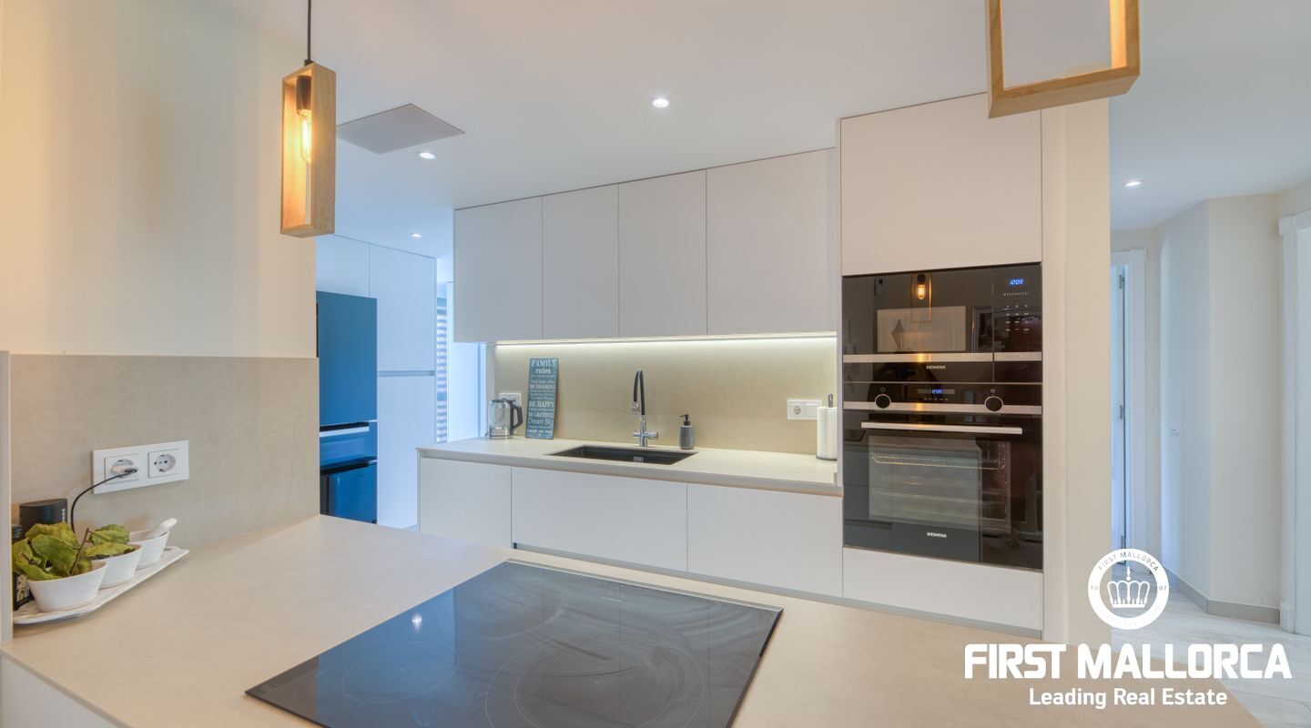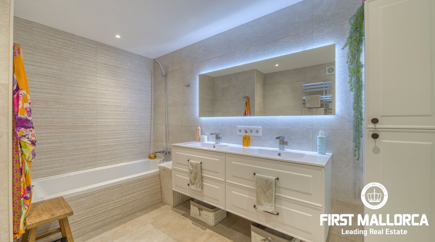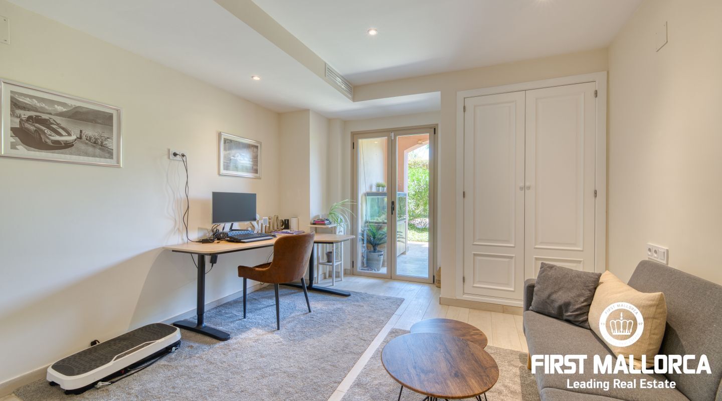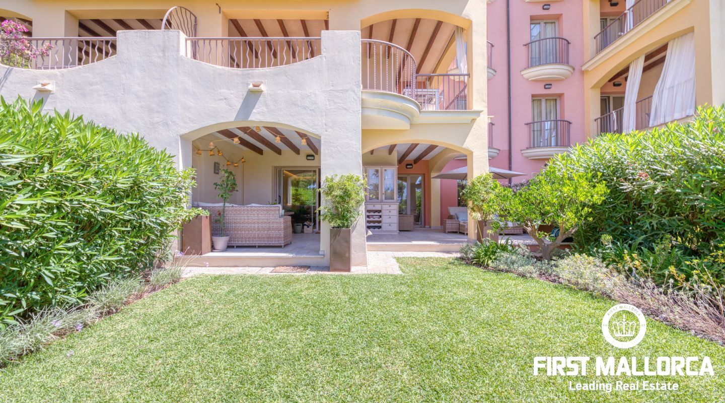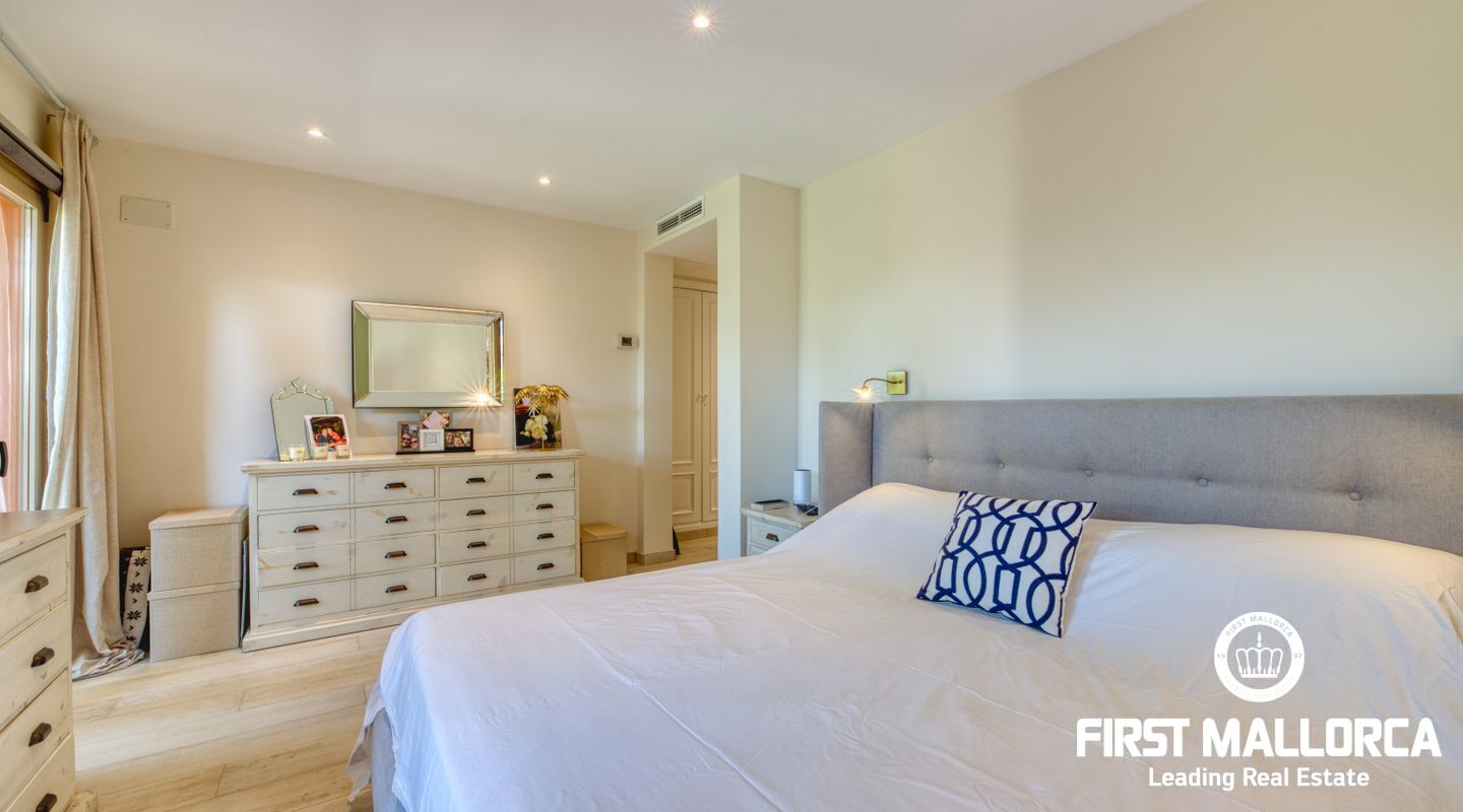 This elegant ground floor apartment is located in one of the most exclusive resorts in Nova Santa Ponsa, close to the golf courses and the magnificent Port Adriano. The propertyhas an elegant living room with fireplace and access to the covered terrace and, to your left, the new open plan kitchen. There are two elegant bedrooms, both with access to the terrace and one with an en-suite bathroom. Another large bathroom completes this property and both have underfloor heating. The constructed area is approximately 130m2, with two terraces of 29m2 and 19m2, and there is also the green and well-kept garden of 71m2, from where you can reach the community pool in just a few steps. The price also includes an underground parking and a large storage room.