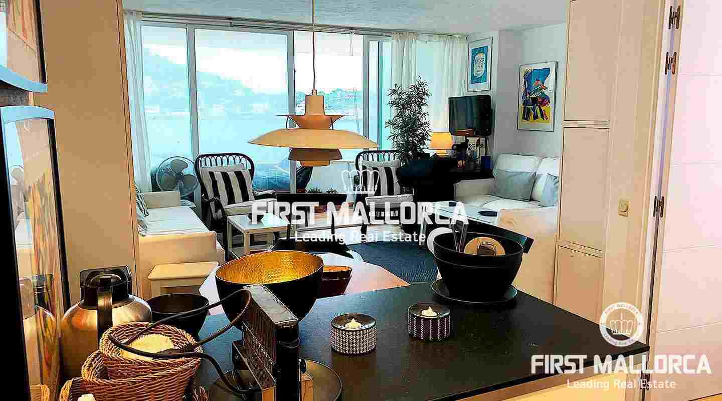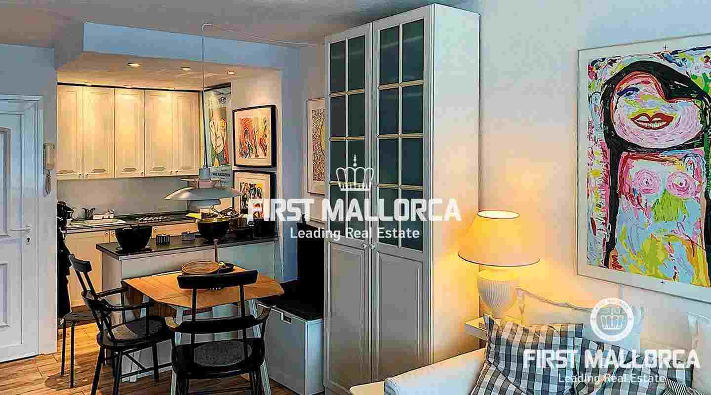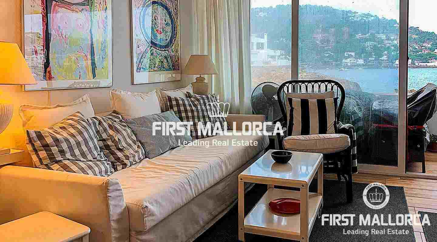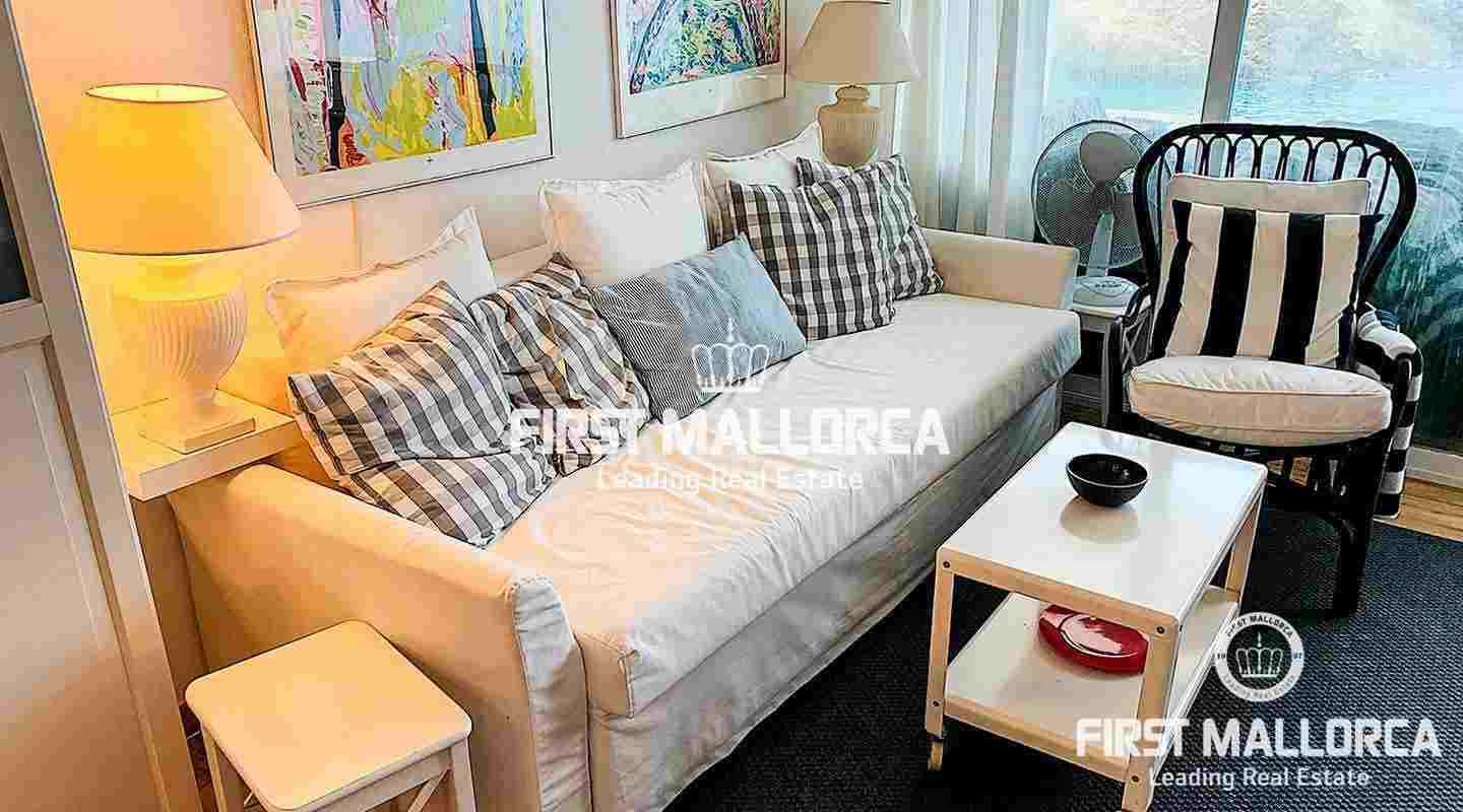 This studio apartment is located at the port of Port Andratx, in a community with direct access to the beach and sea. The living area is 40 m² including 6 m² covered terrace area. The apartment has a fitted kitchen, a ceramic hob with two plates and a kitchen island. The living area comprises 3 sofas, one of which can be converted into a bed. In the bathroom there is a shower and a washing machine. The whole apartment has been recently renovated. The advantage is the direct access to the beach, making it an excellent vacation home.