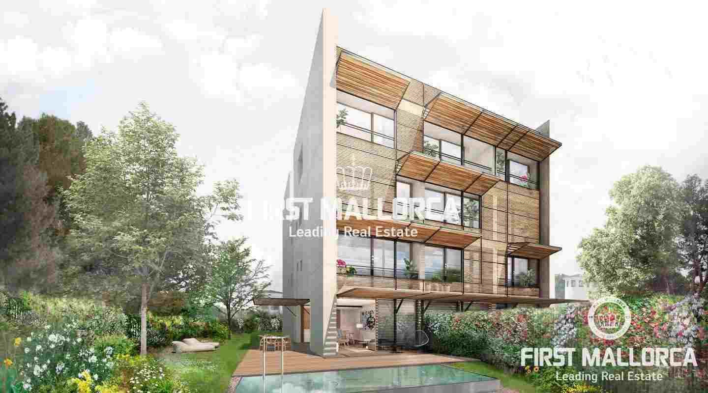 This new residential project with a total of 12 individual apartments, each with its own pool, fits harmoniously into the surrounding landscape and offers you a completely new living experience. The architecture impresses with its unusual design and an ecologically high value of respect for the environment. The 10 of the 12 units between 101 m² and 227 m² living space partly have their own garden, between 21 m² and 272 m², or a terrace, between 20 m² and 101 m². Parking spaces are available for each apartment in the garage belonging to the project or under covered outdoor spaces.