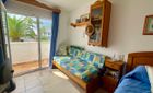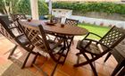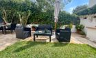 The ground floor features a spacious living and dining area with seamless access to the garden, a large bedroom also opening onto the outdoor space, a big bathroom with shower, and a fully equipped separate kitchen.