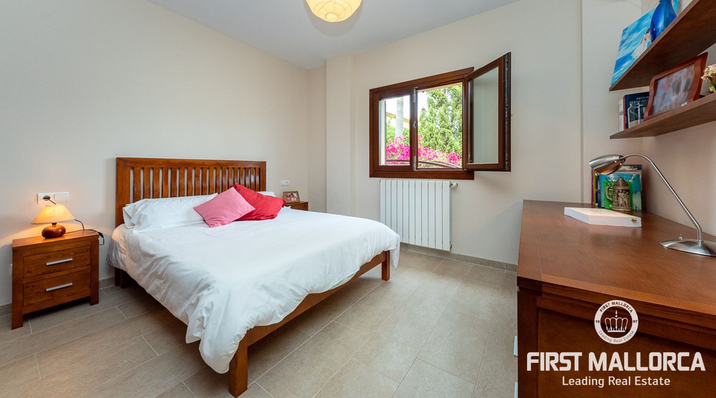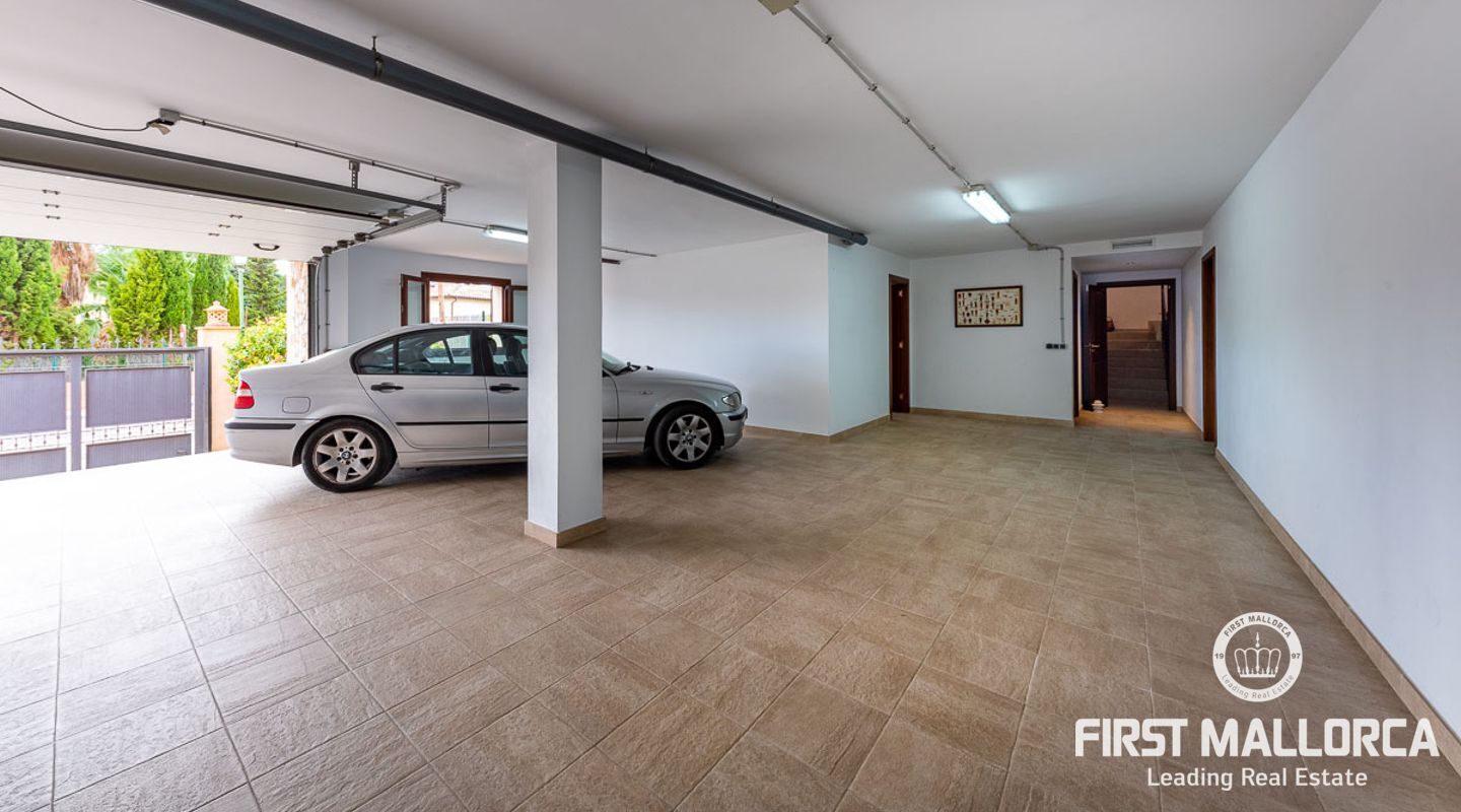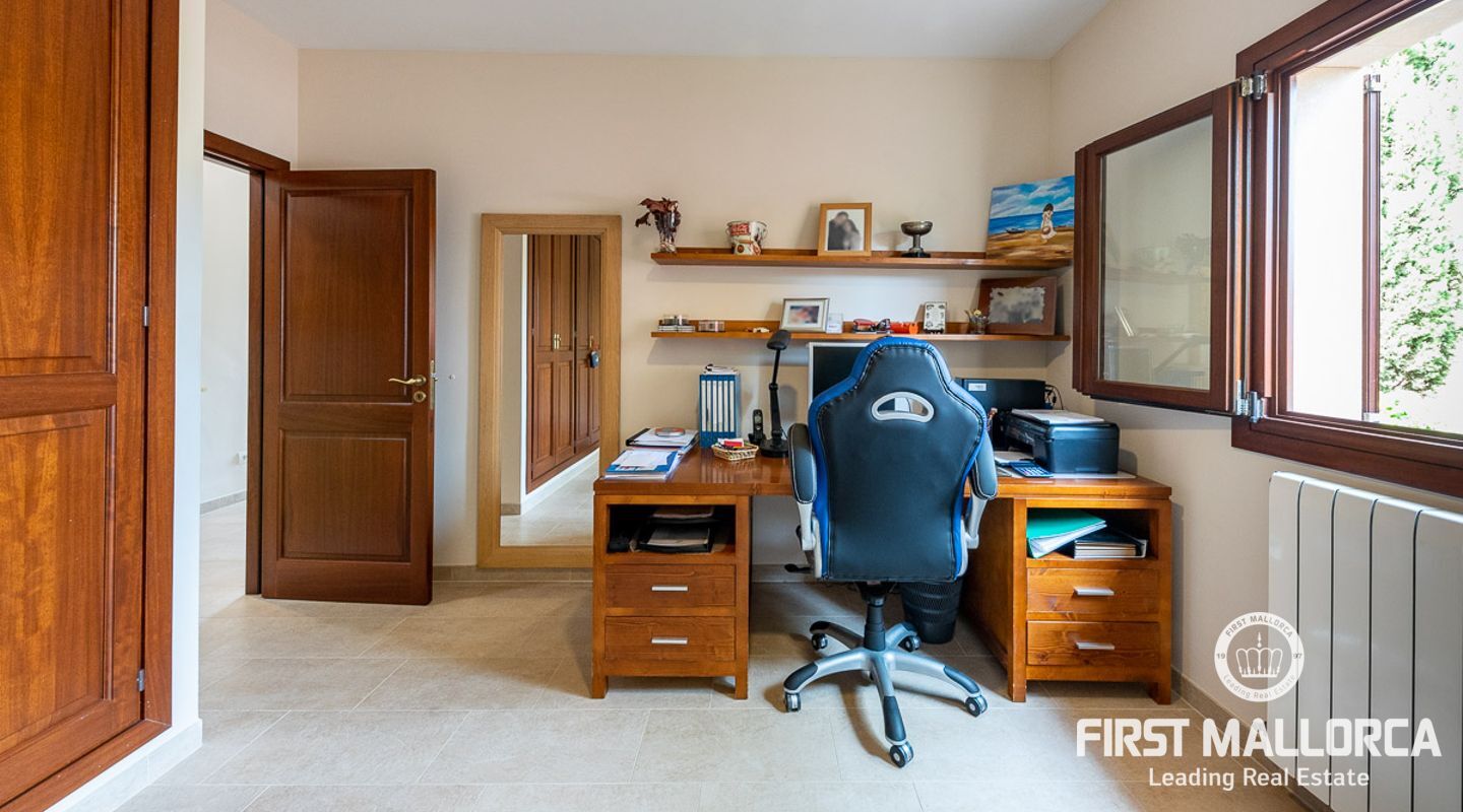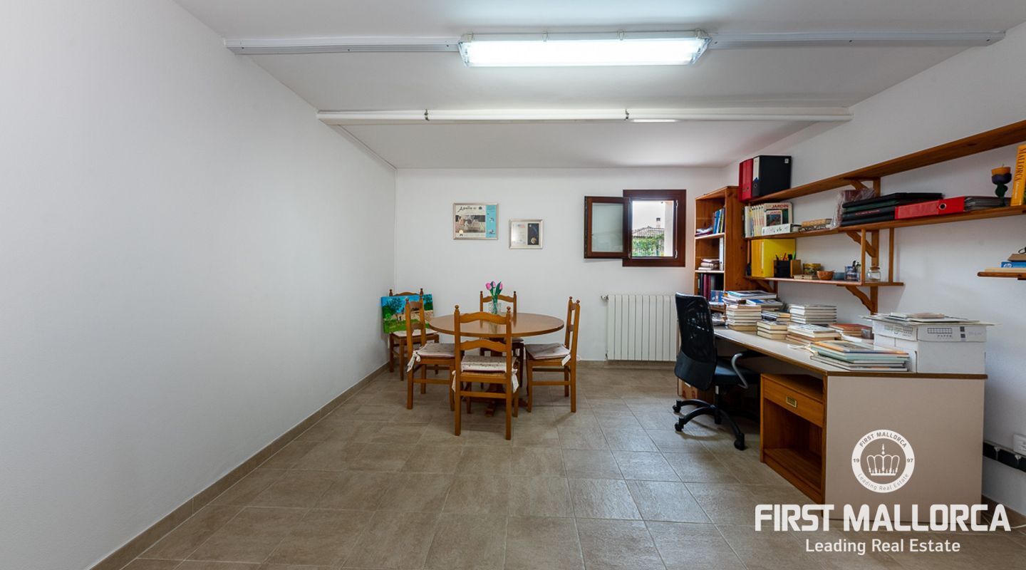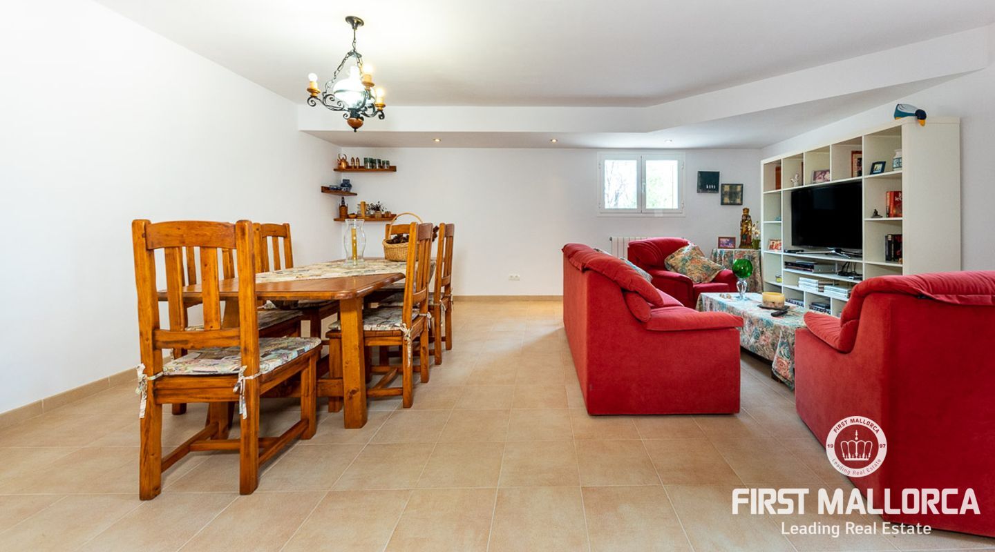 This attractive country house is situated in a peaceful, yet central part of the dynamic village of Calviá which is nestled between the mountains and the sea along the sought-after southwest coast of Mallorca. The property enjoys a very comfortable and attractive layout where the living room, dining room and spacious kitchen together with the three double bedrooms, whereof two have en-suite bathrooms, are all situated on one level with direct access to the swimming pool and surrounding terrace as well as a barrier-free access from the street. On the lower garden level one finds a spacious one bedroom guest apartment with separate living room and en-suite bathroom as well as an office and a large store room. The spacious garage offers 3 parkings and has an easy access. The natural gathering point is on the pool terrace where there is a big porch with space for a large dining table and with a barbecue, adapted for preparingbig family meals. The front garden has a pond and some fruit trees. Additional features of this fine home include hot & cold air conditioning, central oil heating with radiators, high ceilings with exposed wodden beams, fully equipped kitchen with high-end utilities and a laundry room. The Calvià village is very popular both permanent residents and holiday home owners thanks to its lively atmosphere with a good selection of restaurants, cafeterias and shops. The beaches of Palmanova and Portals are less than a 10-minute drive away and so if the marina of Puerto Portals. The city centre of Palma is reached in just over 15 minutes and the international airport in 20 minutes.