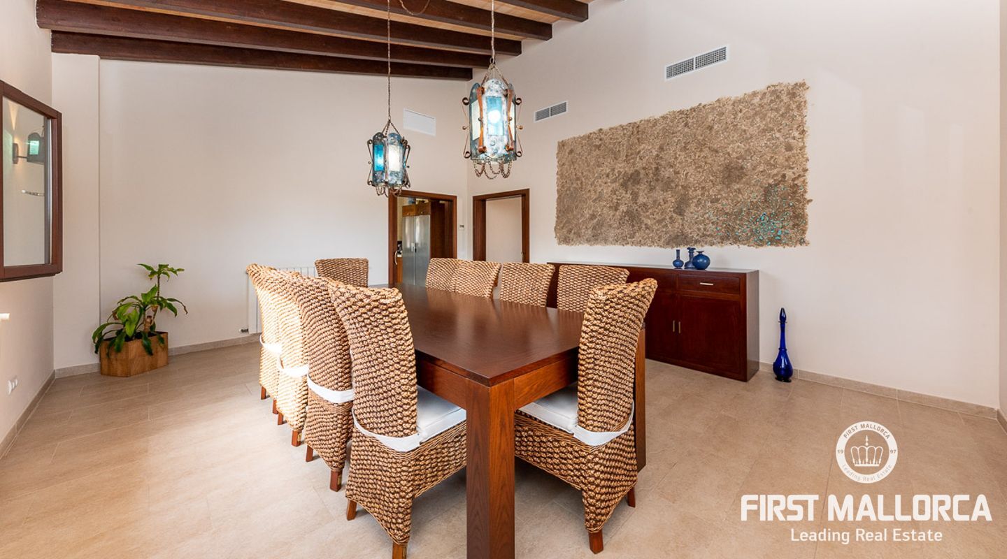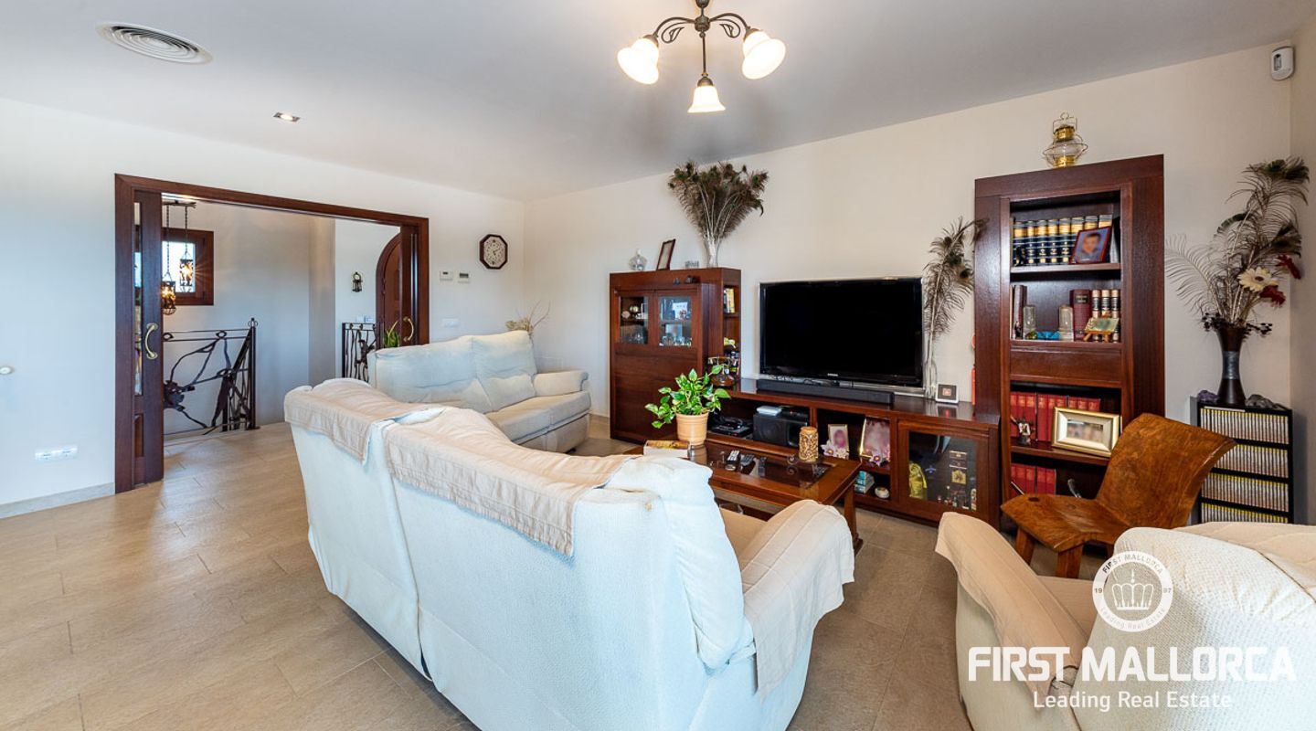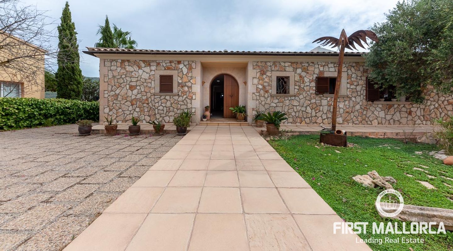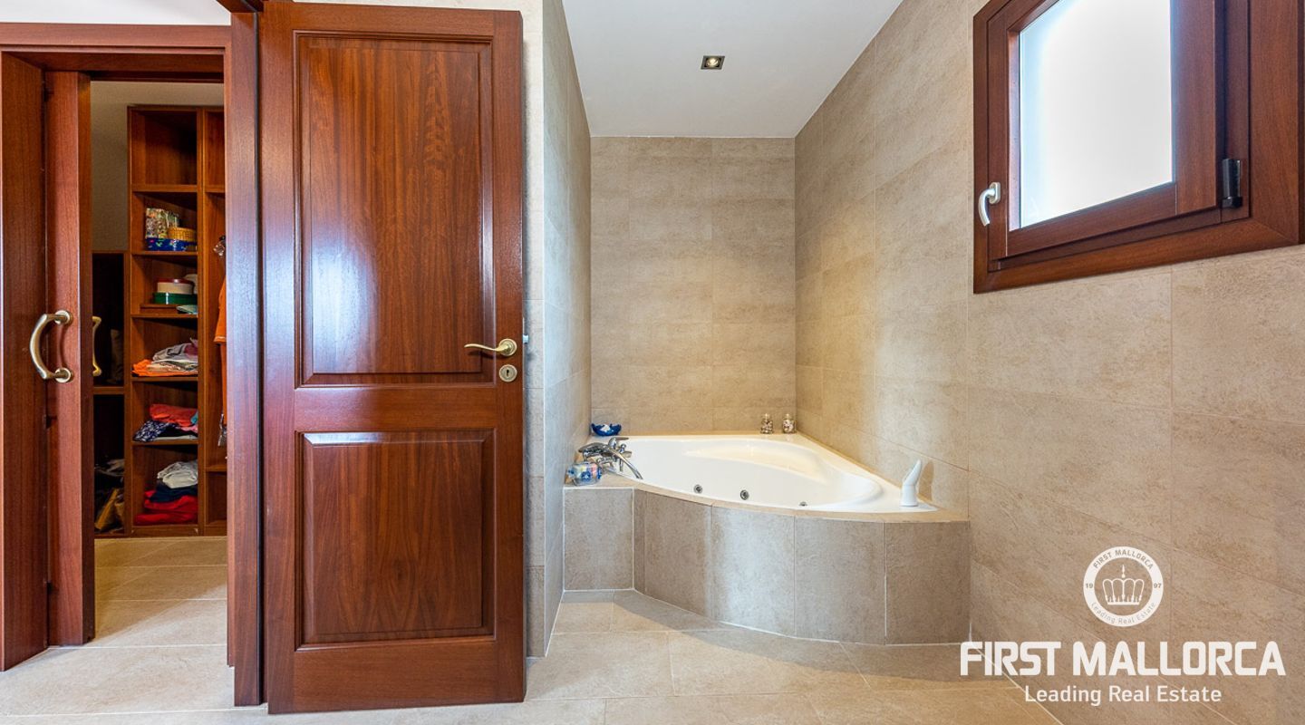 This attractive country house is situated in a peaceful, yet central part of the dynamic village of Calviá which is nestled between the mountains and the sea along the sought-after southwest coast of Mallorca. The property enjoys a very comfortable and attractive layout where the living room, dining room and spacious kitchen together with the three double bedrooms, whereof two have en-suite bathrooms, are all situated on one level with direct access to the swimming pool and surrounding terrace as well as a barrier-free access from the street. On the lower garden level one finds a spacious one bedroom guest apartment with separate living room and en-suite bathroom as well as an office and a large store room. The spacious garage offers 3 parkings and has an easy access. The natural gathering point is on the pool terrace where there is a big porch with space for a large dining table and with a barbecue, adapted for preparingbig family meals. The front garden has a pond and some fruit trees. Additional features of this fine home include hot & cold air conditioning, central oil heating with radiators, high ceilings with exposed wodden beams, fully equipped kitchen with high-end utilities and a laundry room. The Calvià village is very popular both permanent residents and holiday home owners thanks to its lively atmosphere with a good selection of restaurants, cafeterias and shops. The beaches of Palmanova and Portals are less than a 10-minute drive away and so if the marina of Puerto Portals. The city centre of Palma is reached in just over 15 minutes and the international airport in 20 minutes.
