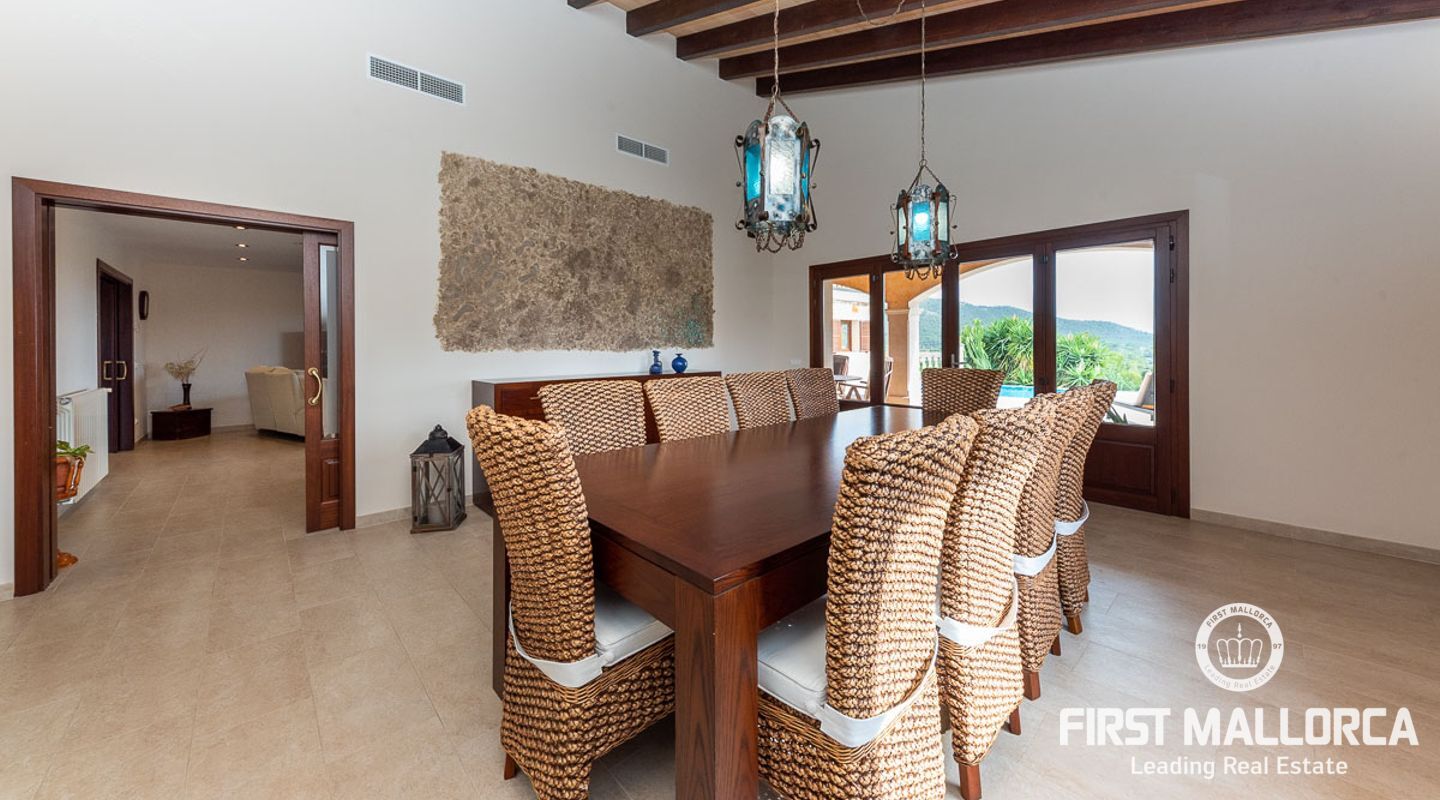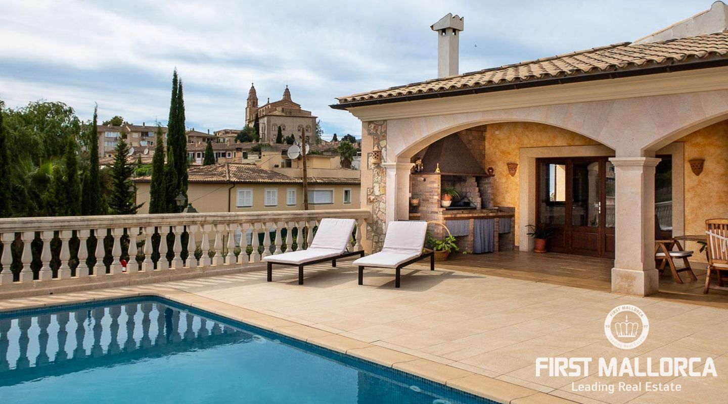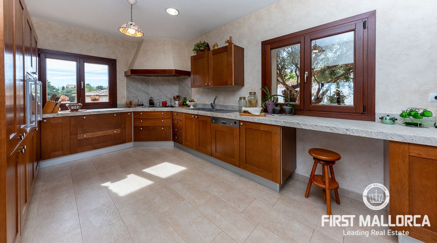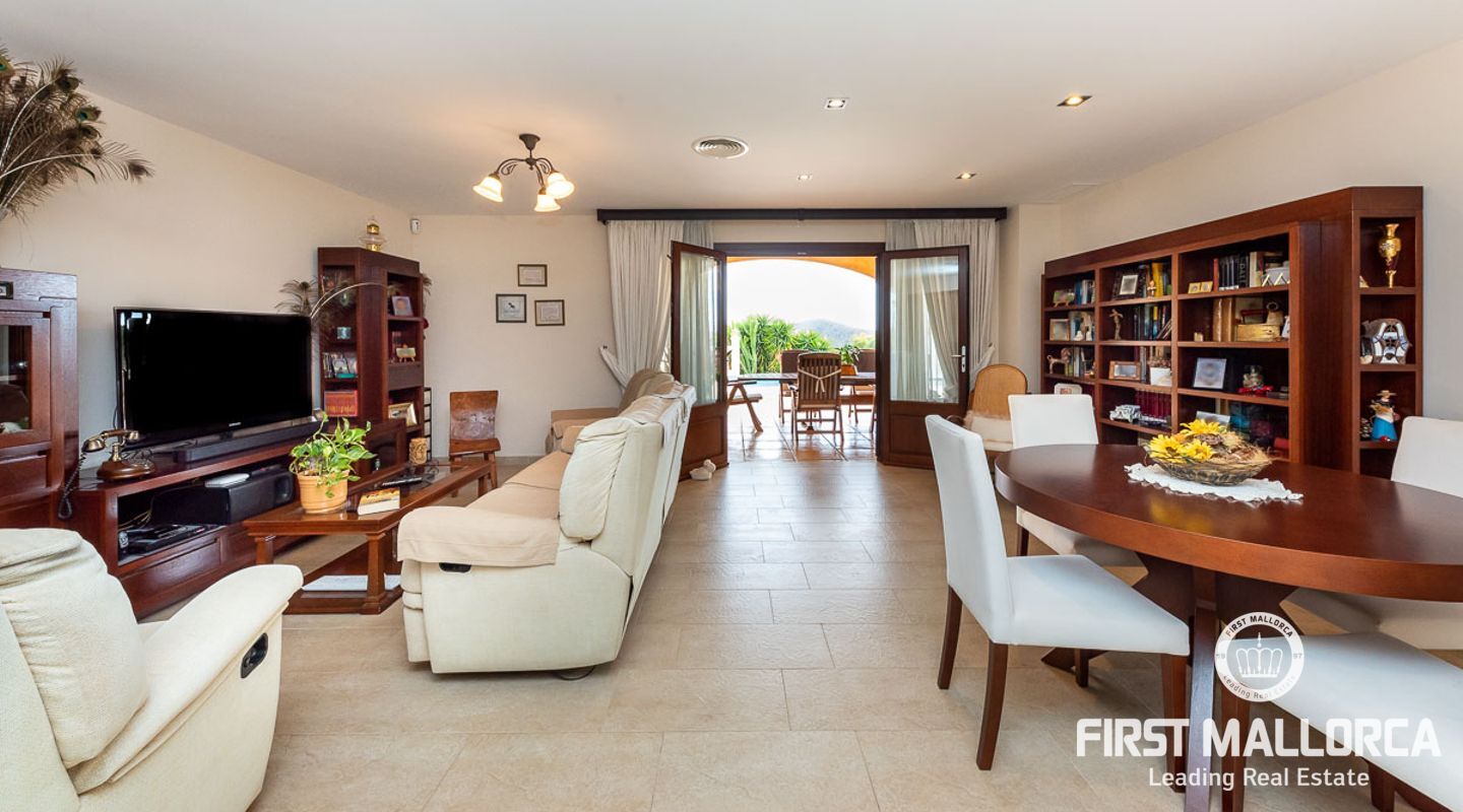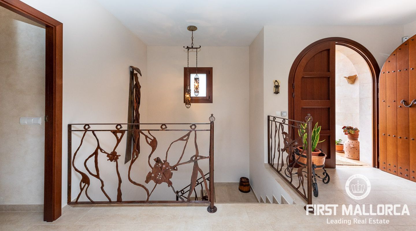 This attractive country house is situated in a peaceful, yet central part of the dynamic village of Calviá which is nestled between the mountains and the sea along the sought-after southwest coast of Mallorca. The property enjoys a very comfortable and attractive layout where the living room, dining room and spacious kitchen together with the three double bedrooms, whereof two have en-suite bathrooms, are all situated on one level with direct access to the swimming pool and surrounding terrace as well as a barrier-free access from the street. On the lower garden level one finds a spacious one bedroom guest apartment with separate living room and en-suite bathroom as well as an office and a large store room. The spacious garage offers 3 parkings and has an easy access. The natural gathering point is on the pool terrace where there is a big porch with space for a large dining table and with a barbecue, adapted for preparingbig family meals. The front garden has a pond and some fruit trees. Additional features of this fine home include hot & cold air conditioning, central oil heating with radiators, high ceilings with exposed wodden beams, fully equipped kitchen with high-end utilities and a laundry room. The Calvià village is very popular both permanent residents and holiday home owners thanks to its lively atmosphere with a good selection of restaurants, cafeterias and shops. The beaches of Palmanova and Portals are less than a 10-minute drive away and so if the marina of Puerto Portals. The city centre of Palma is reached in just over 15 minutes and the international airport in 20 minutes.