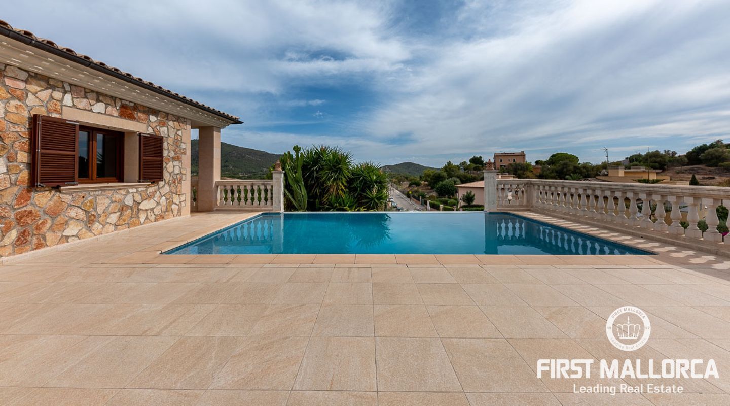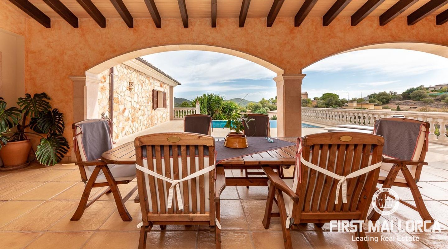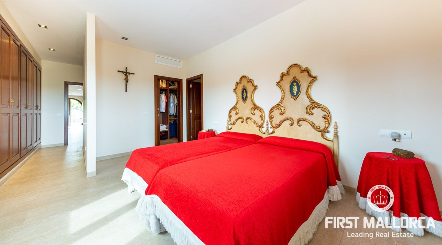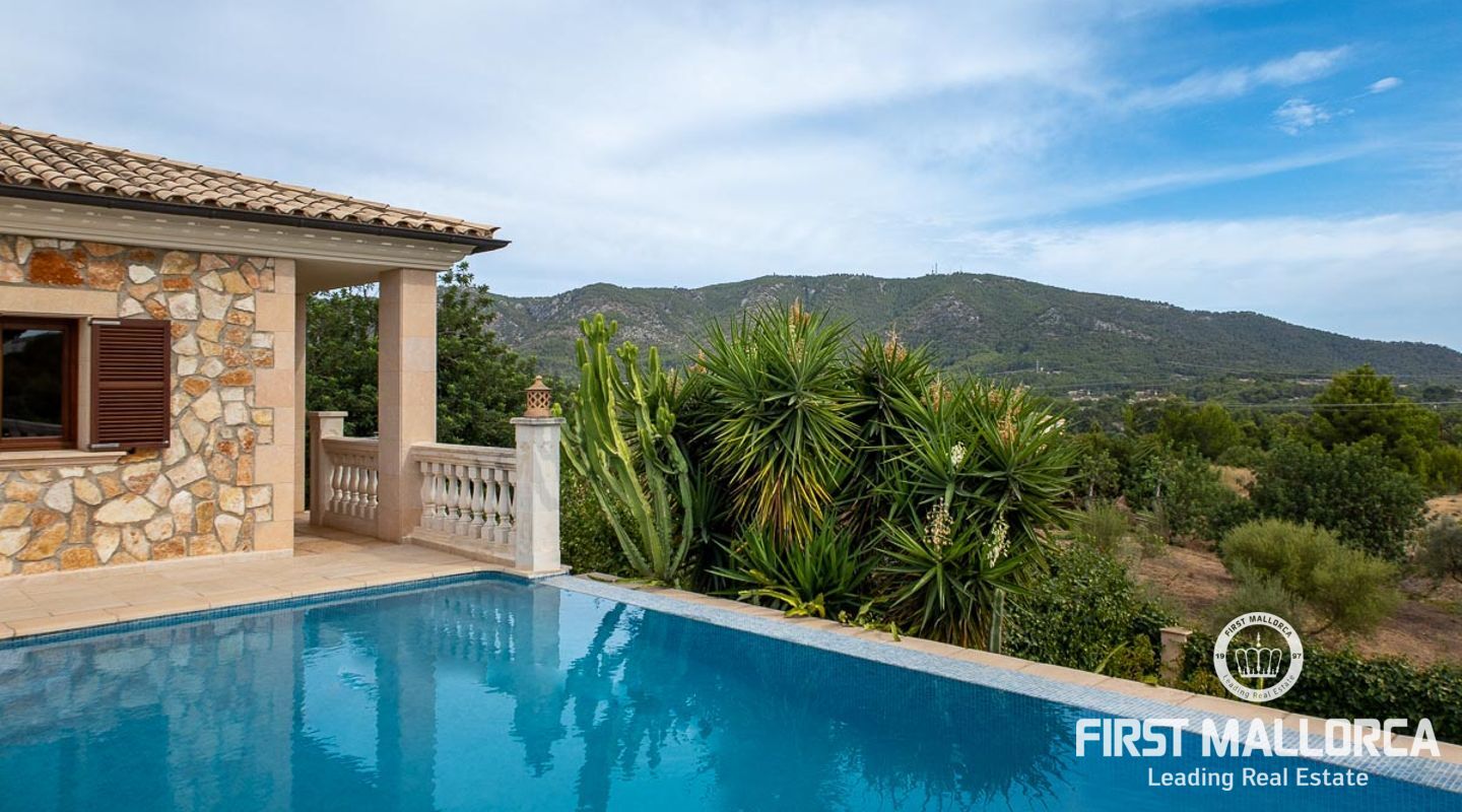 This attractive country house is situated in a peaceful, yet central part of the dynamic village of Calviá which is nestled between the mountains and the sea along the sought-after southwest coast of Mallorca. The property enjoys a very comfortable and attractive layout where the living room, dining room and spacious kitchen together with the three double bedrooms, whereof two have en-suite bathrooms, are all situated on one level with direct access to the swimming pool and surrounding terrace as well as a barrier-free access from the street. On the lower garden level one finds a spacious one bedroom guest apartment with separate living room and en-suite bathroom as well as an office and a large store room. The spacious garage offers 3 parkings and has an easy access. The natural gathering point is on the pool terrace where there is a big porch with space for a large dining table and with a barbecue, adapted for preparingbig family meals. The front garden has a pond and some fruit trees. Additional features of this fine home include hot & cold air conditioning, central oil heating with radiators, high ceilings with exposed wodden beams, fully equipped kitchen with high-end utilities and a laundry room. The Calvià village is very popular both permanent residents and holiday home owners thanks to its lively atmosphere with a good selection of restaurants, cafeterias and shops. The beaches of Palmanova and Portals are less than a 10-minute drive away and so if the marina of Puerto Portals. The city centre of Palma is reached in just over 15 minutes and the international airport in 20 minutes.